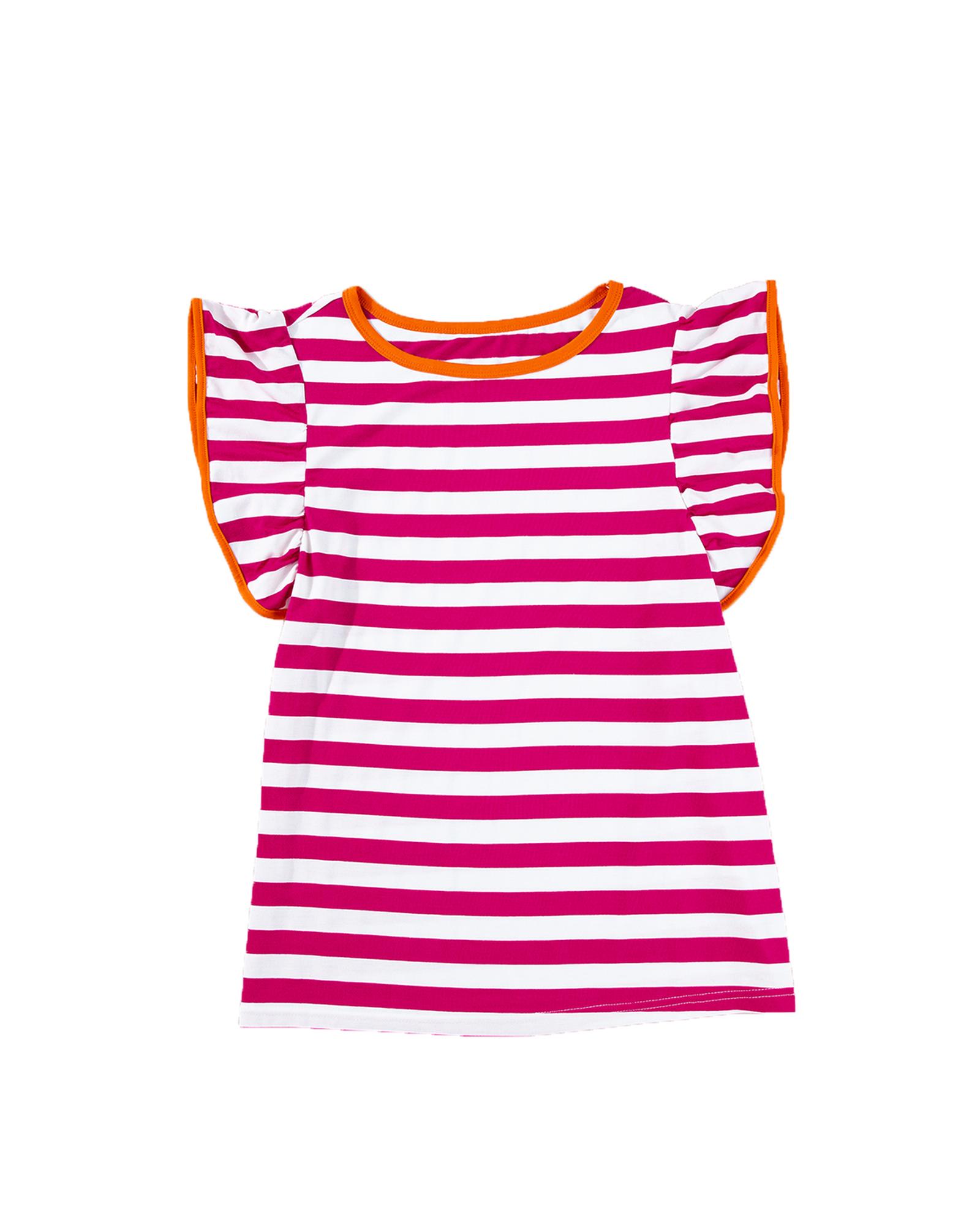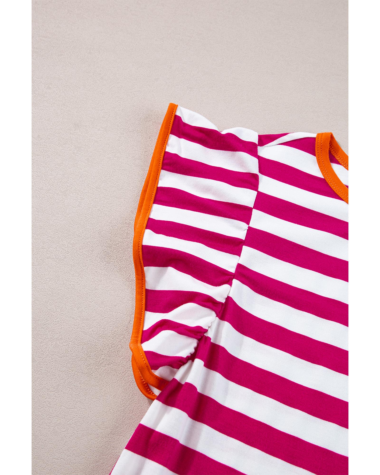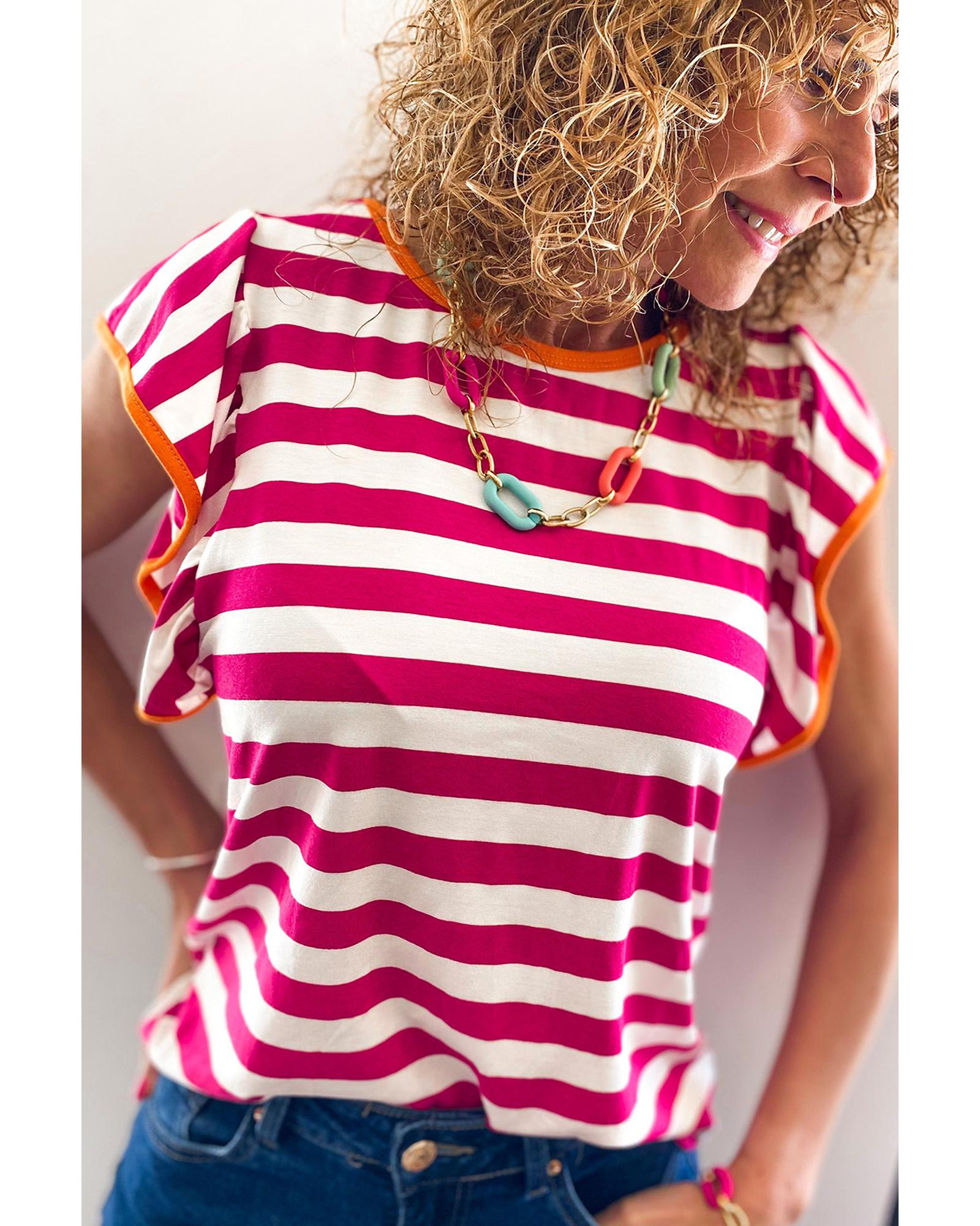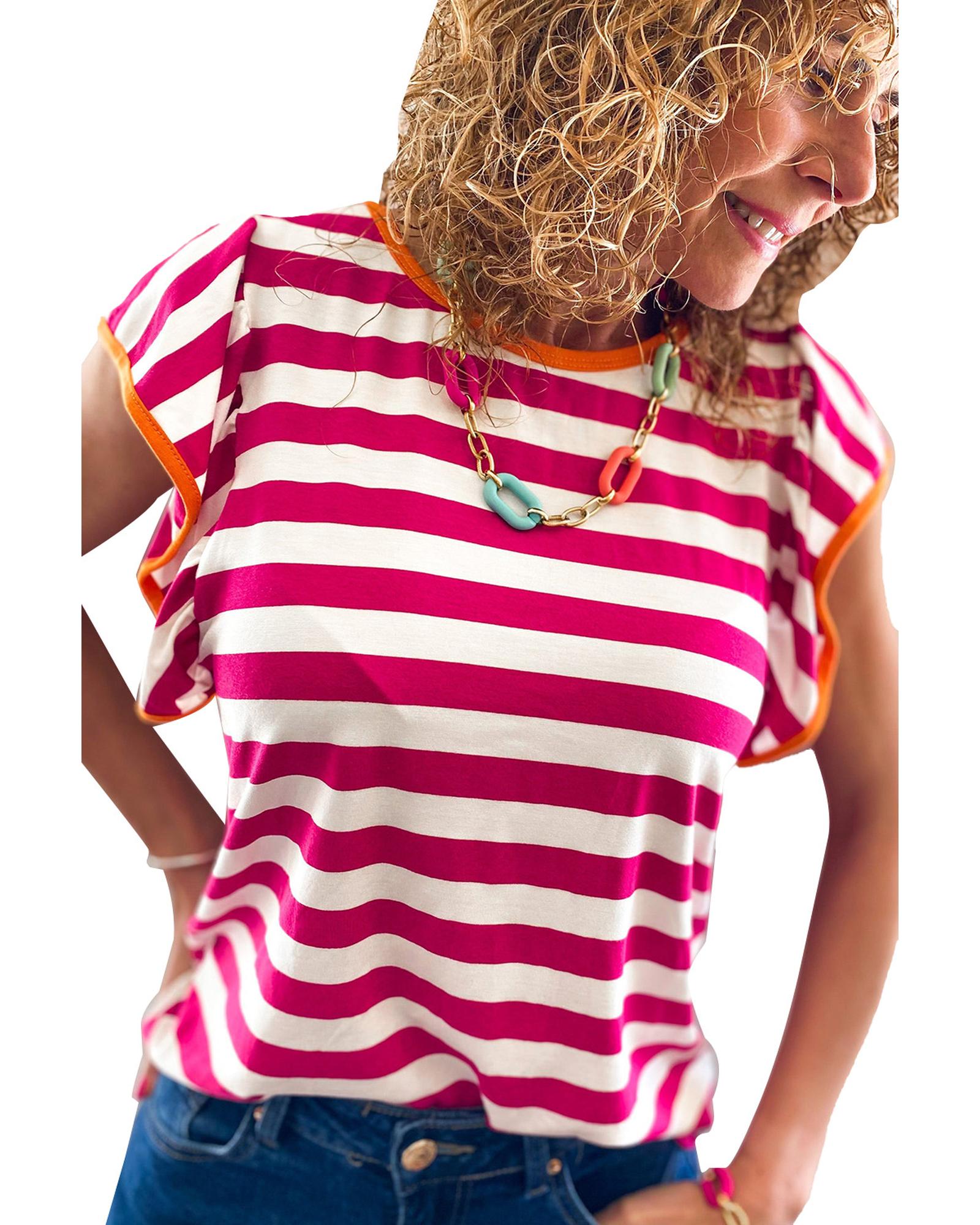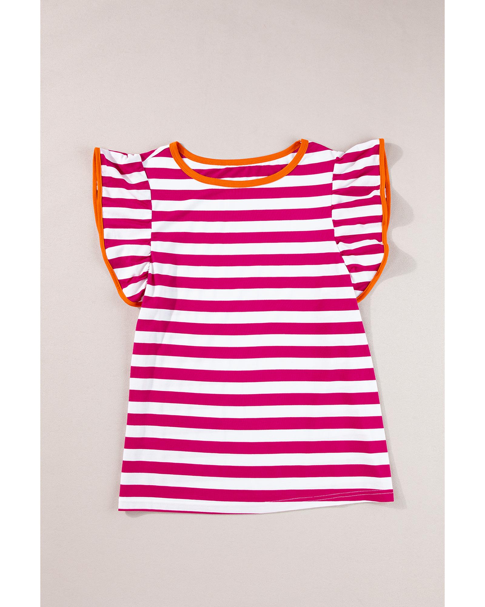 Rose Red Striped Ruffle Sleeve Crew Neck Blouse – S