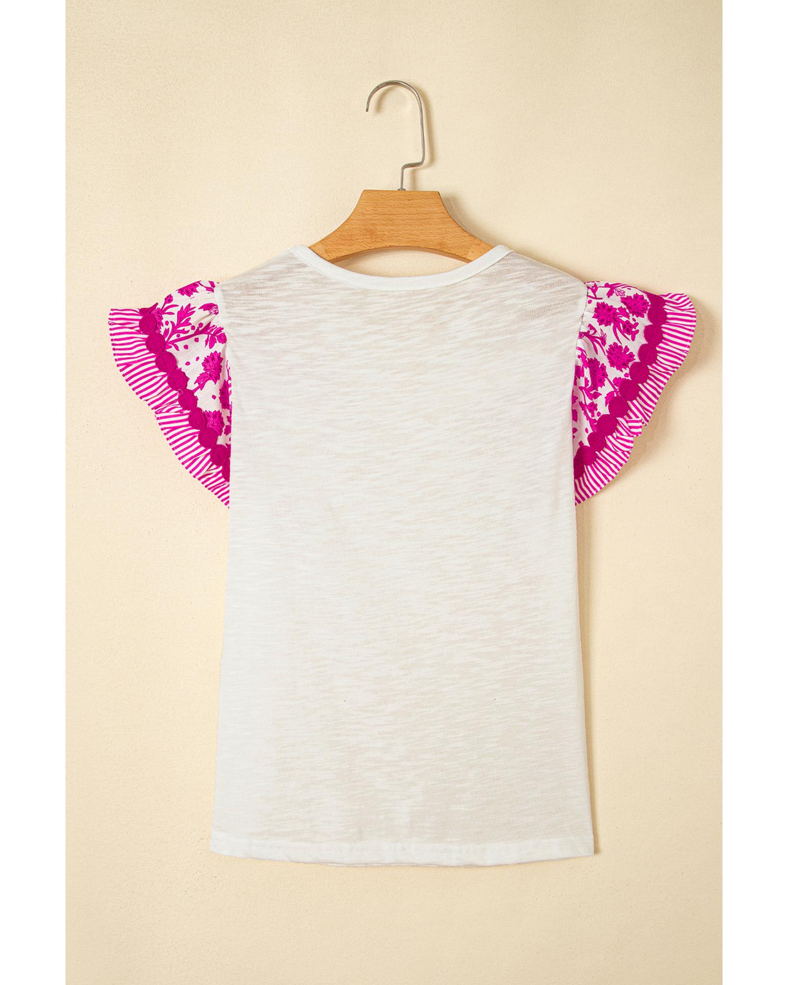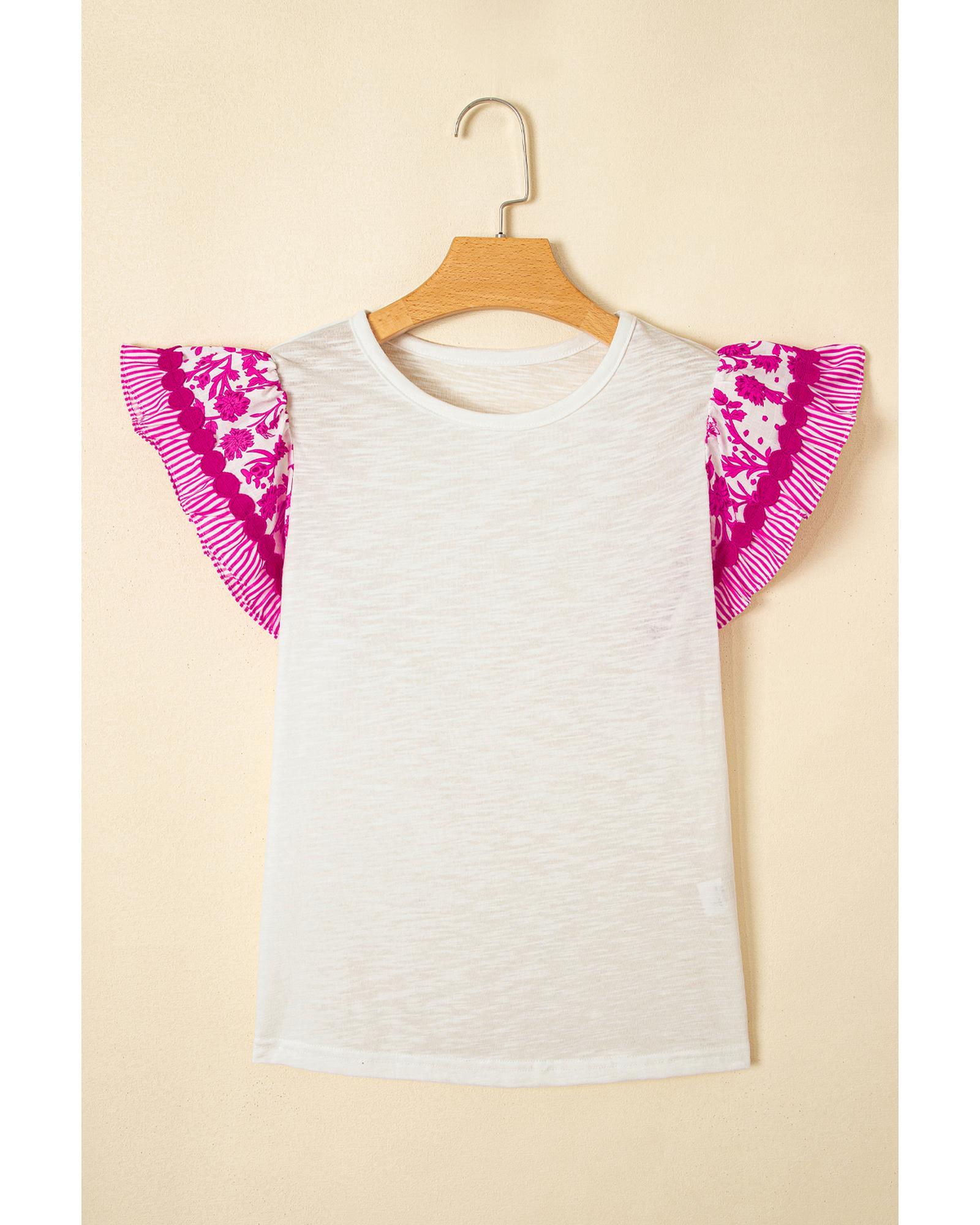 Rose Ricrac Trim Printed Flutter Sleeve Contrast Patchwork Blouse – M