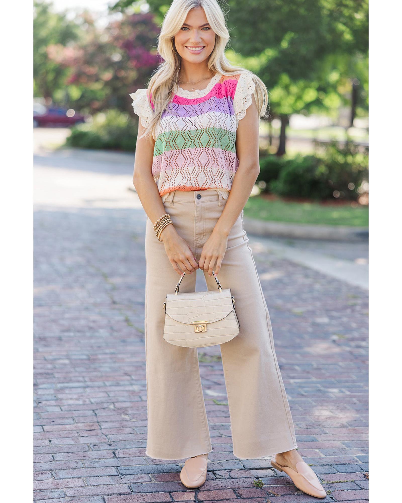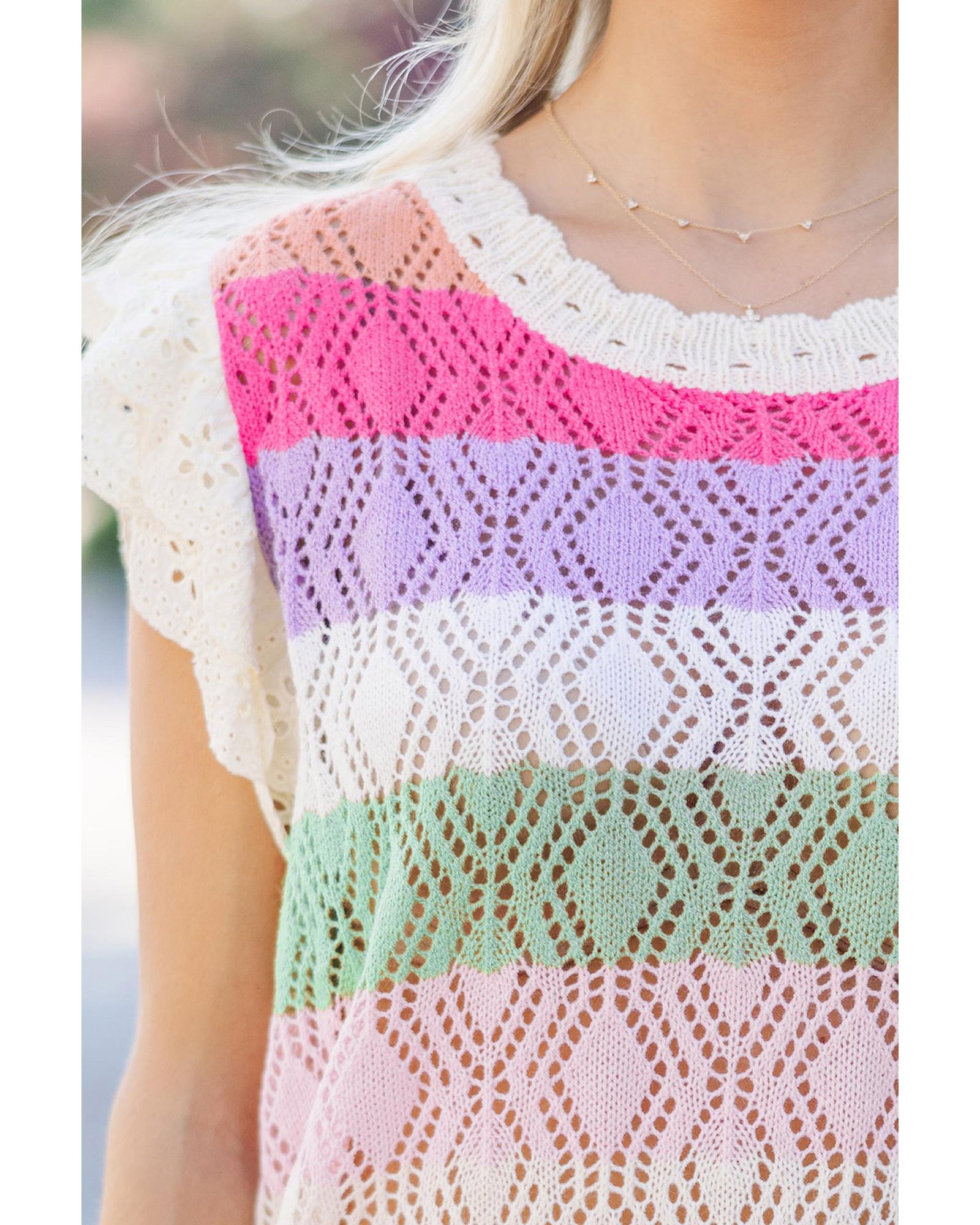 Rose Stripe Colorblock Hollowed Knit Scallop Edge Sweater Vest – S