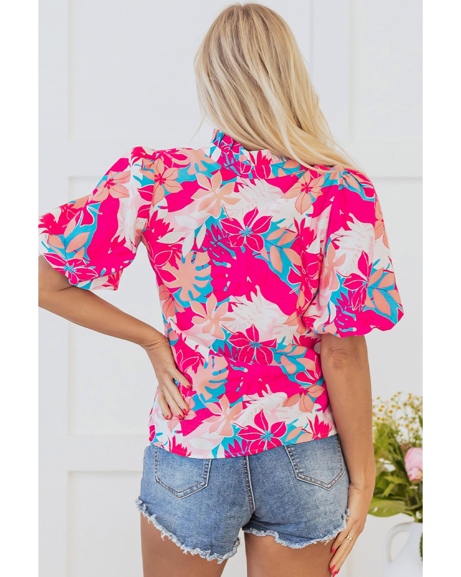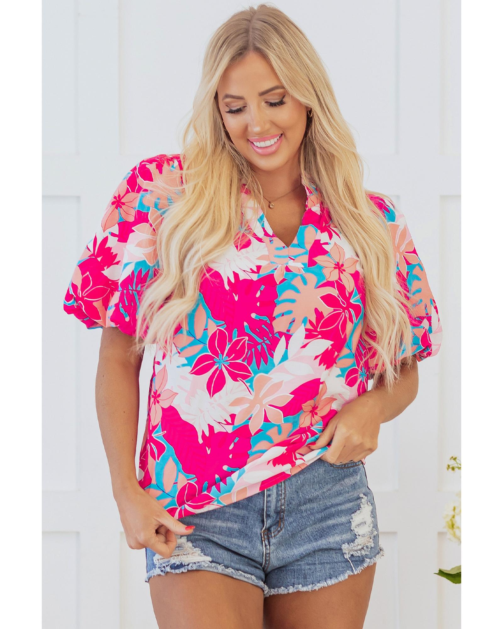 Rose Tropical Plant Printed V Neck Puff Sleeve Blouse – L