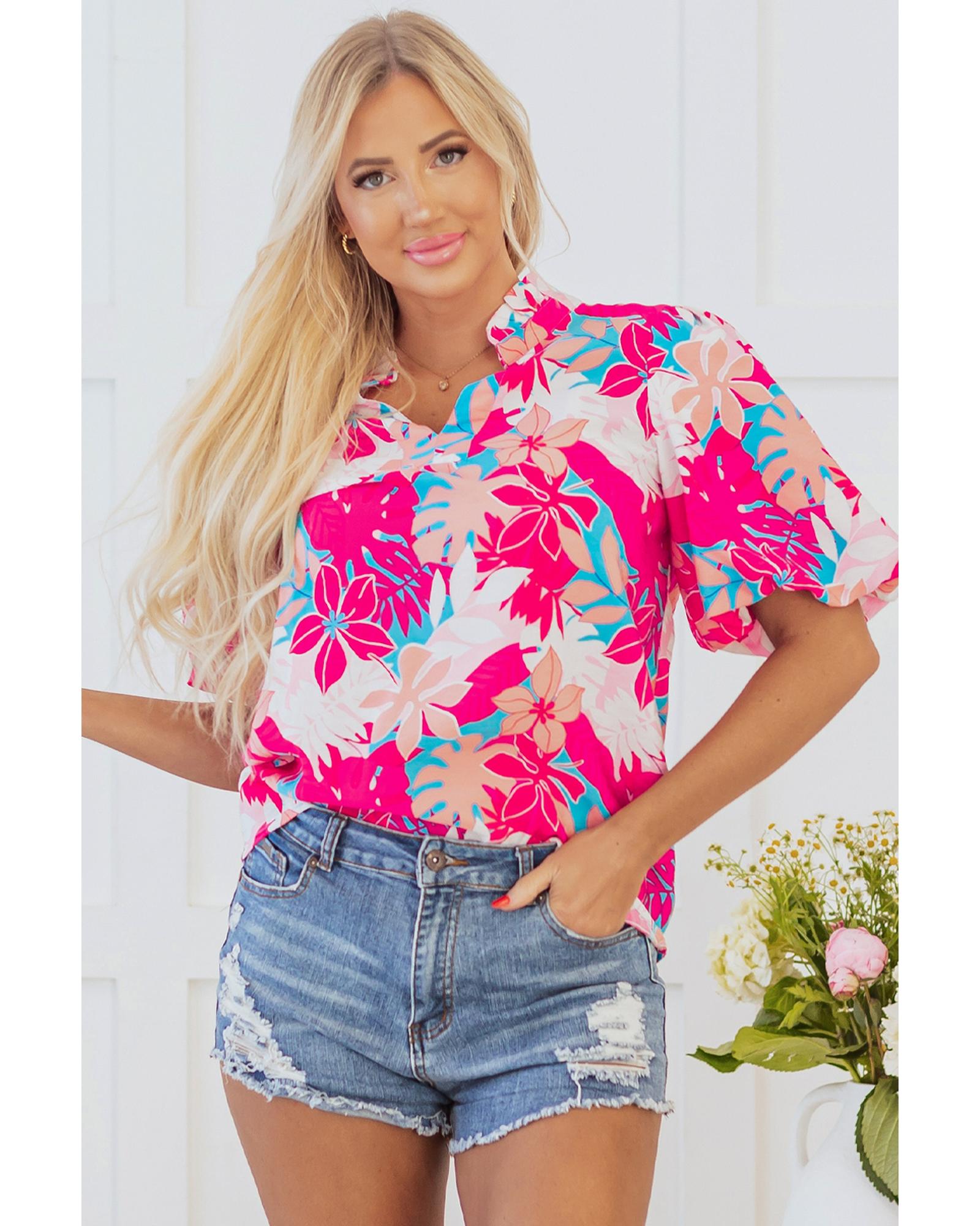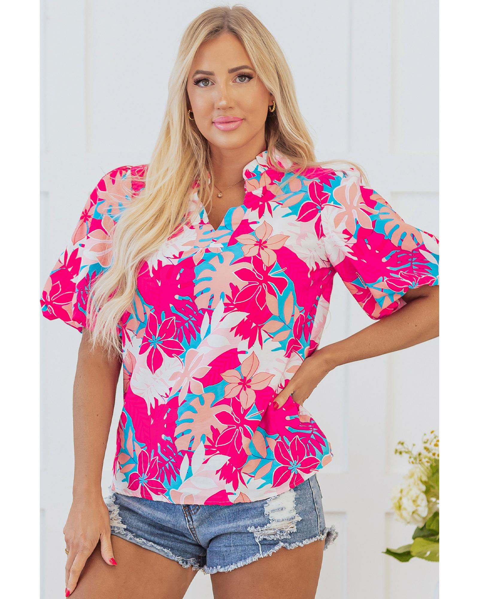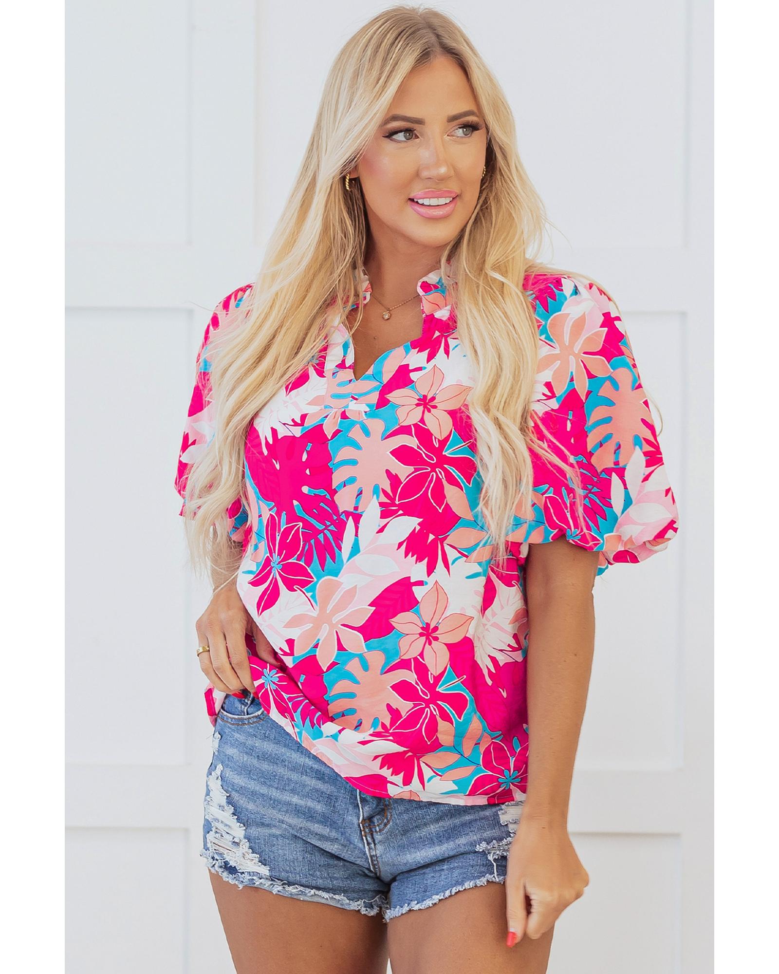 Rose Tropical Plant Printed V Neck Puff Sleeve Blouse – S