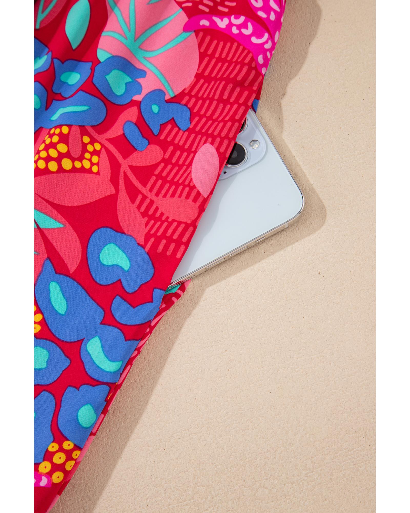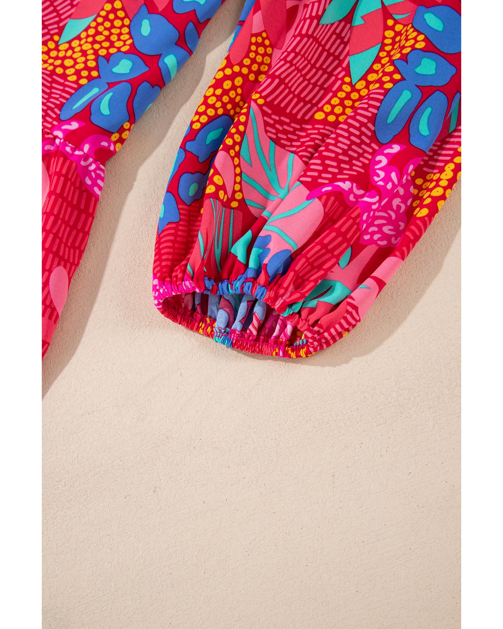 Rose Tropical Printed Lantern Sleeve V Neck Ruffled Plus Size Mini Dress – 1X