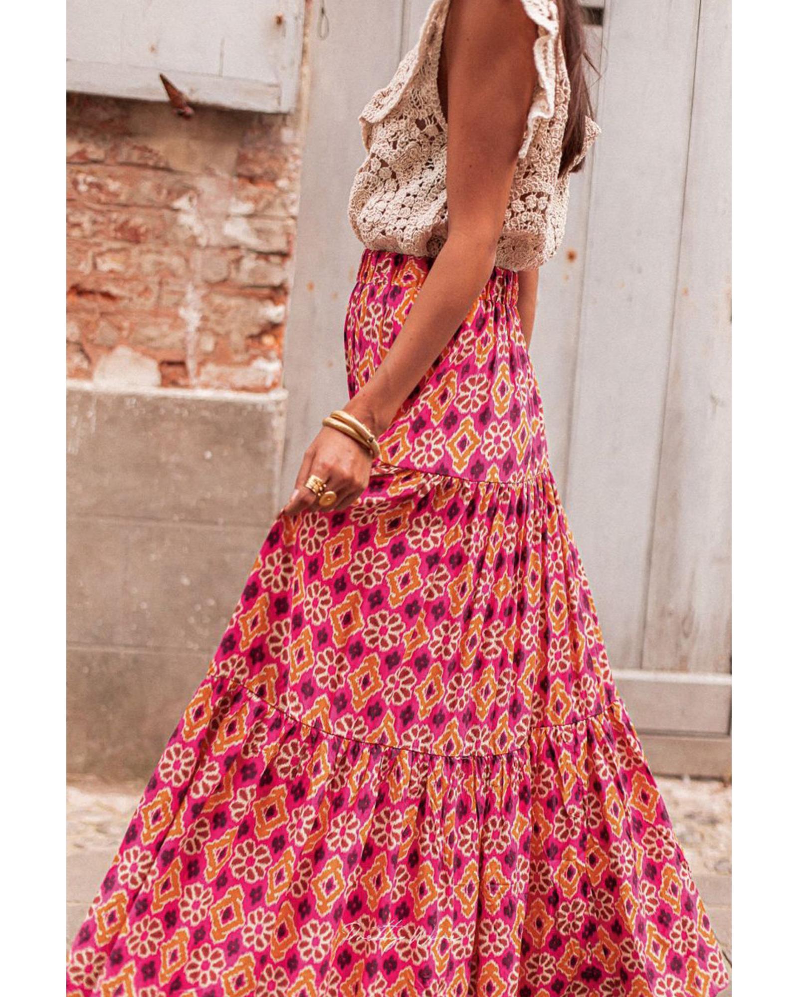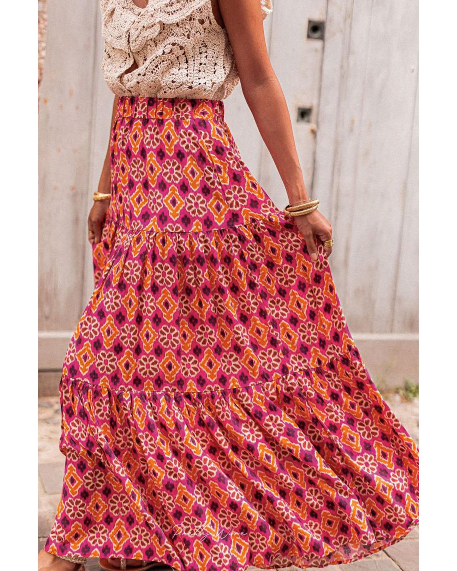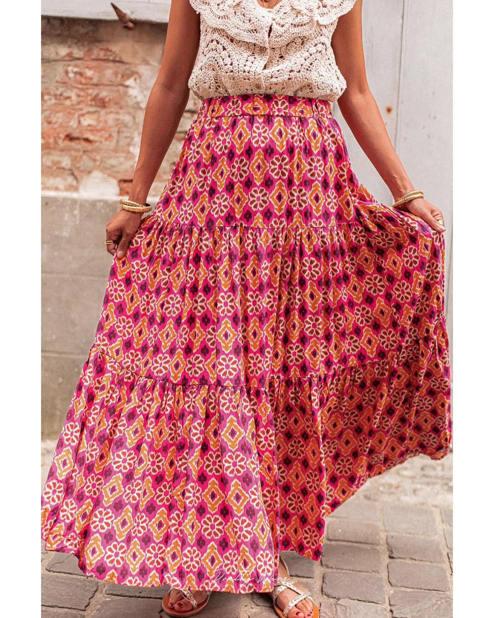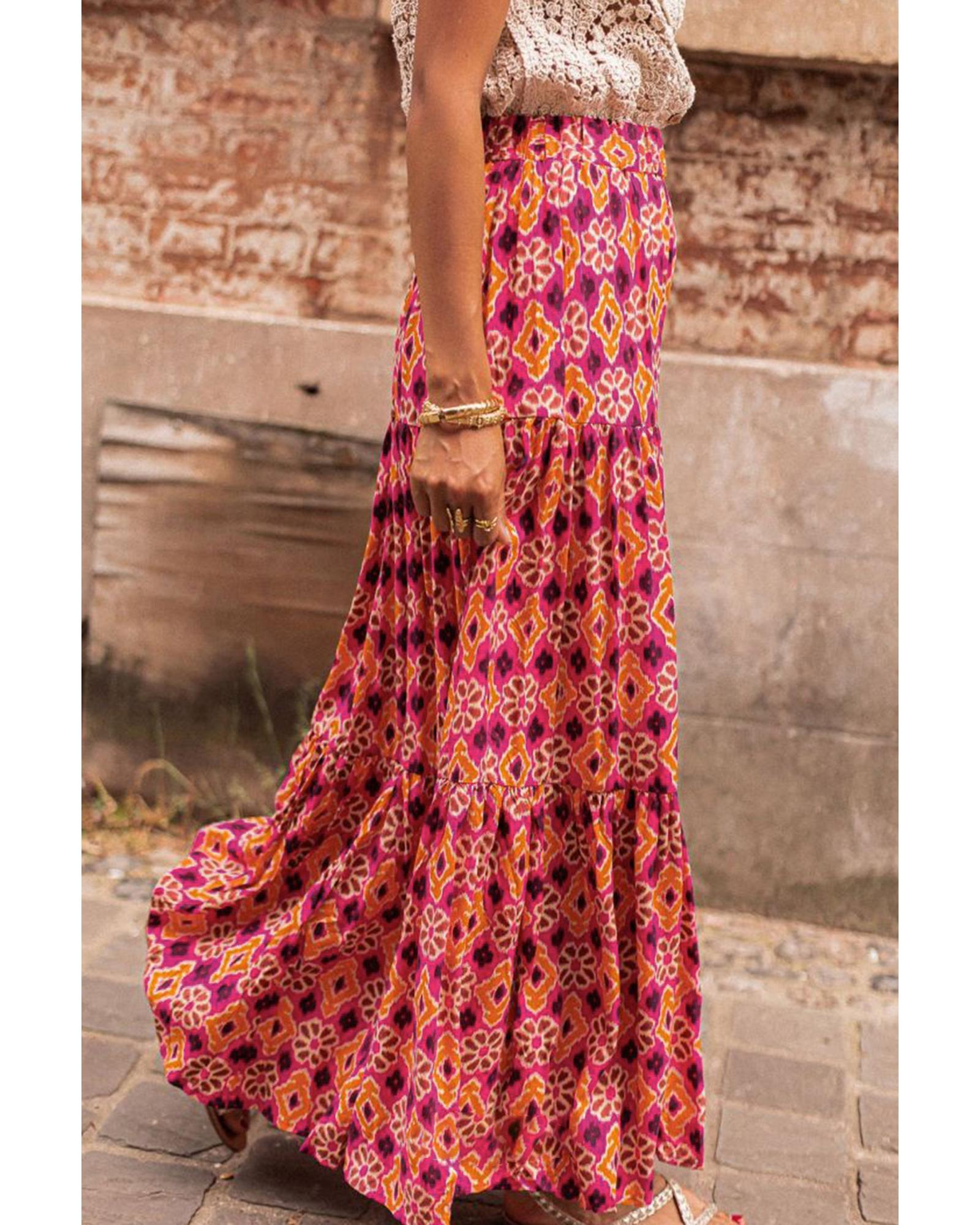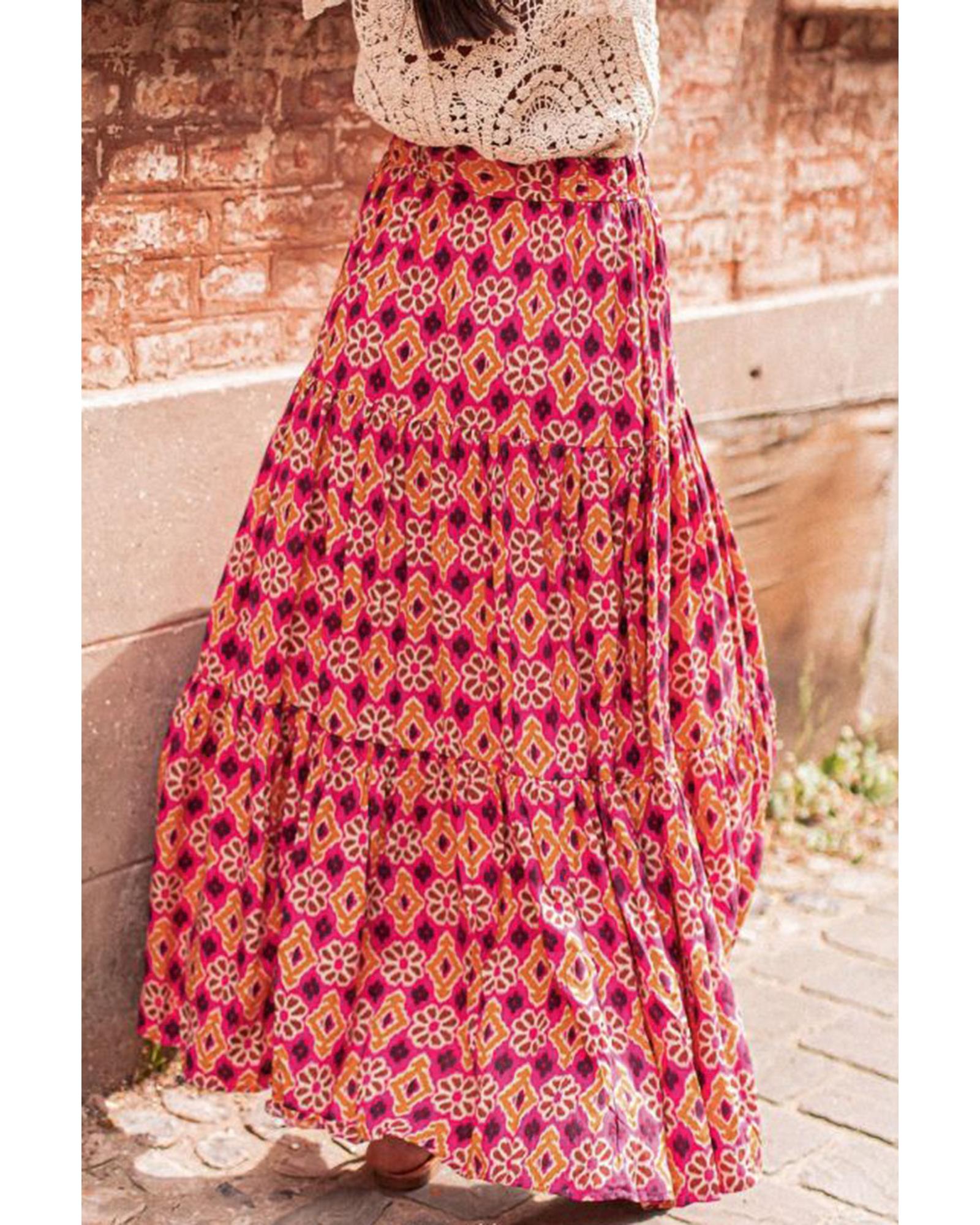 Rose Vintage Boho Floral Print Tiered Maxi Skirt – M