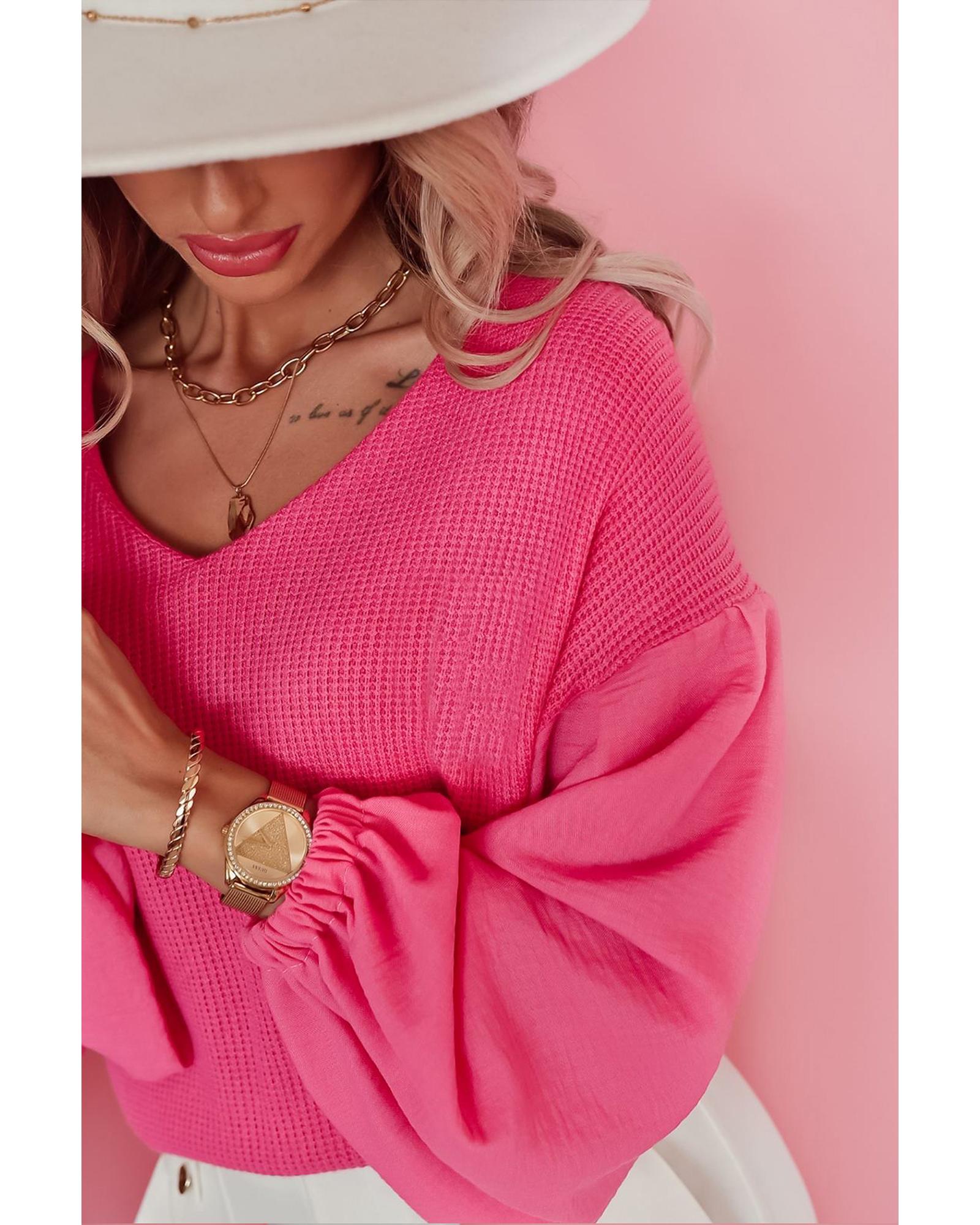 Rose Waffle Knit Balloon Sleeve Splicing V Neck Top – L