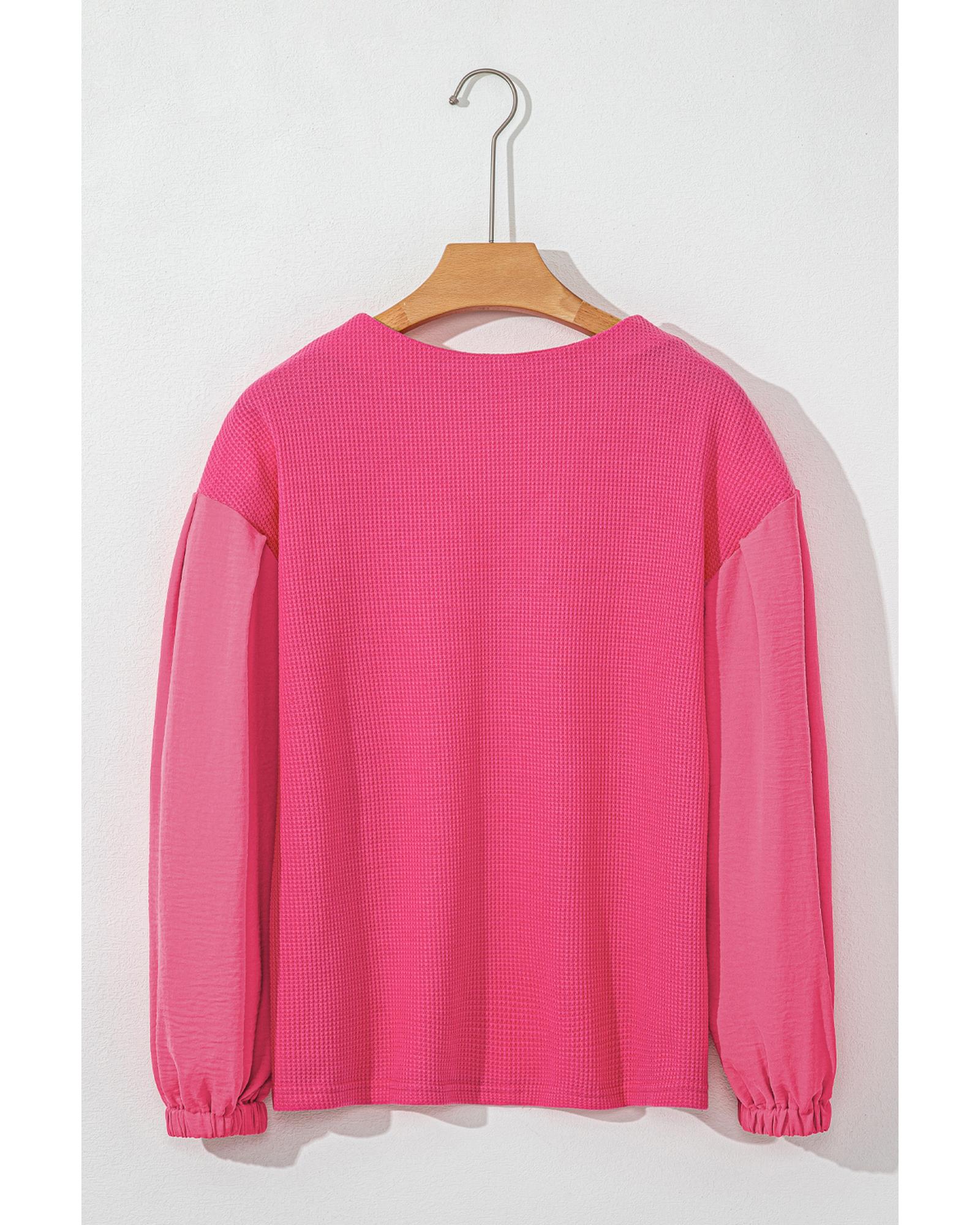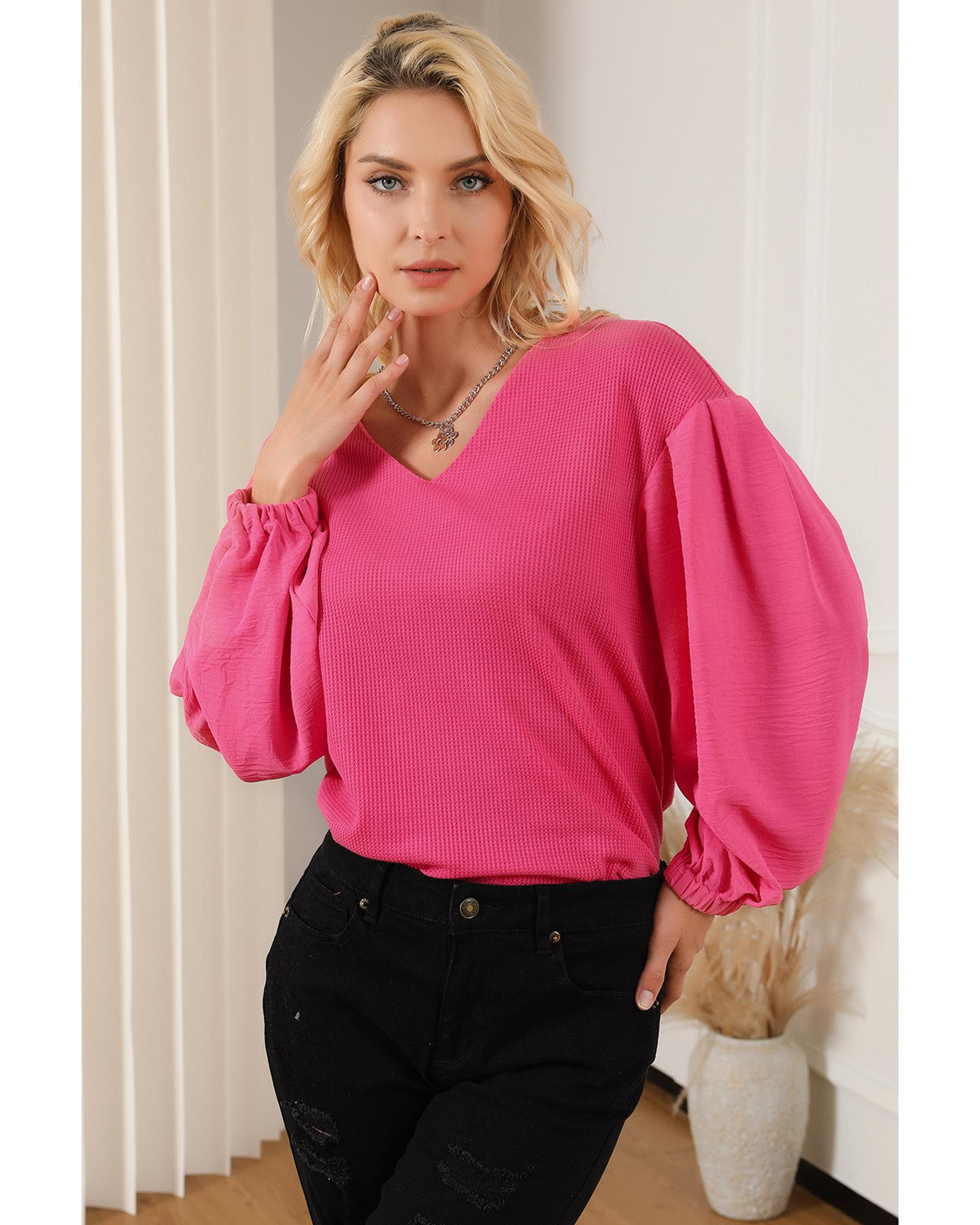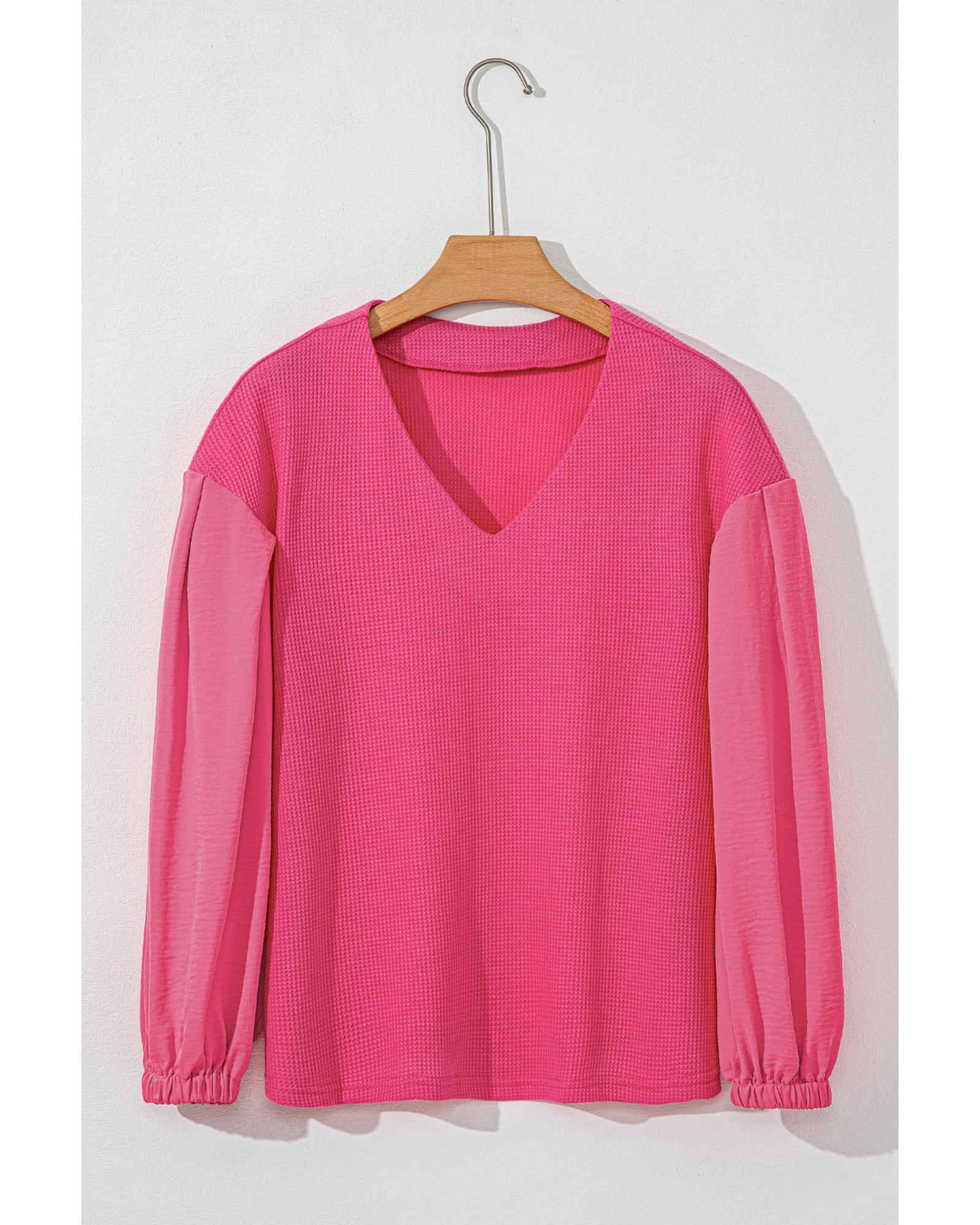 Rose Waffle Knit Balloon Sleeve Splicing V Neck Top – XL