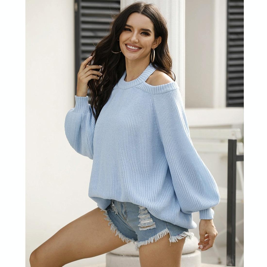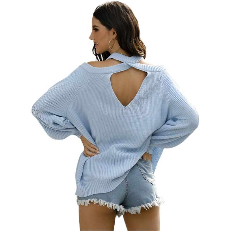 Round-Neck Strapless Heart Hollowing Knit Sweater – Blue M