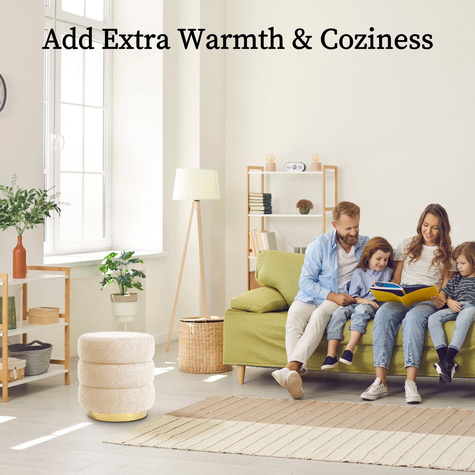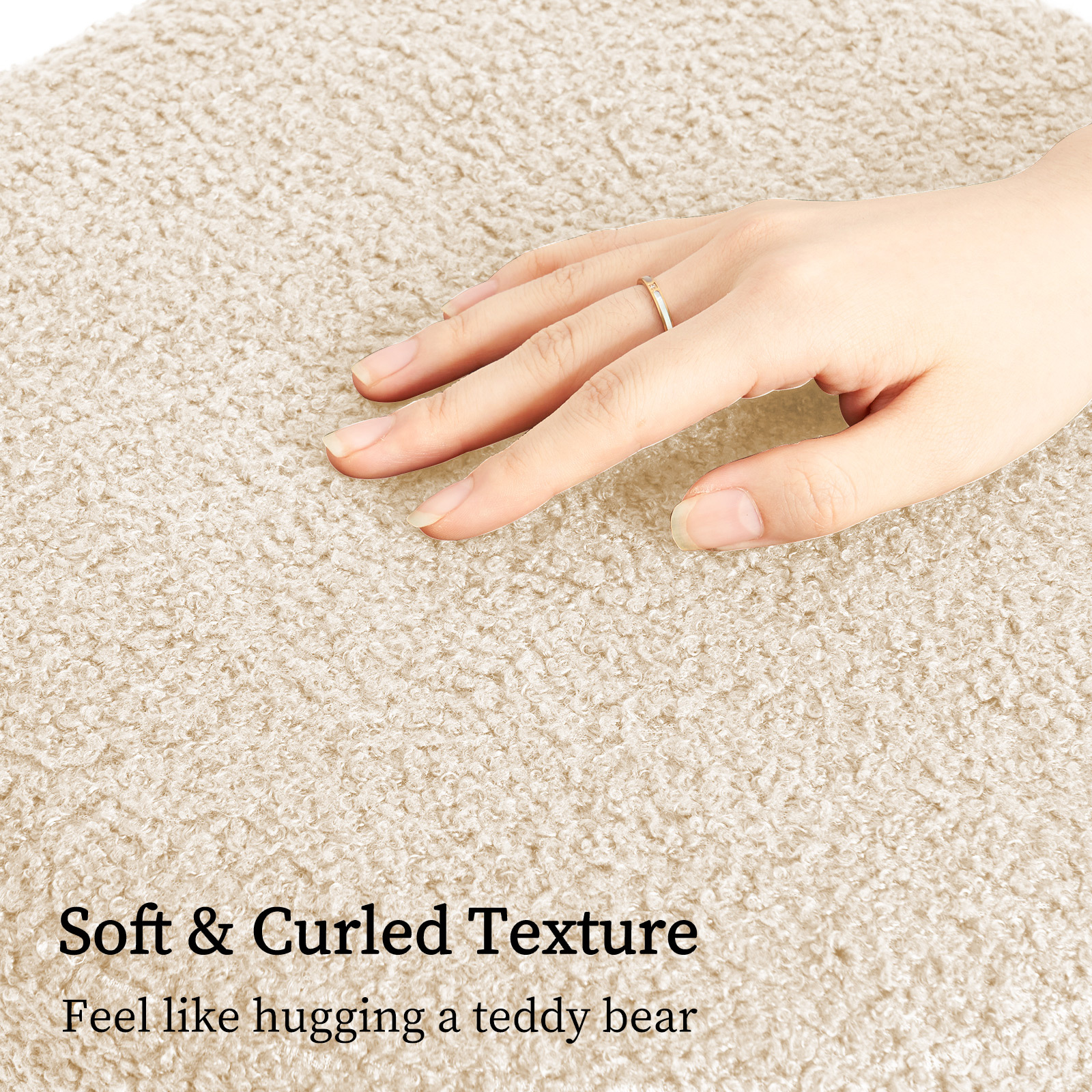 The irresistibly soft teddy fleece upholstery, featuring a luxuriously curly texture, adds a cozy, inviting touch that is perfect for any space. The chic gold base elevates the overall design, making this ottoman the ideal accent piece for your living room, bedroom, or entryway.