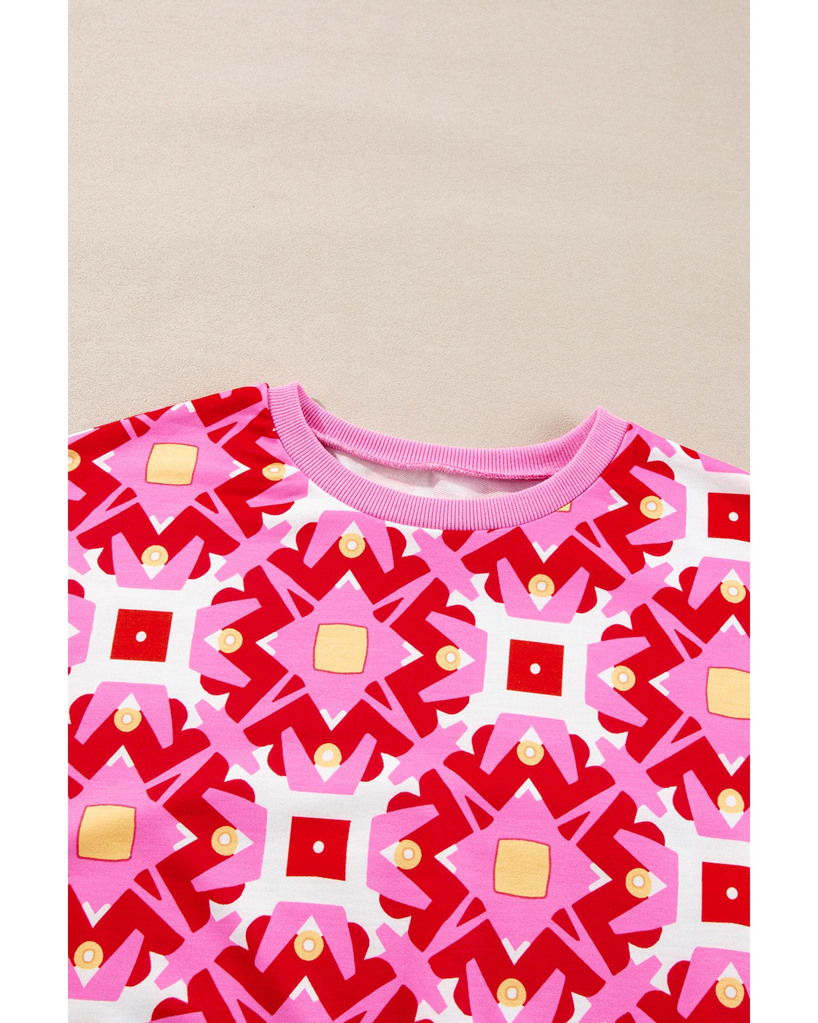 Sachet Pink Geometric Print Long Sleeve Top and Drawstring Shorts Set – M