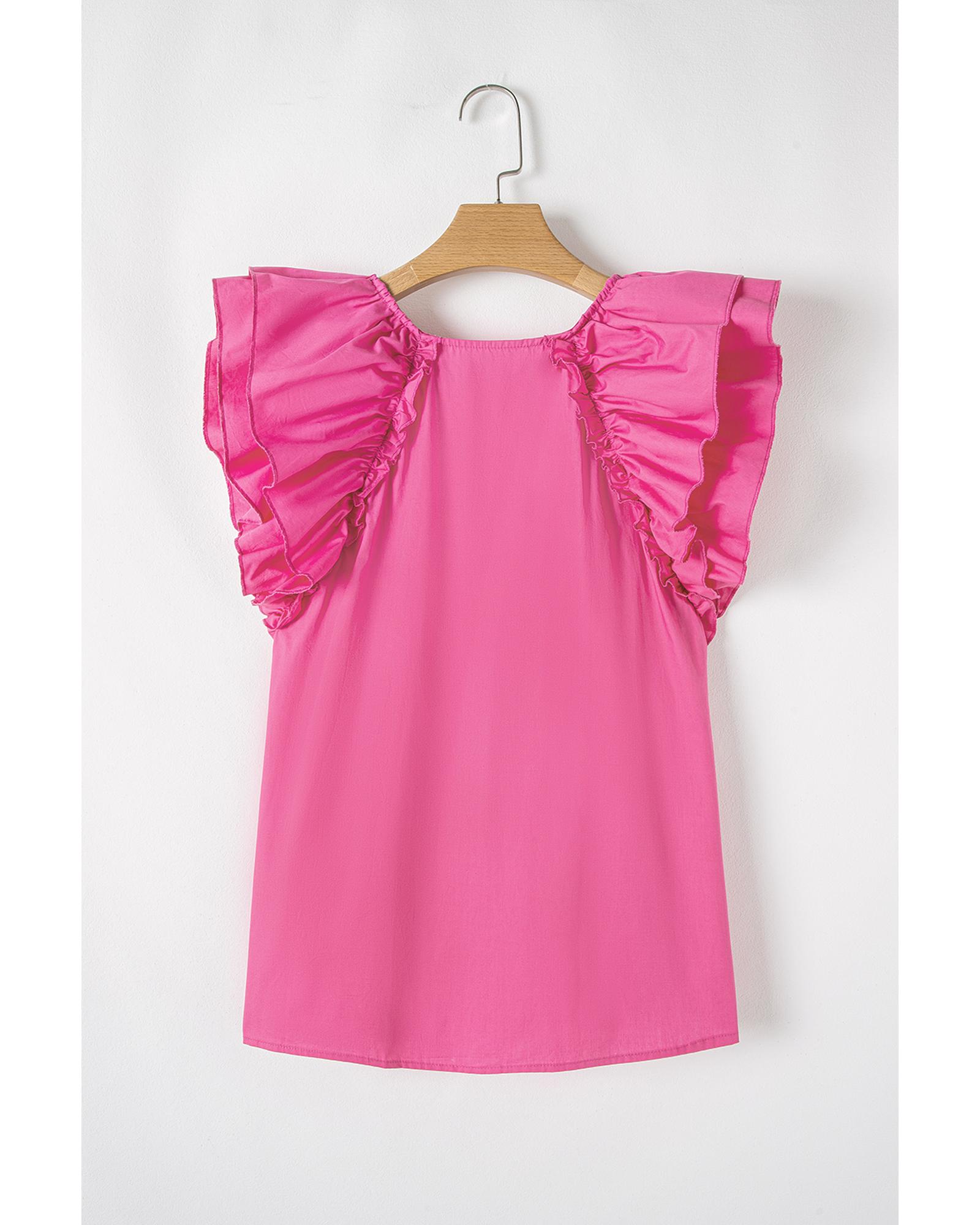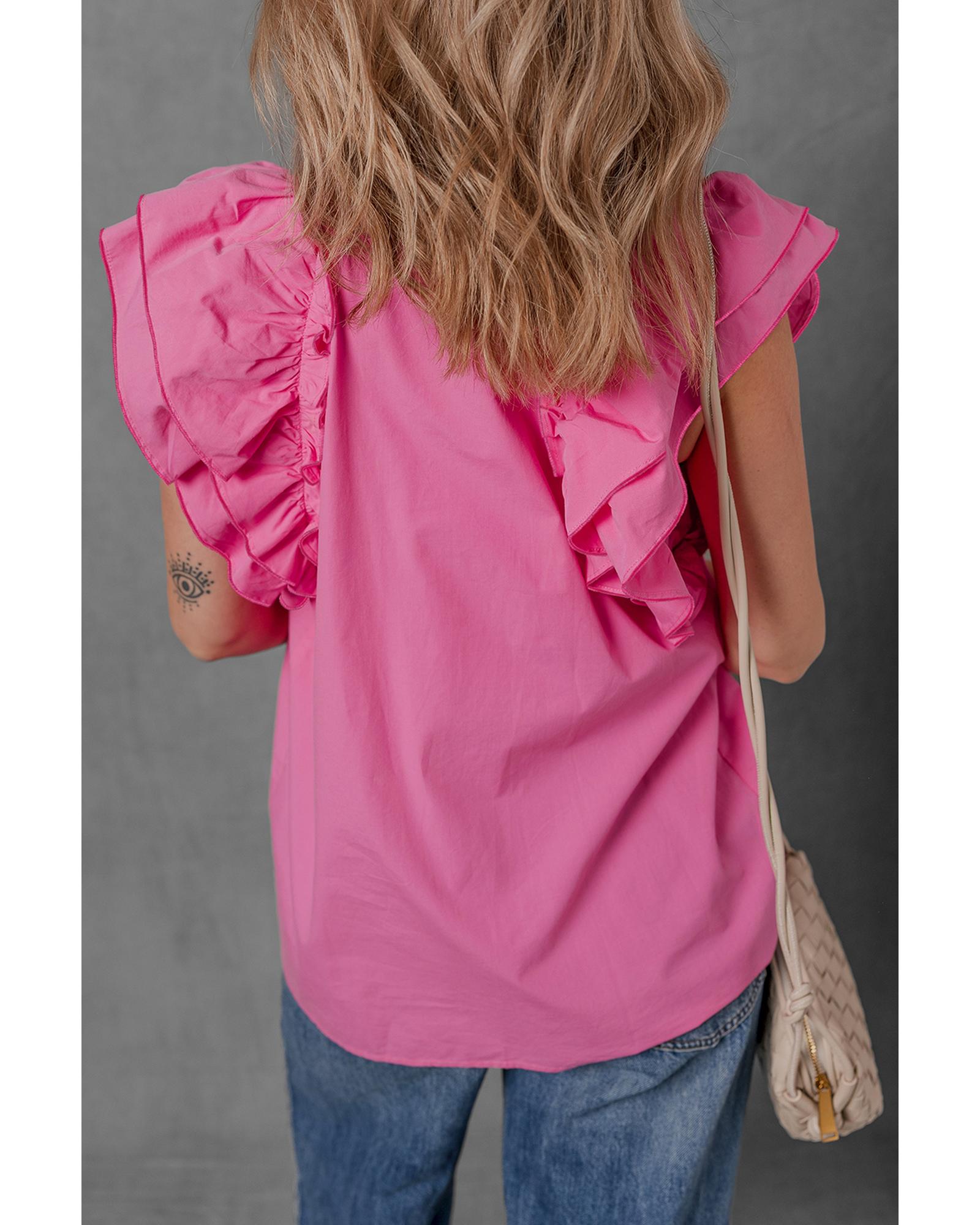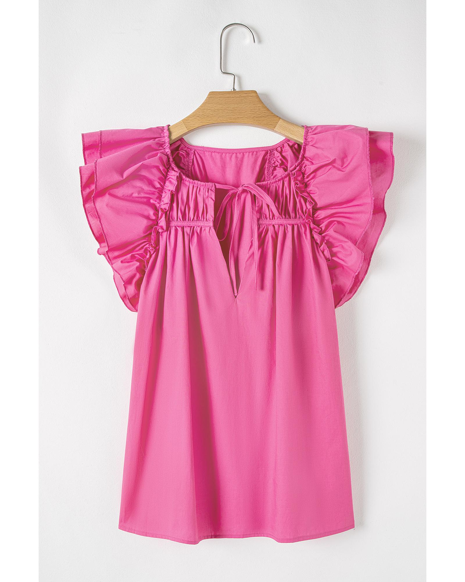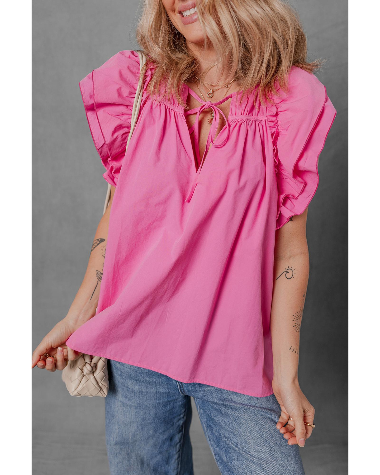 - Sachet Pink Shirred Yoke Lace up V Neck Ruffled Sleeve Blouse