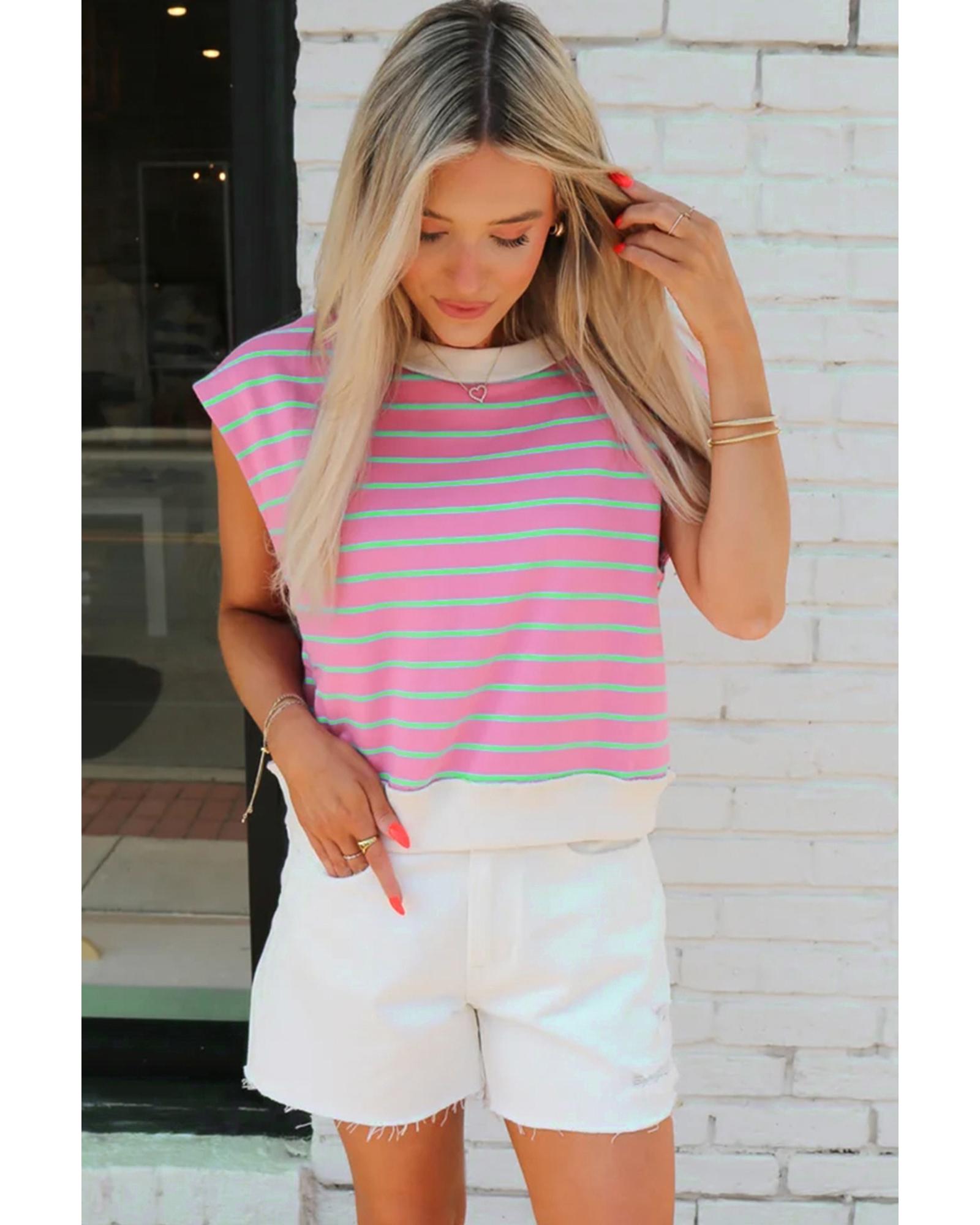 Sachet Pink Striped Crew Neck Cap Sleeve T Shirt – M