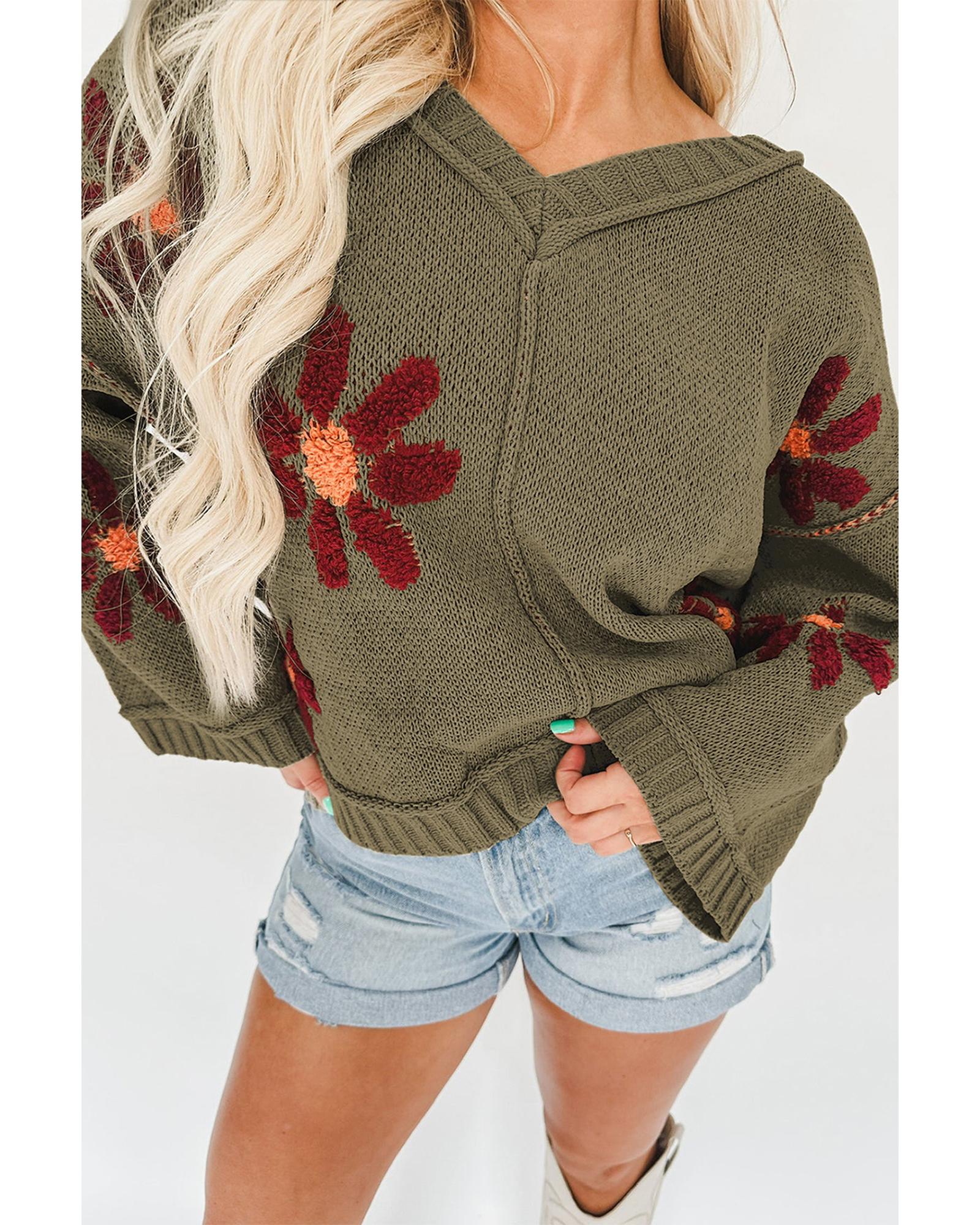 Sage Green Flower Knit Ribbed Trim V Neck Sweater – L