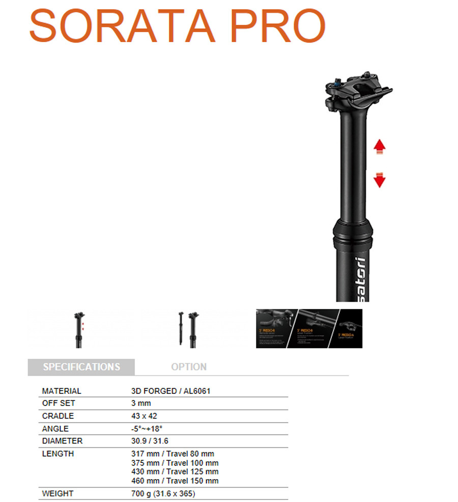 Satori Sorata Pro MTB Mountain Bike Adjustable Seatpost Internal Cable 30.9 Diameter 125mm Travel