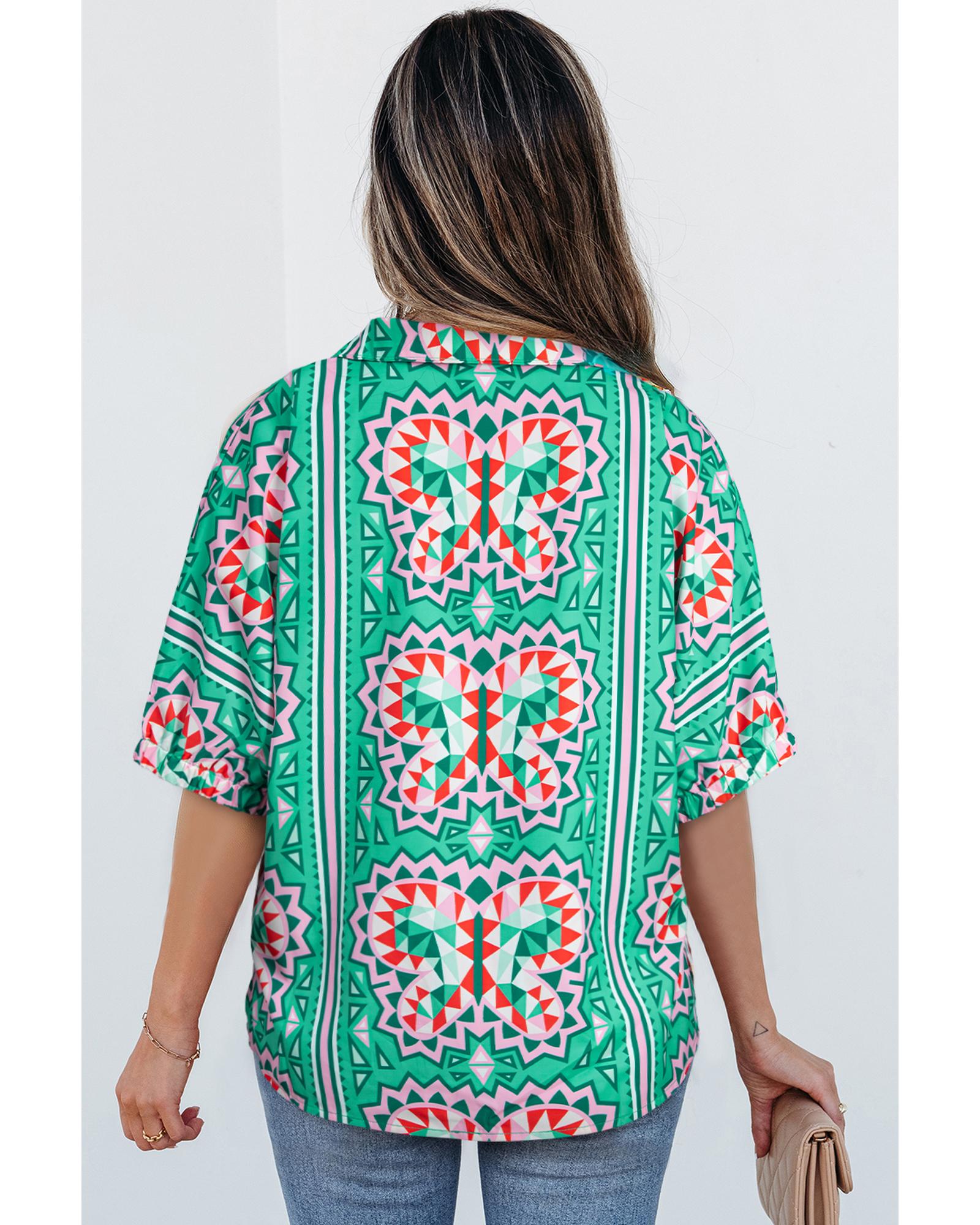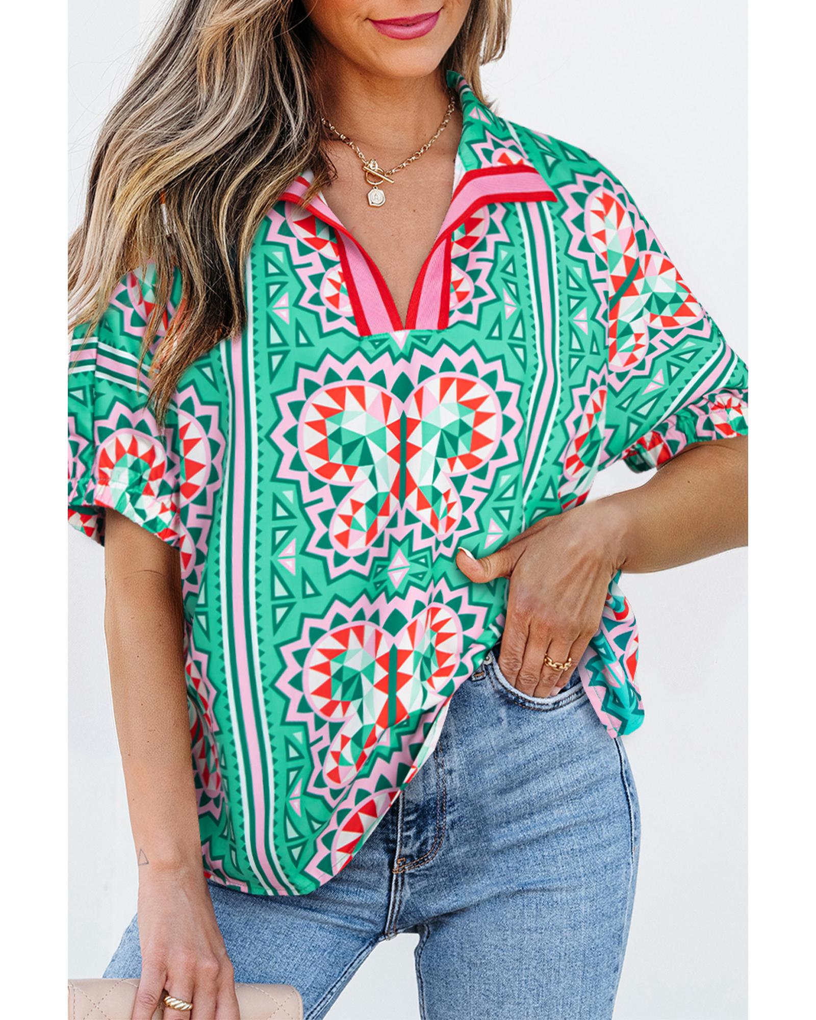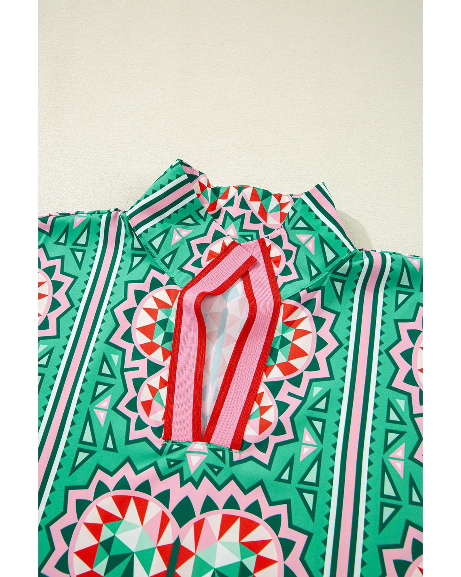 Sea Green Boho Abstract Print Contrast Striped Collared V Neck Blouse – L