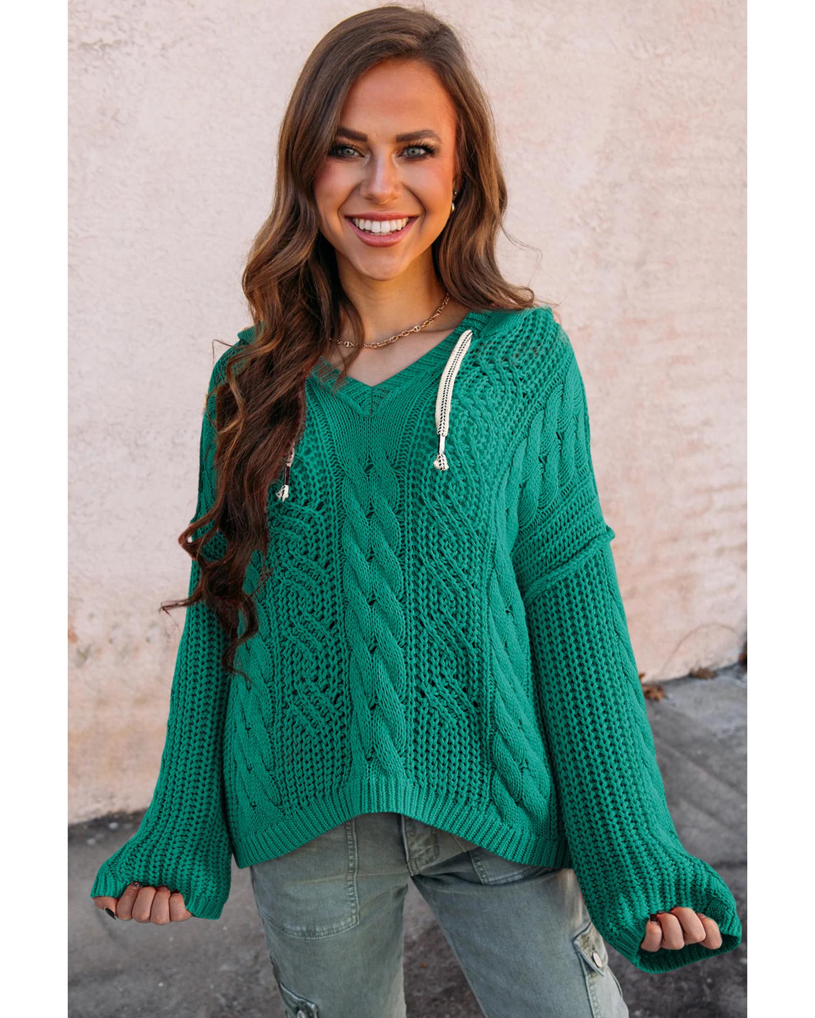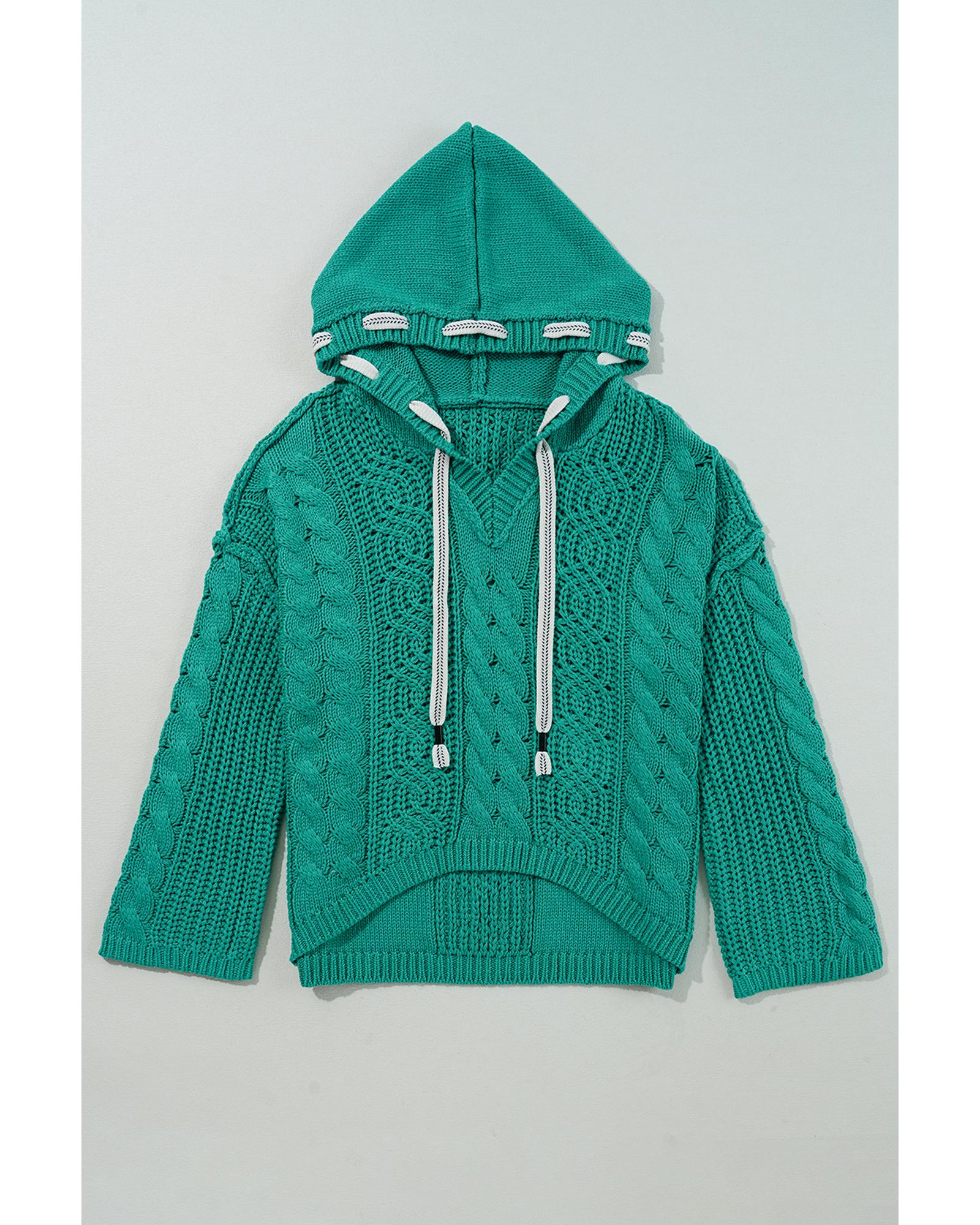 • Sea Green Cable Knit V Neck Contrast Drawstring Hooded Sweater