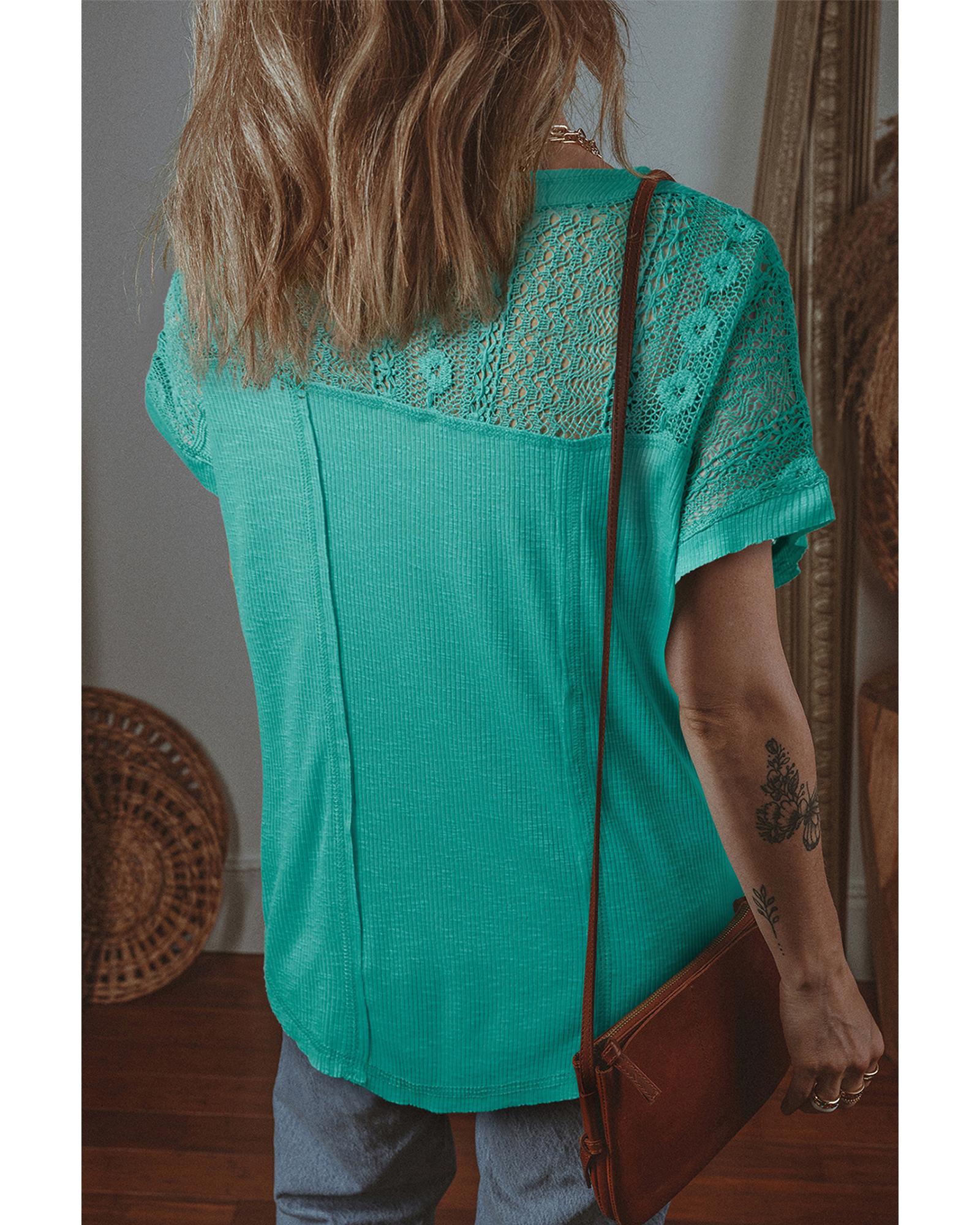 - Sea Green Lace Patchwork Split Neck Textured Short Sleeve Blouse