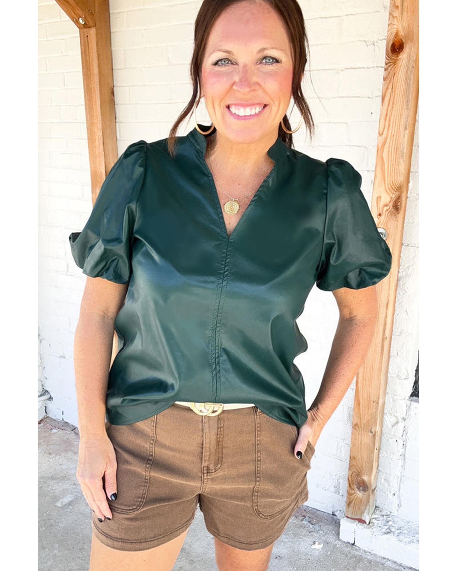 Sea Green Notched V Neck Short Puff Sleeve PU Leather Blouse – L