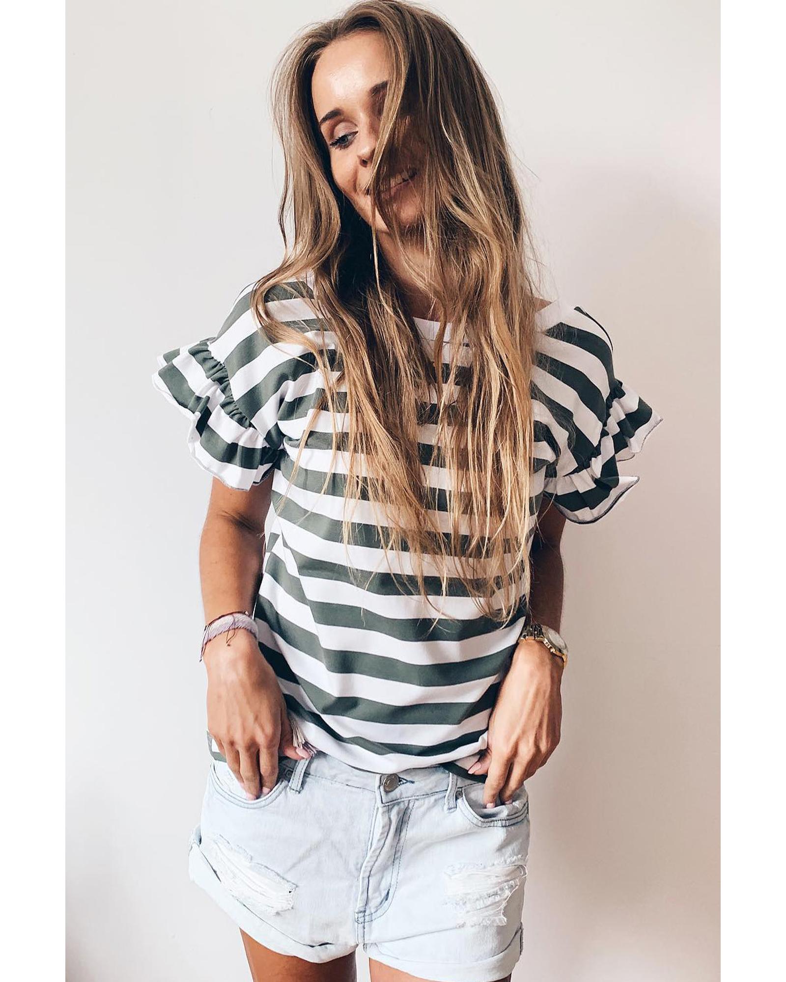 Sea Green Striped V Neck Ruffle Sleeve Top – L