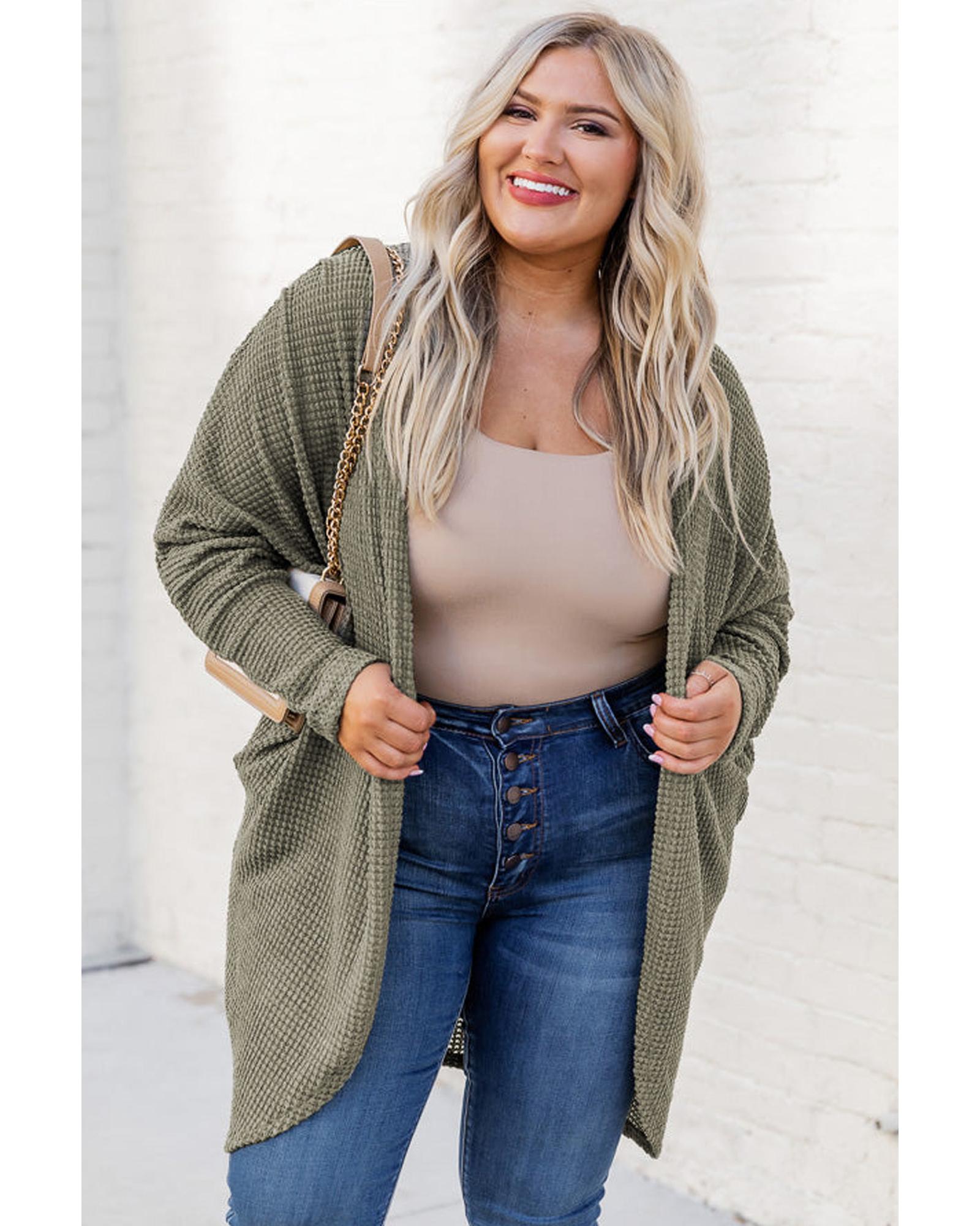 Seagrass Waffle Knit Drop Shoulder Open Front Pocketed Plus Size Cardigan – 2X