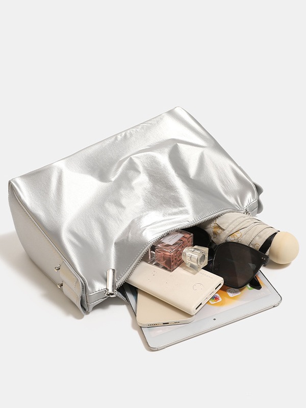 Elevate your accessory game with this stunning Luminous Silver Nylon Bag, a perfect blend of modern aesthetics and practical design for Summer 2024. Crafted from a durable and lightweight Nylon and Polyester blend, this bag features a captivating metallic sheen that catches the light beautifully.