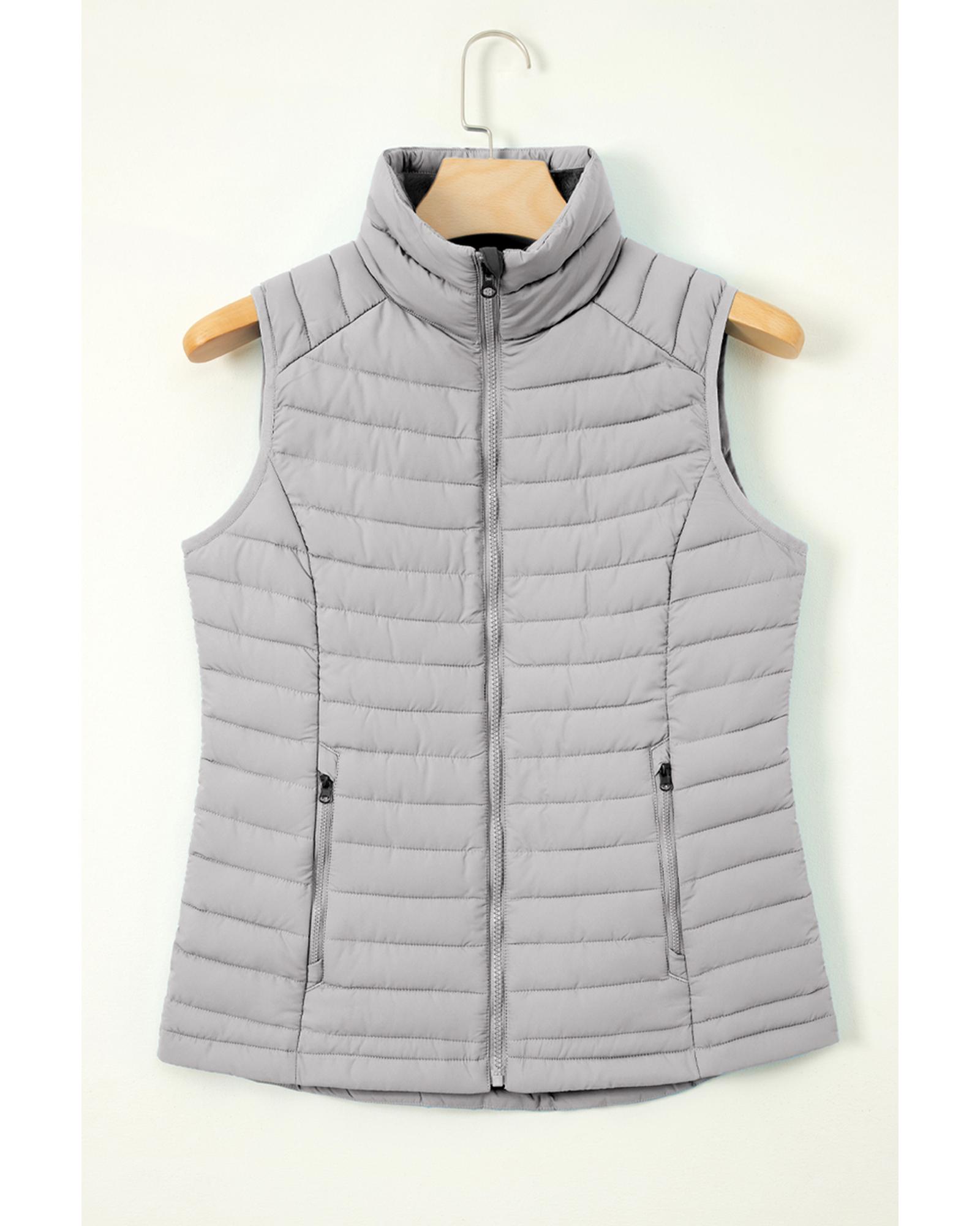 Silvery Plush Collared Quilted Zipped Puffer Vest – L