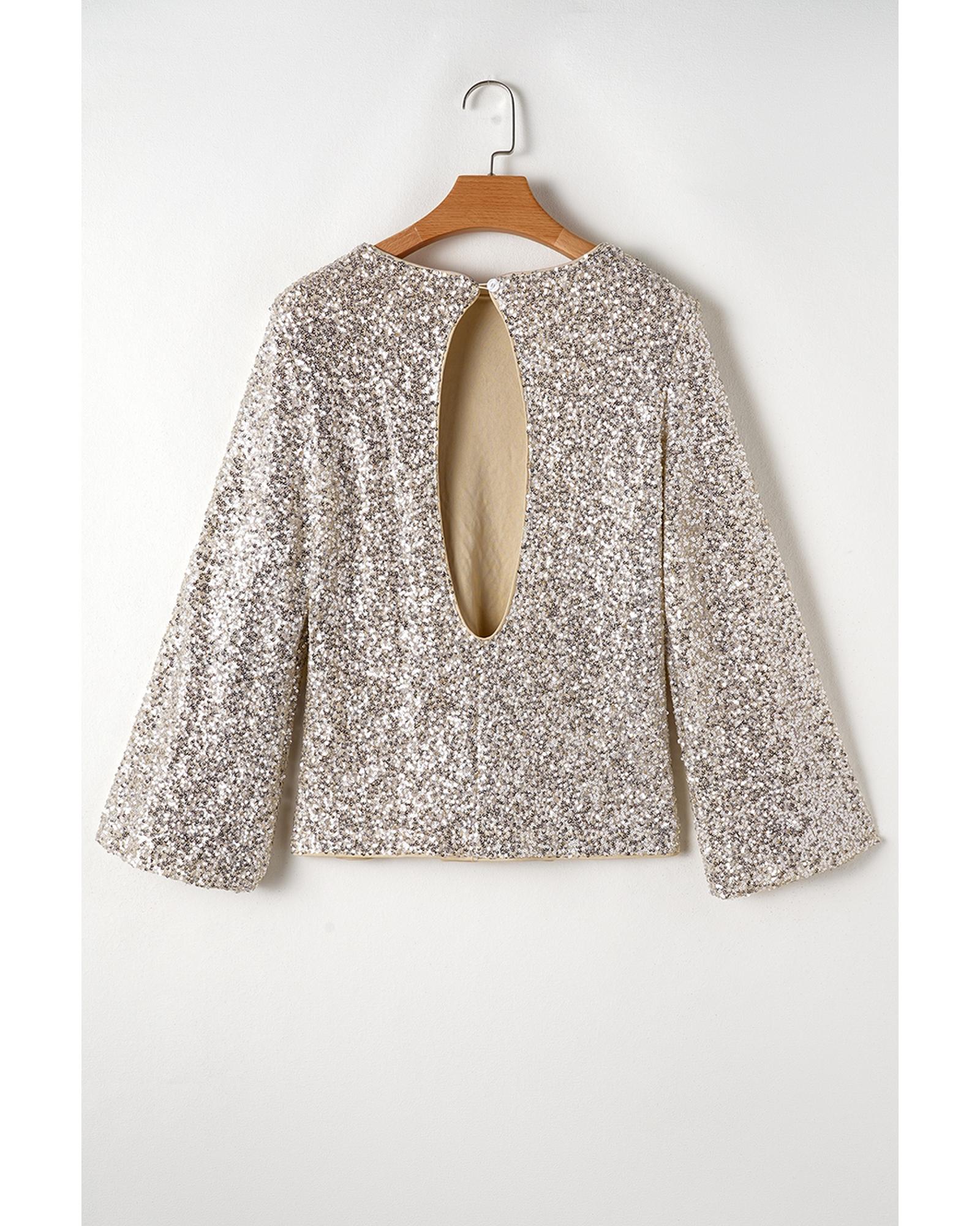 Silvery Sequin Puff Sleeve Cutout Back Blouse – L