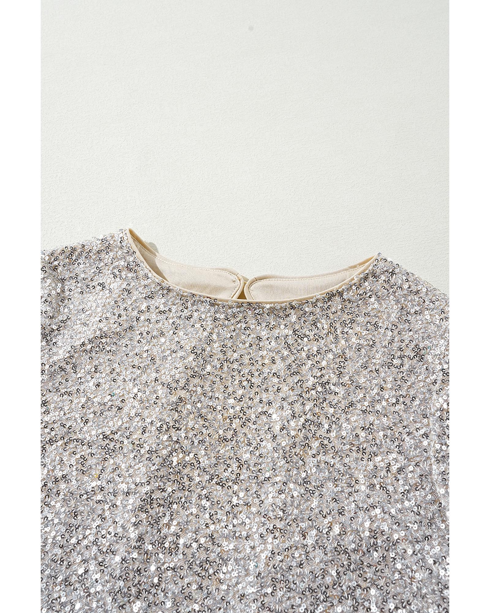 Silvery Sequin Puff Sleeve Cutout Back Blouse – M