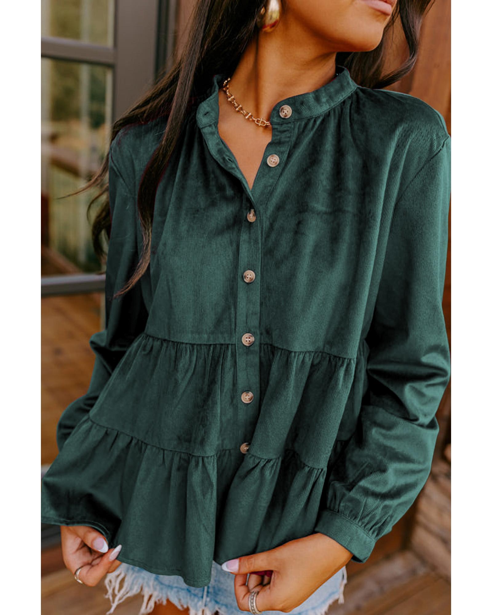 - Skobeloff Corduroy Ruffle Tiered Buttoned O Neck Shirt