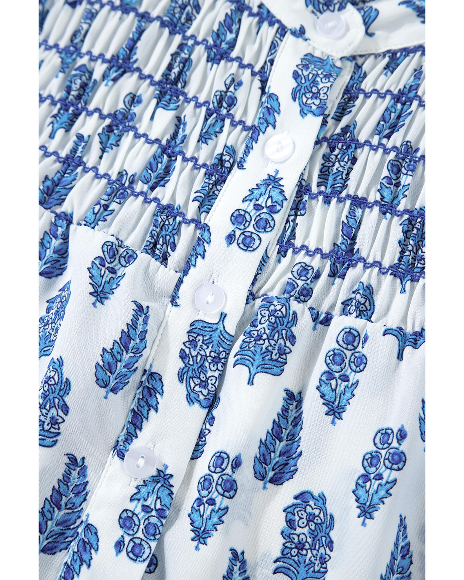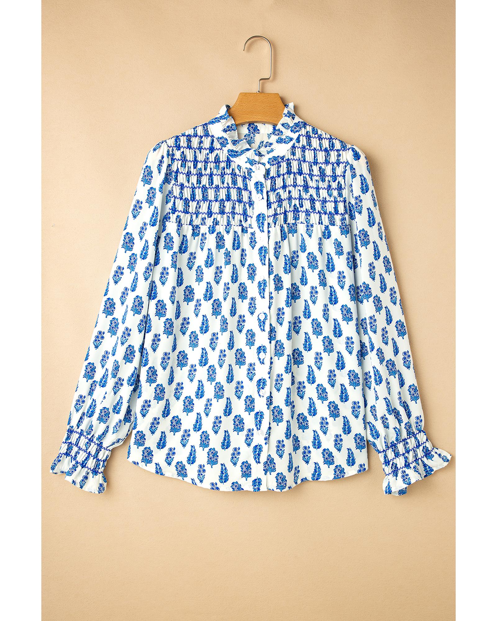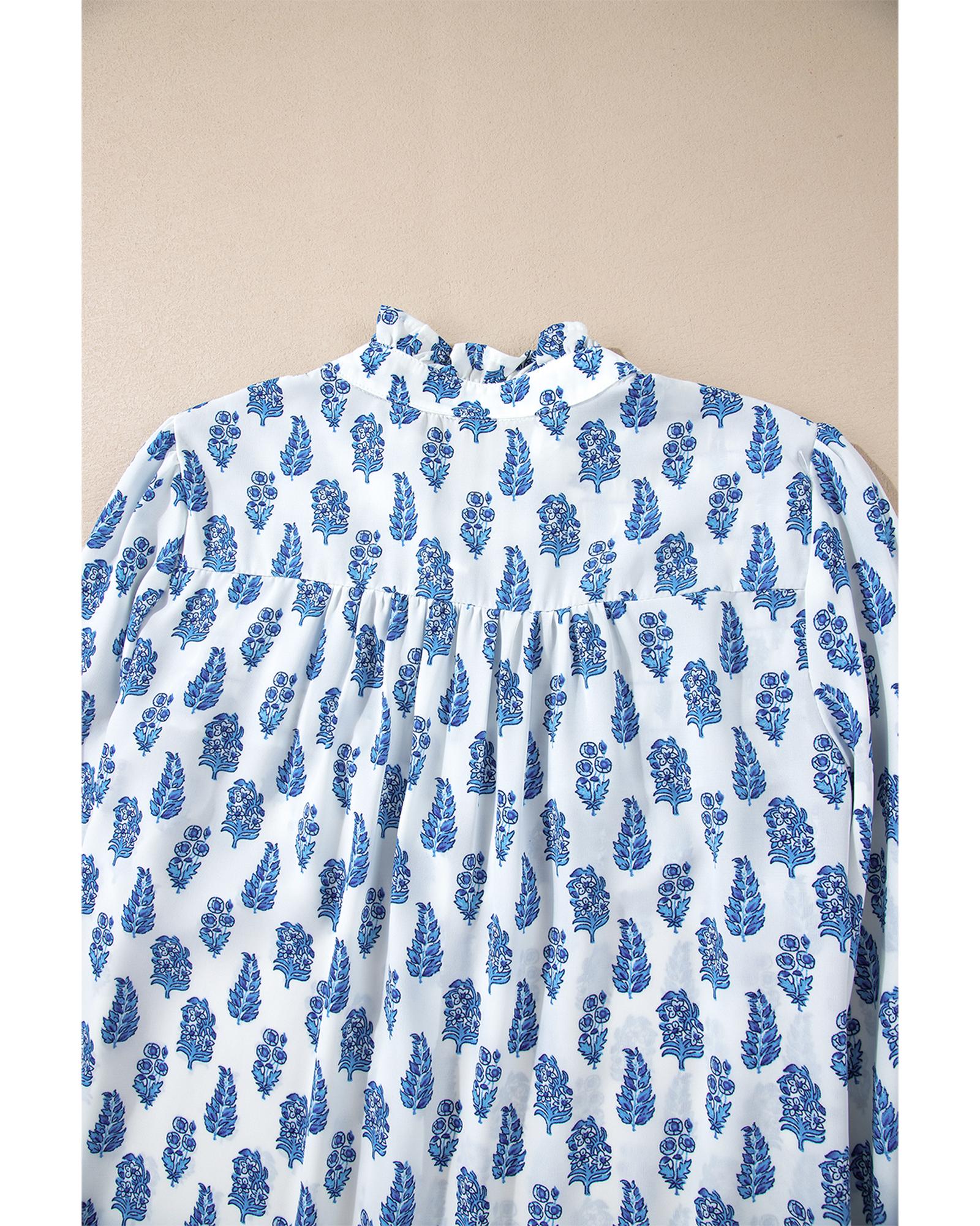 Sky Blue Boho Floral Printed Lantern Sleeve Frilled Neck Shirred Shirt – M