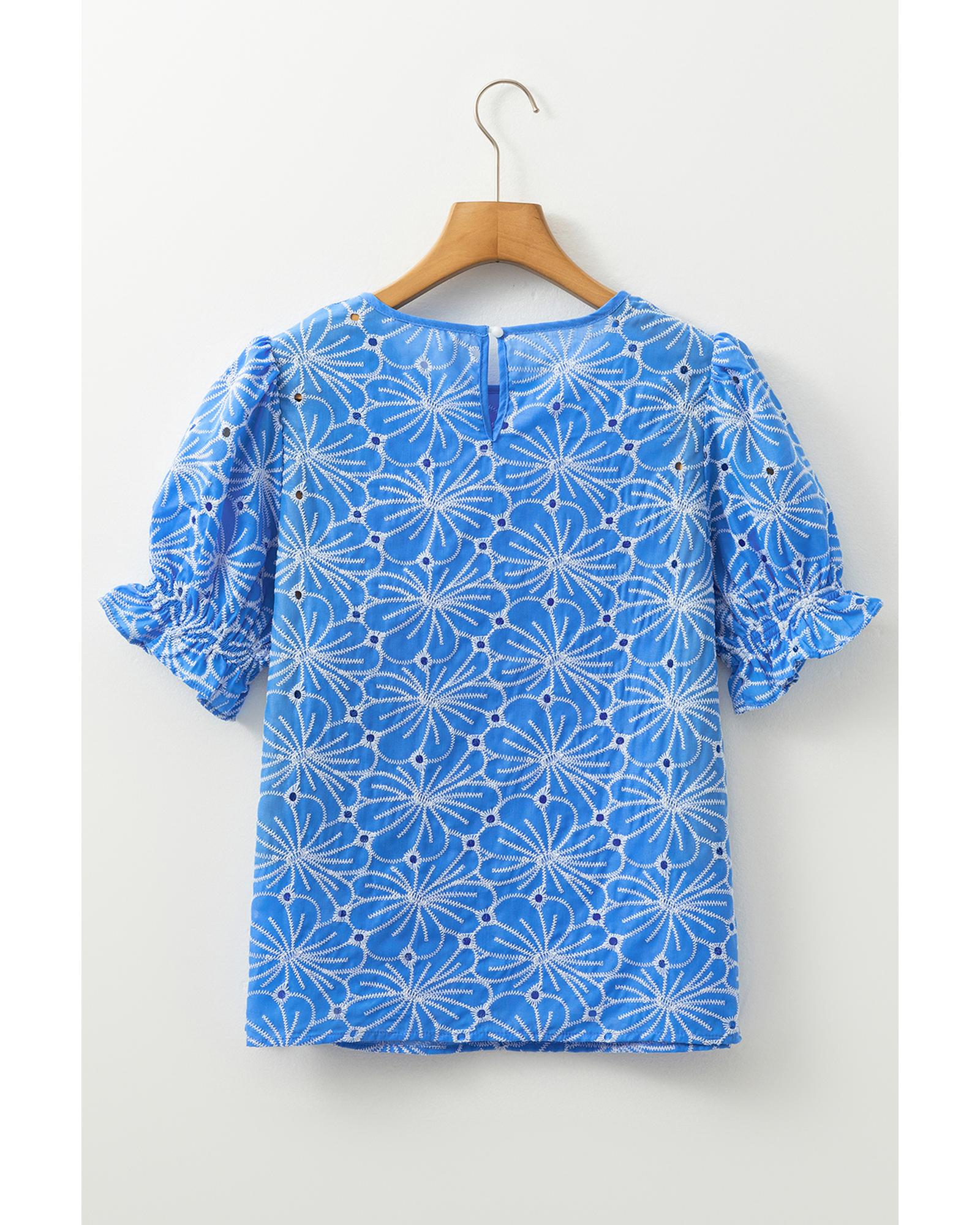 Sky Blue Eyelet Flower Embroidery Frilled Short Puff Sleeve Blouse – L