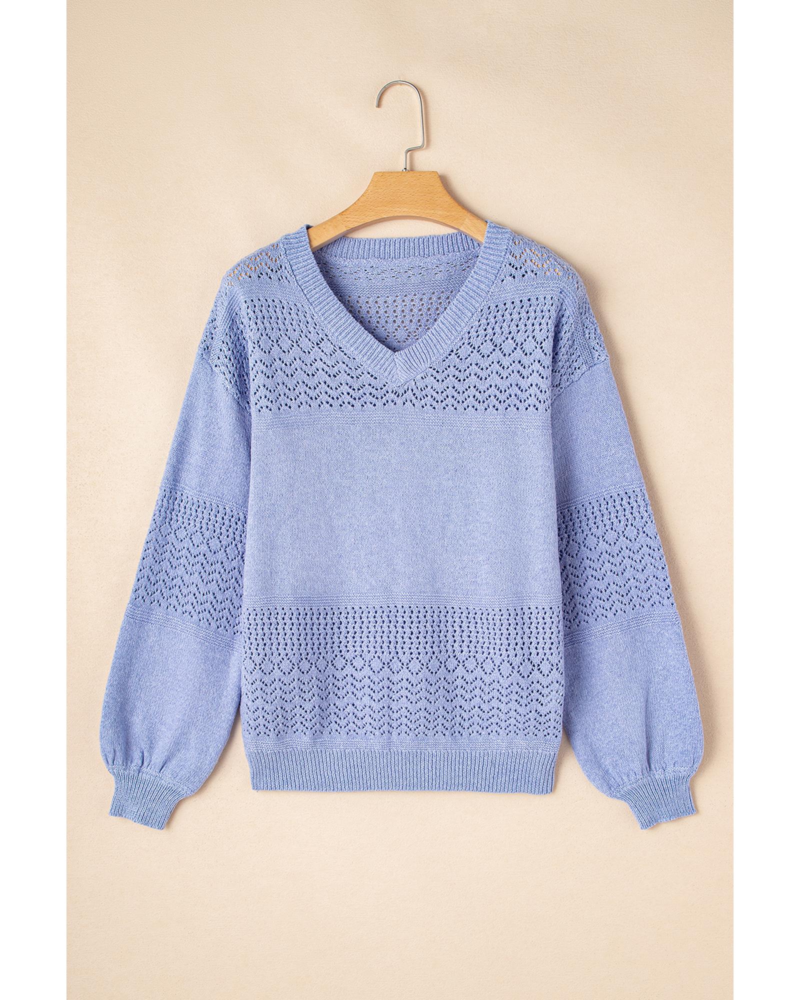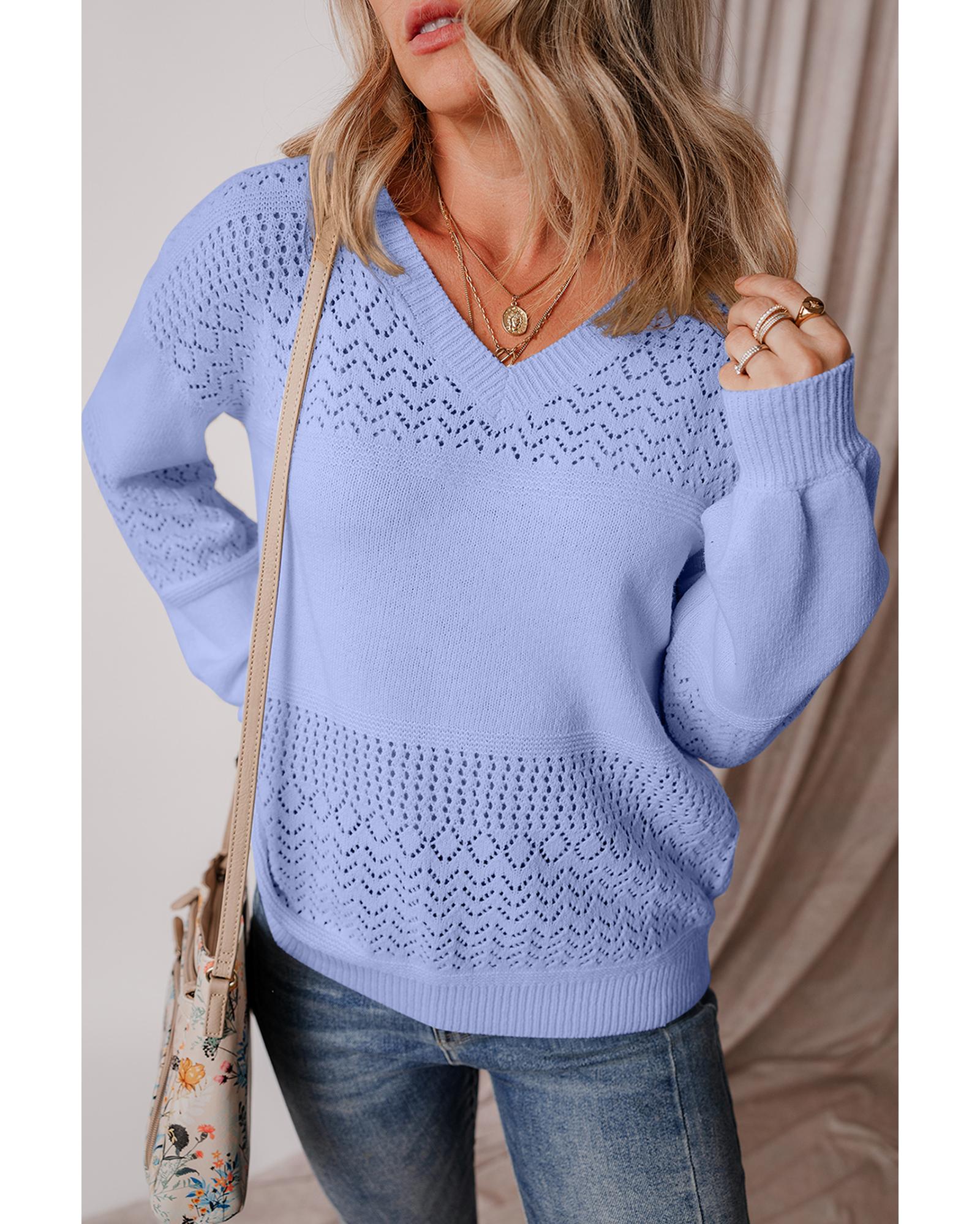 Sky Blue Eyelet Pattern Detail V Neck Drop Shoulder Sweater – M