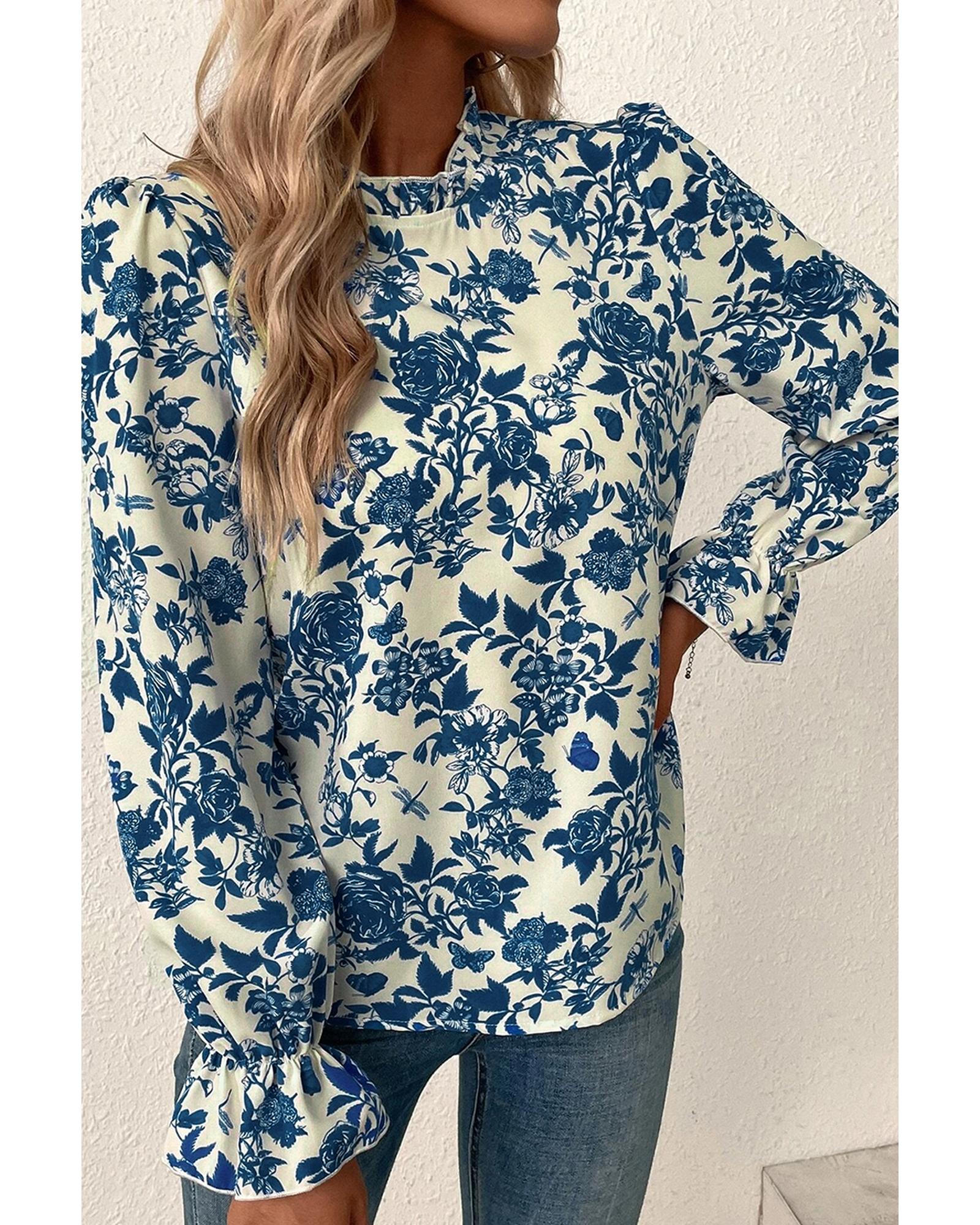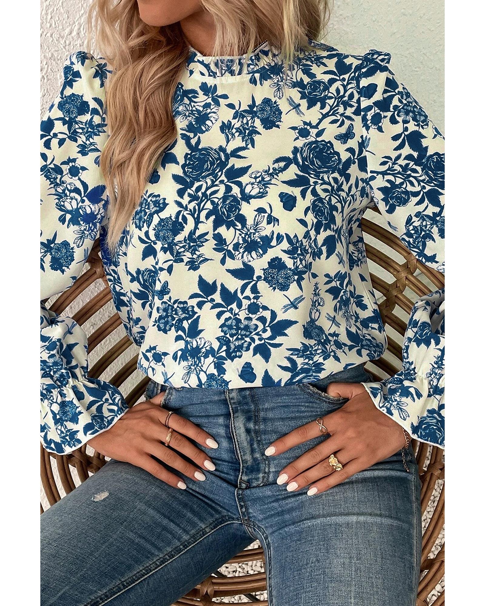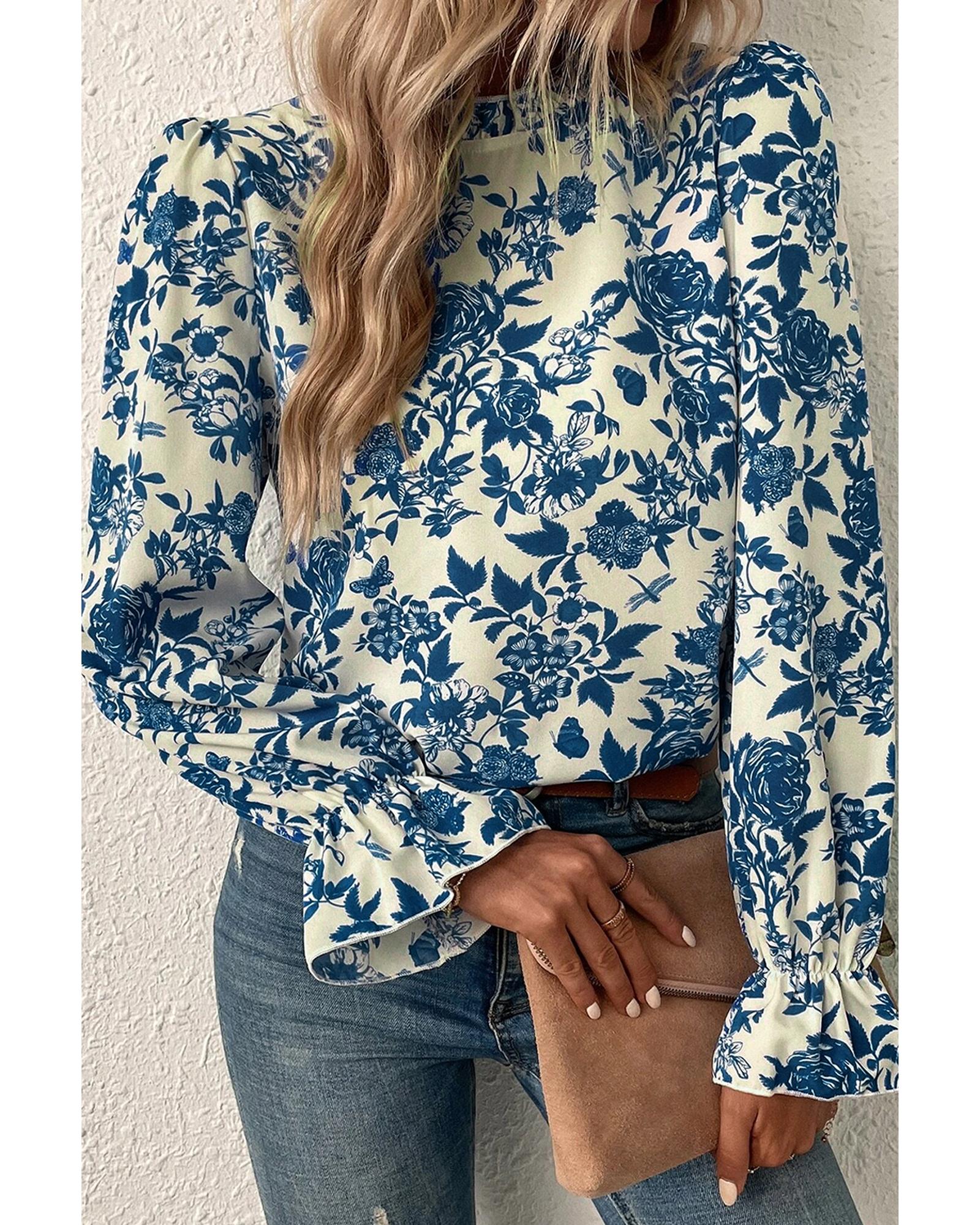 Sky Blue Floral Print Flounce Sleeve Keyhole Back Blouse – S