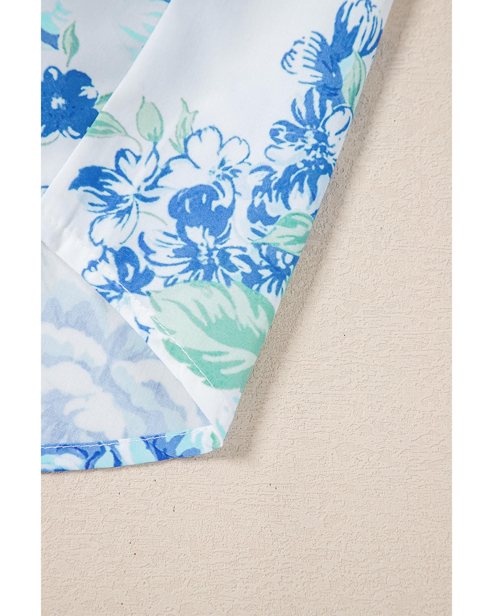 Sky Blue Floral Print Ruffle Sleeve Frilly Button Up Shirt – L