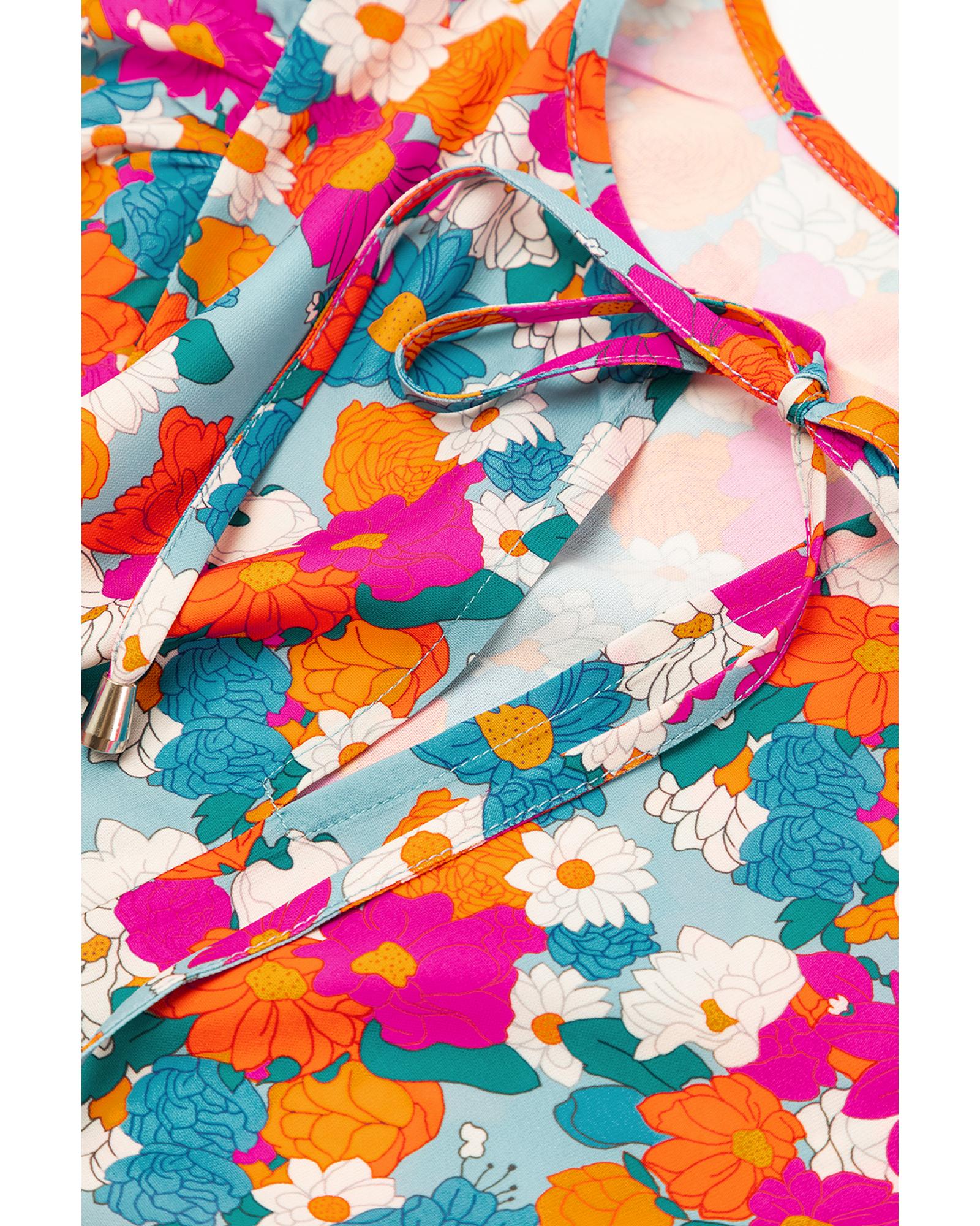 Sky Blue Floral Print Tie Split Neck Bubble Sleeve Babydoll Dress – M