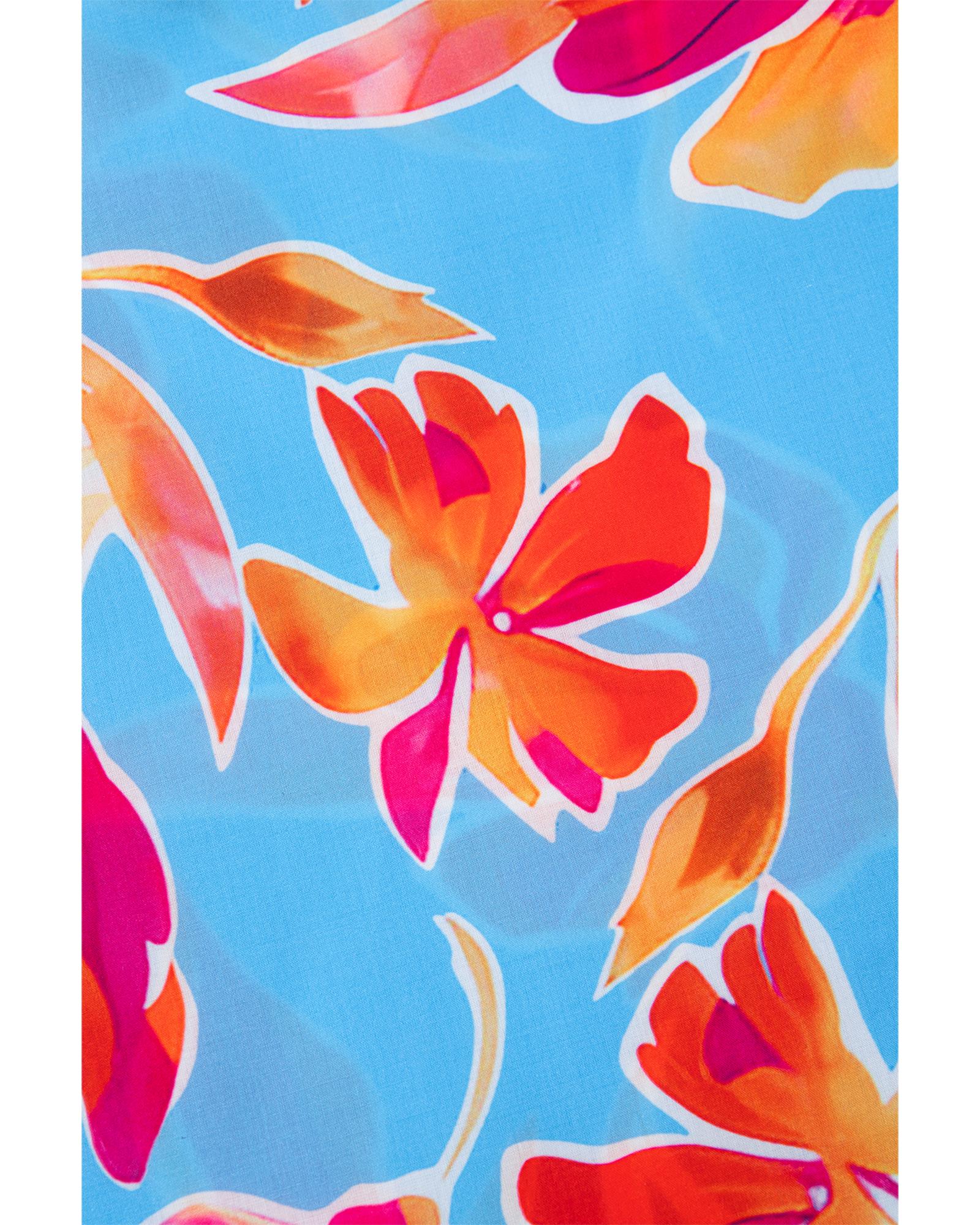 Sky Blue Floral Print V Neck Pompom Trim Flutter Sleeve Blouse – L