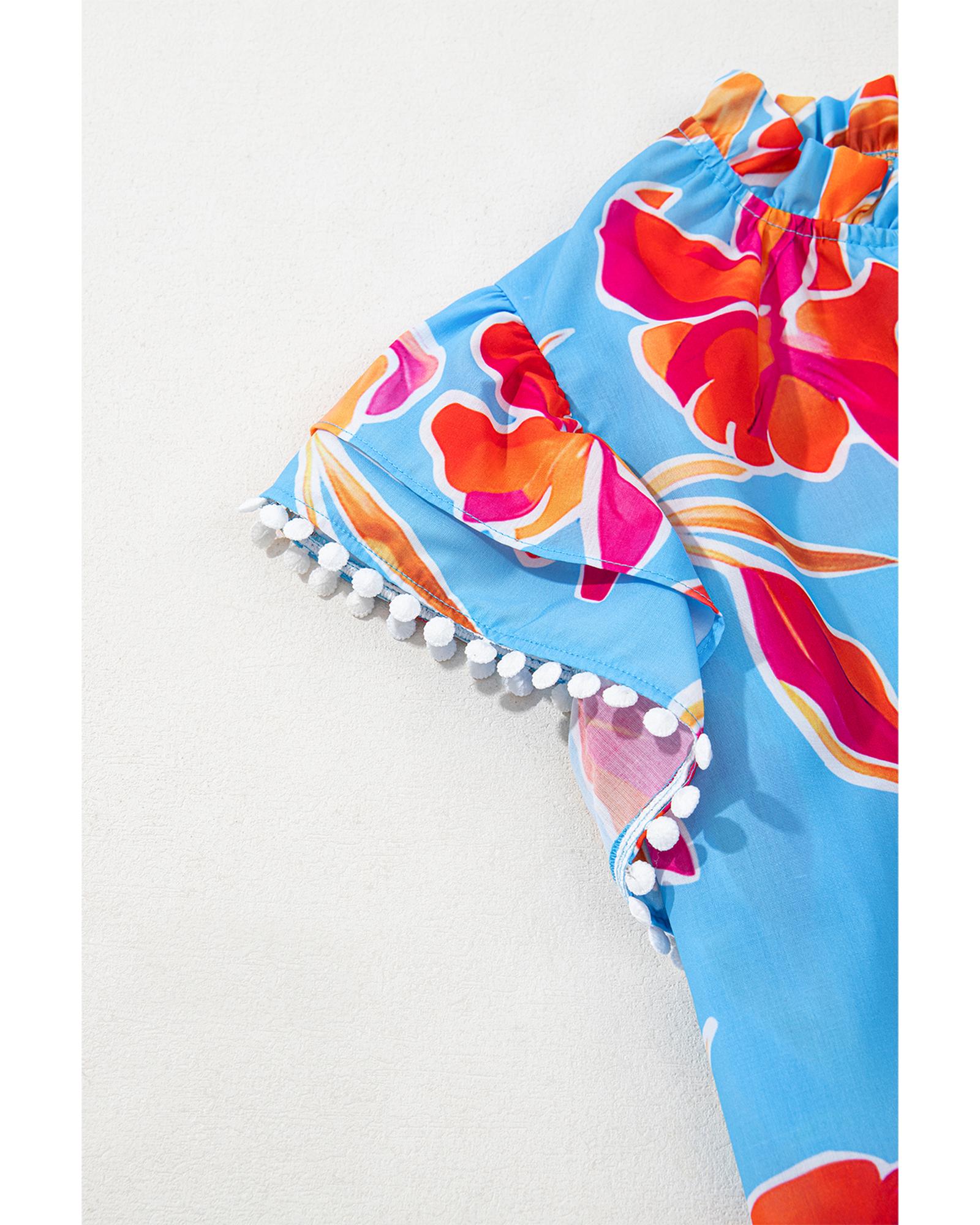Sky Blue Floral Print V Neck Pompom Trim Flutter Sleeve Blouse – S