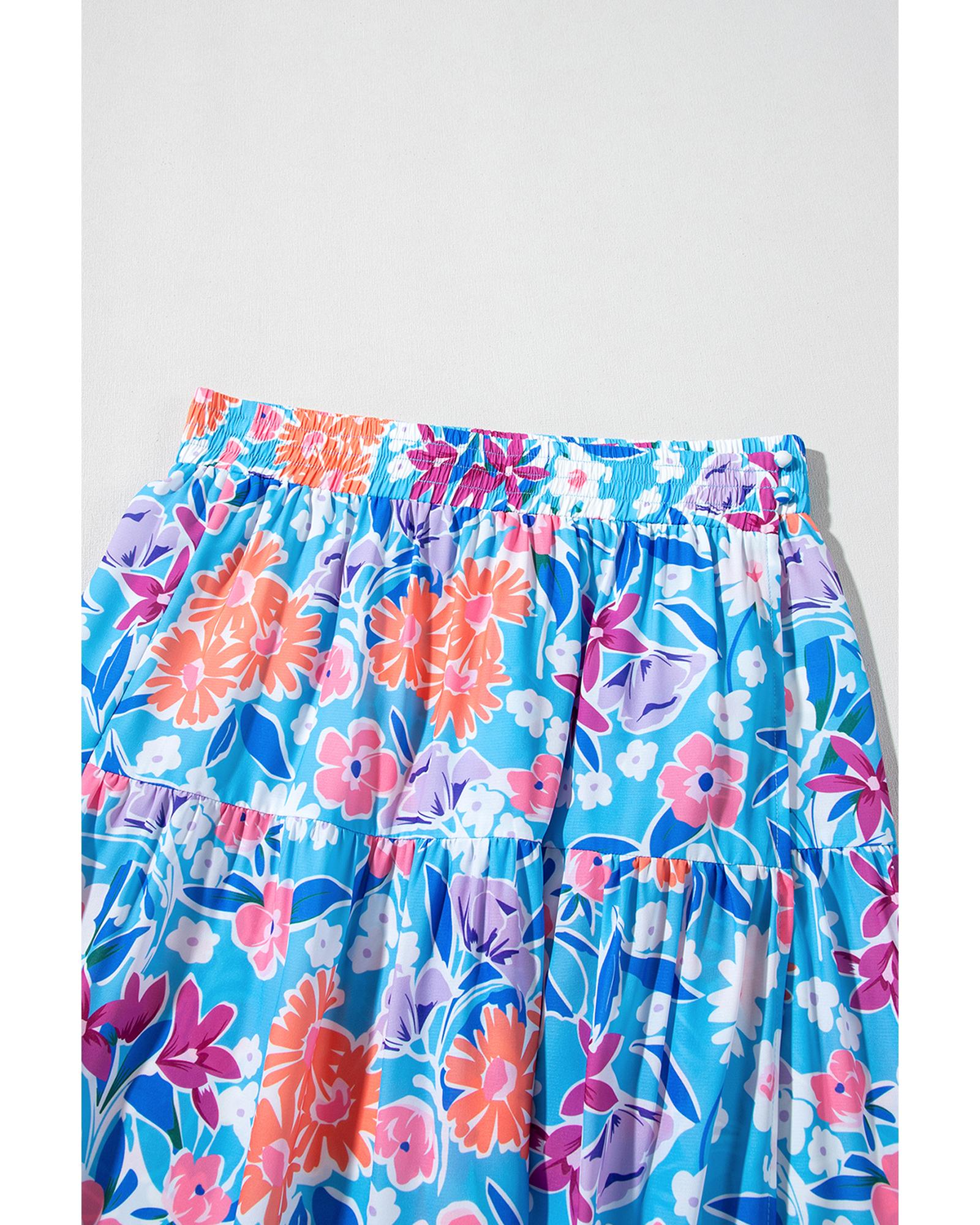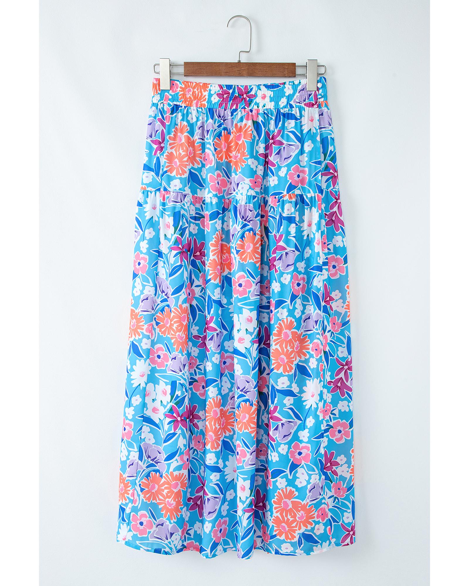 - Sky Blue Floral Printed High Waist Split Wrap Long Skirt