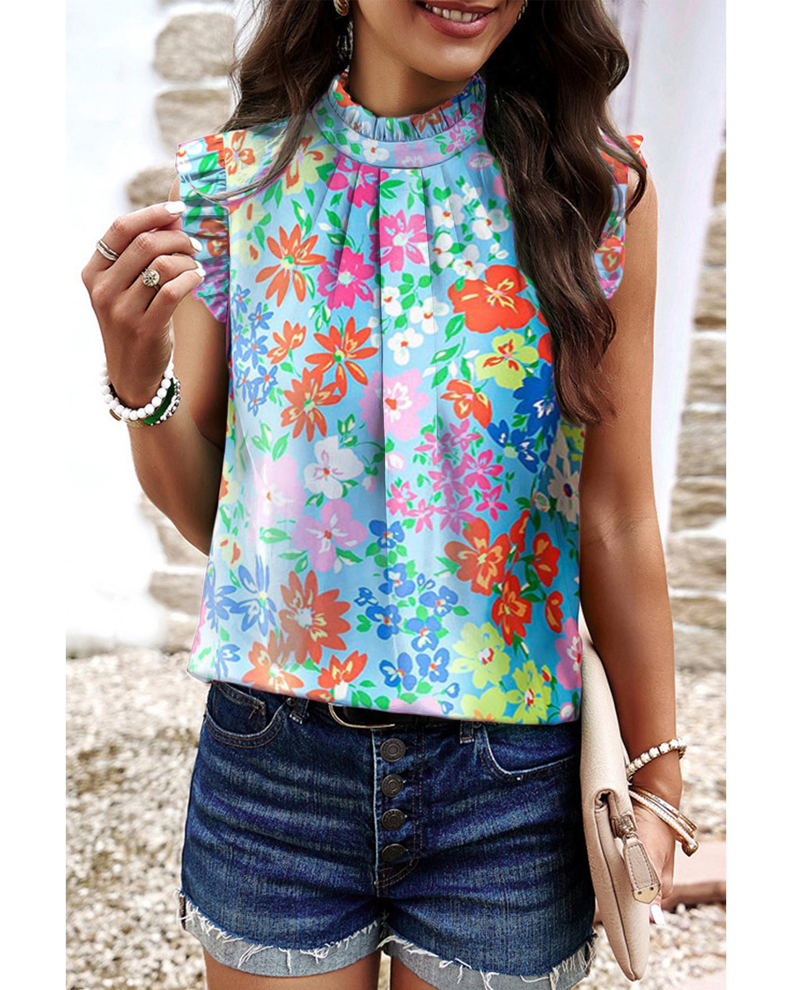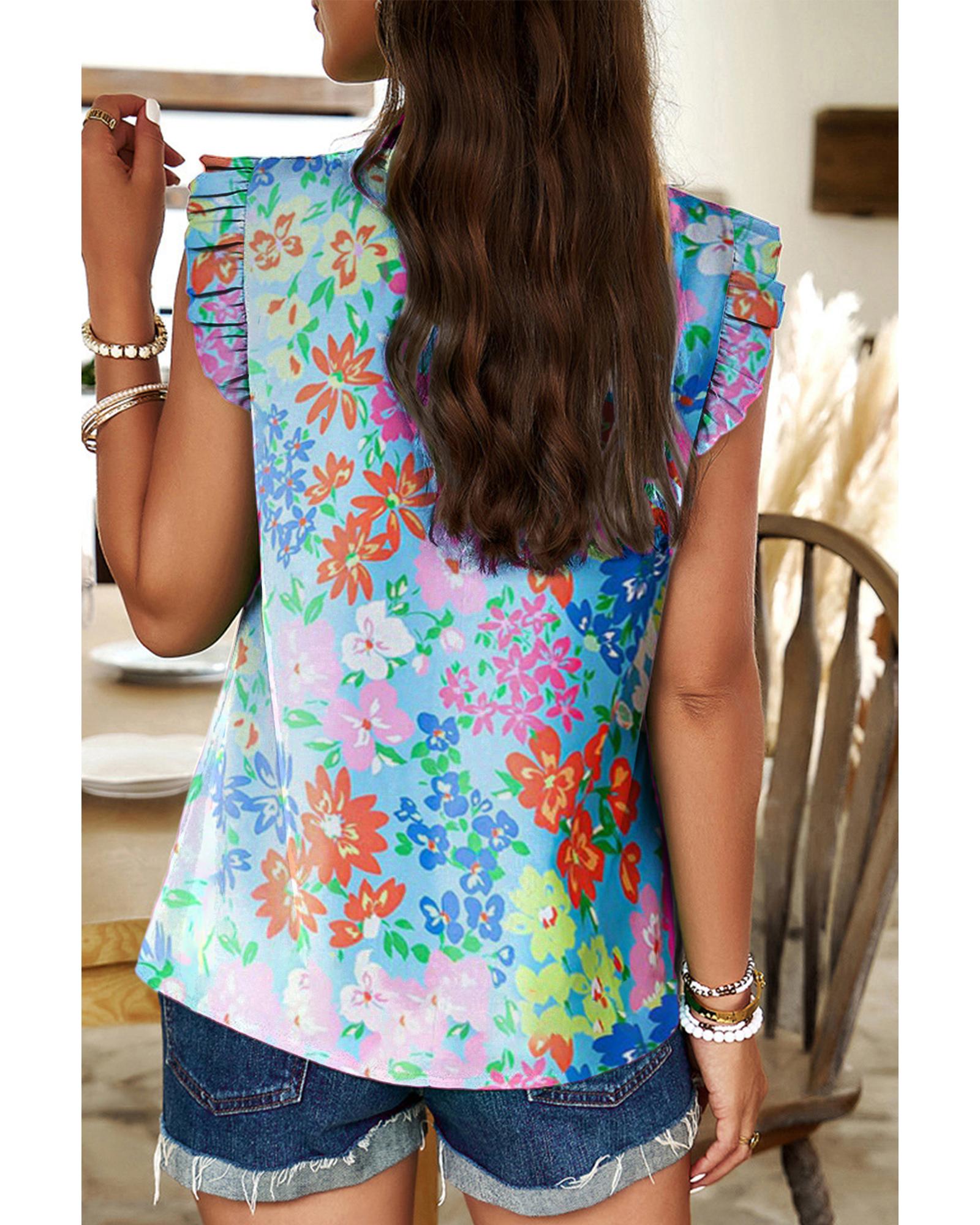 Blue Floral Print Notched V Neck Puff Sleeve Blouse - M