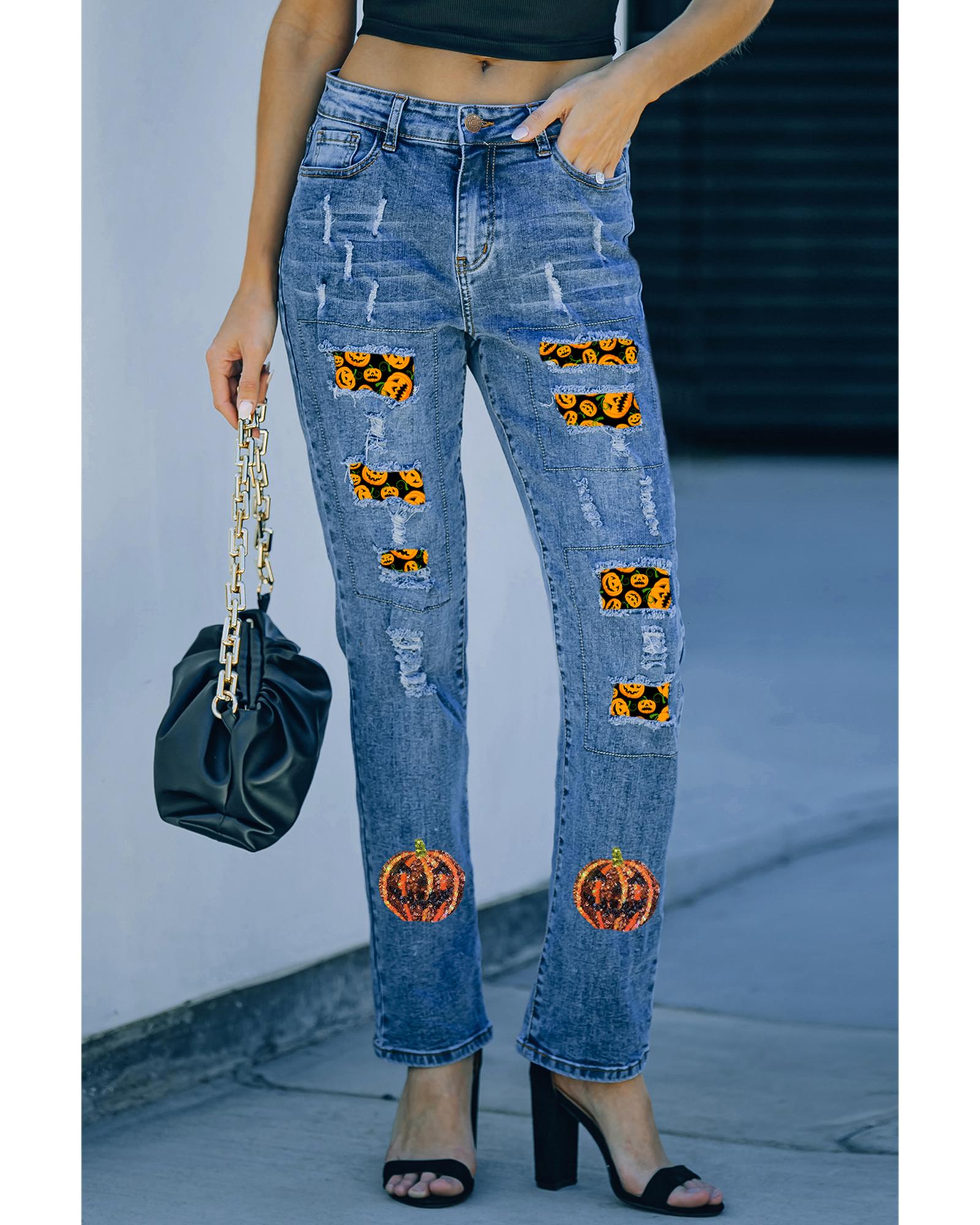 - Sky Blue Halloween Pumpkin Patchwork Distressed Straight Leg Jeans