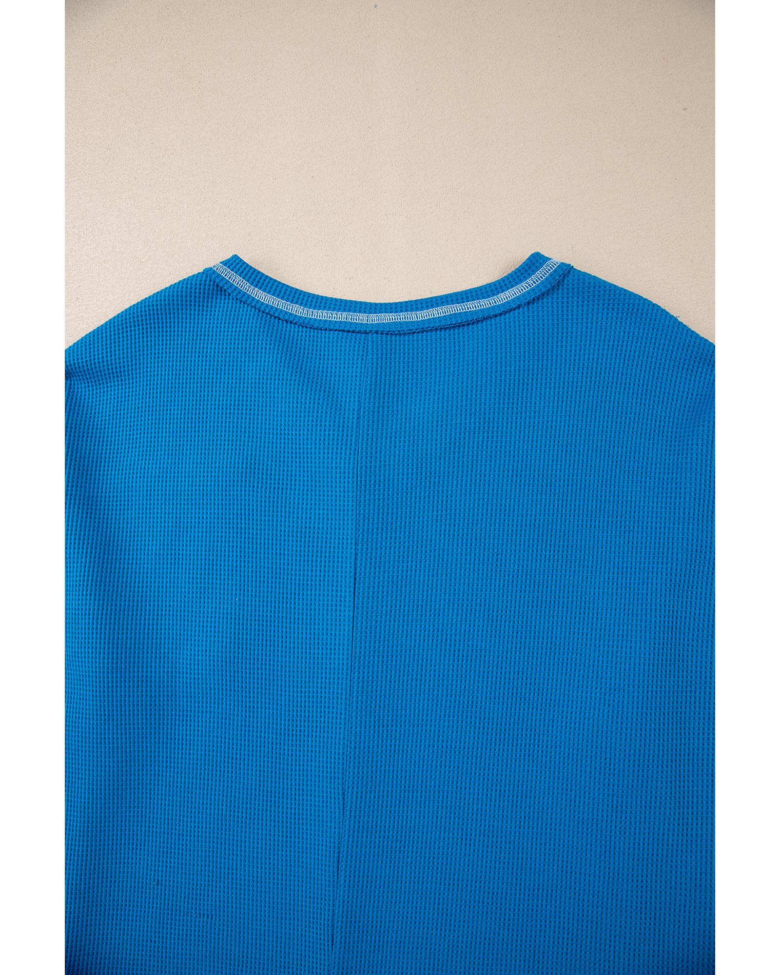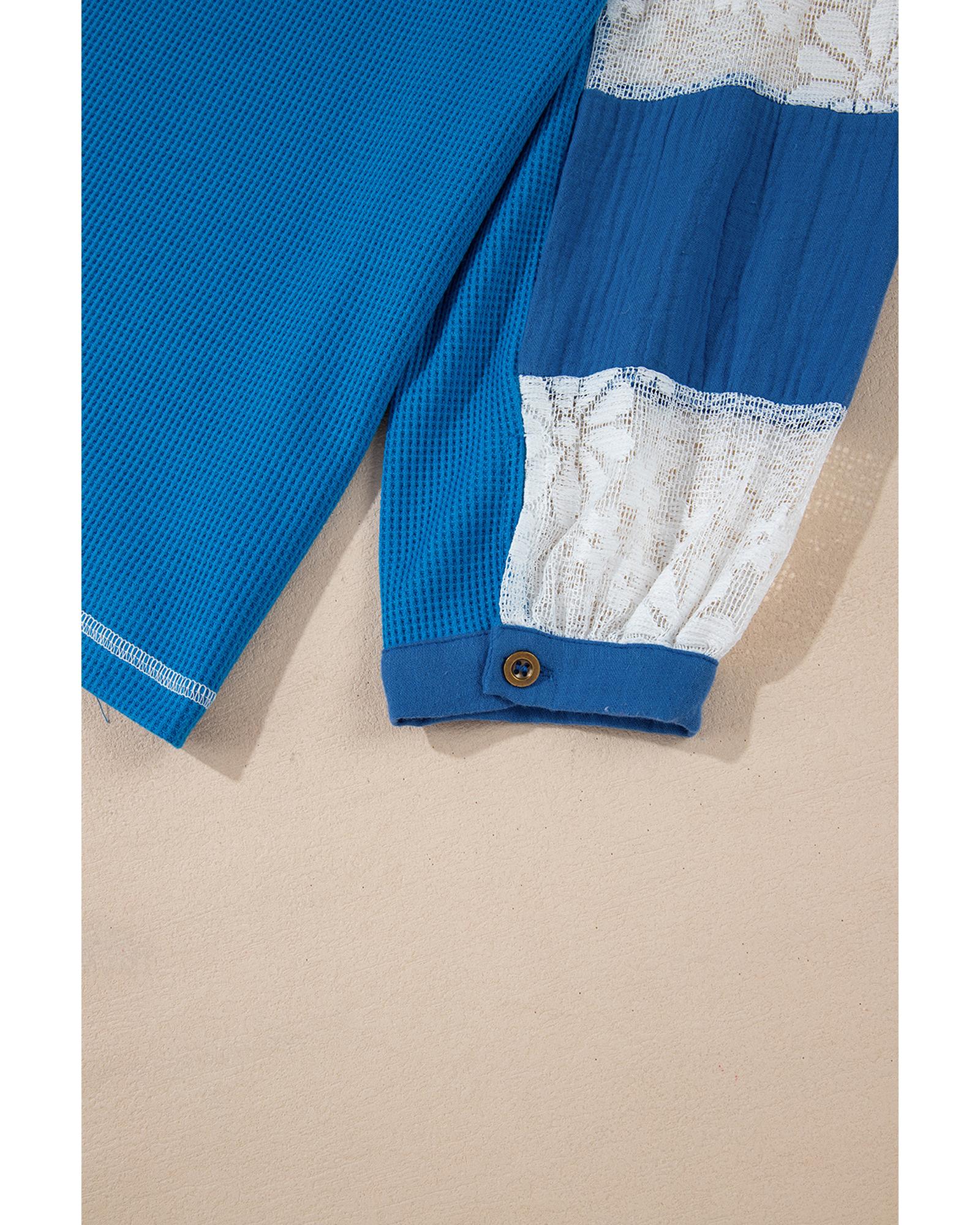 Sky Blue Lace Floral Patchwork Sleeve Stitching V Neck Rib Knit Blouse – L