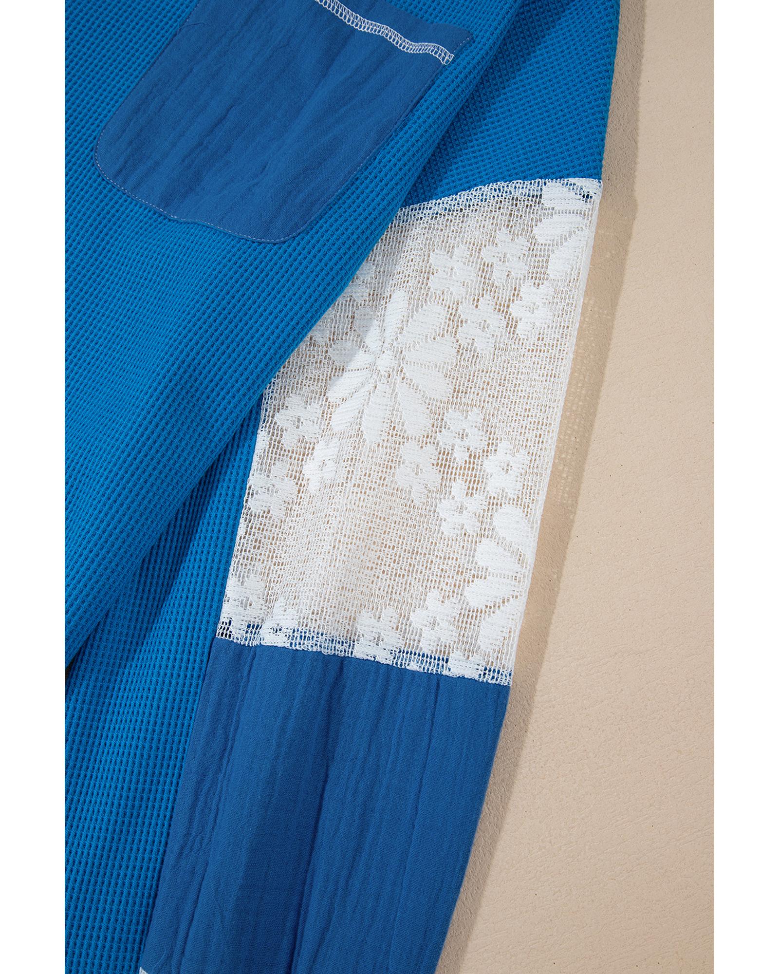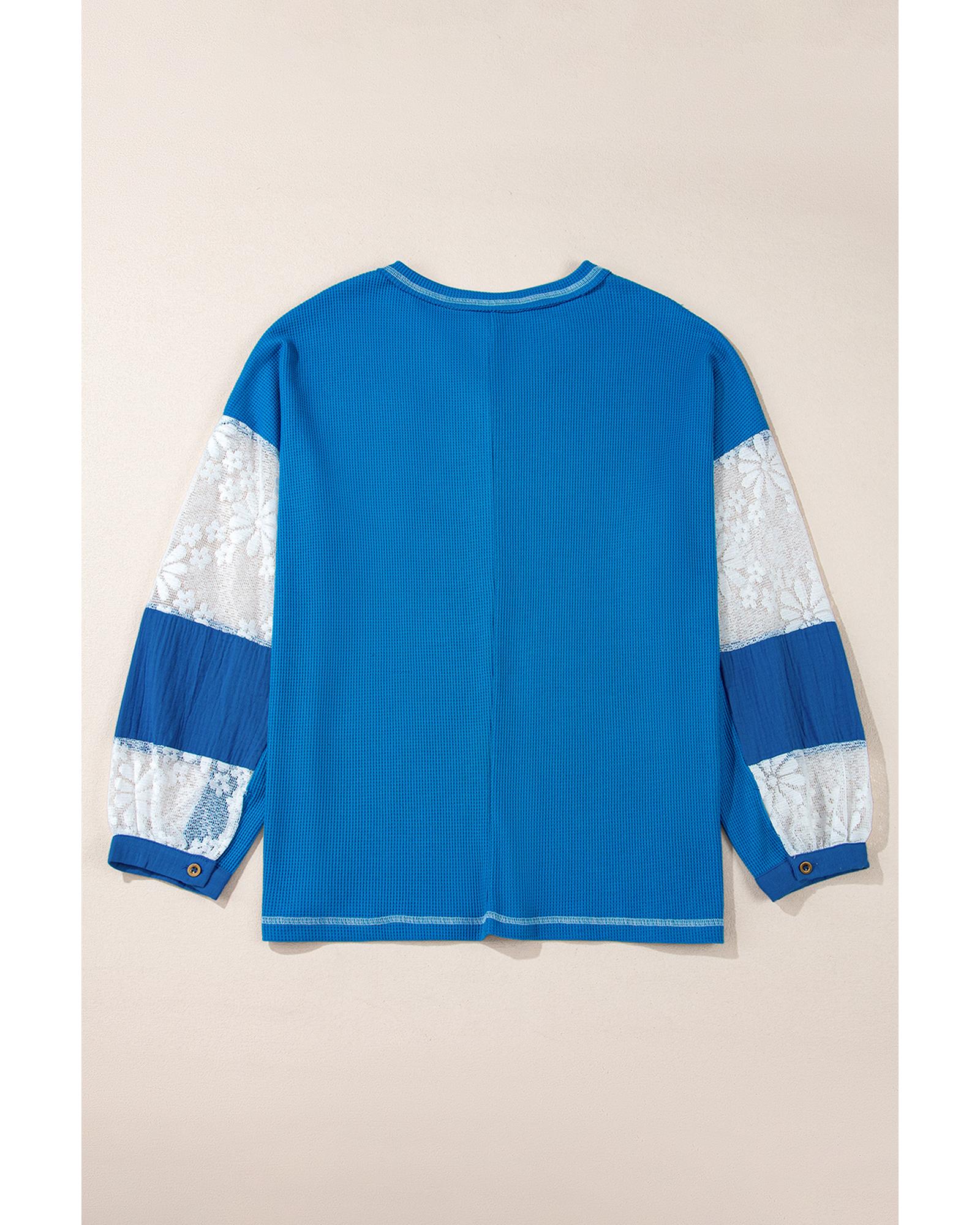 Sky Blue Lace Floral Patchwork Sleeve Stitching V Neck Rib Knit Blouse – S