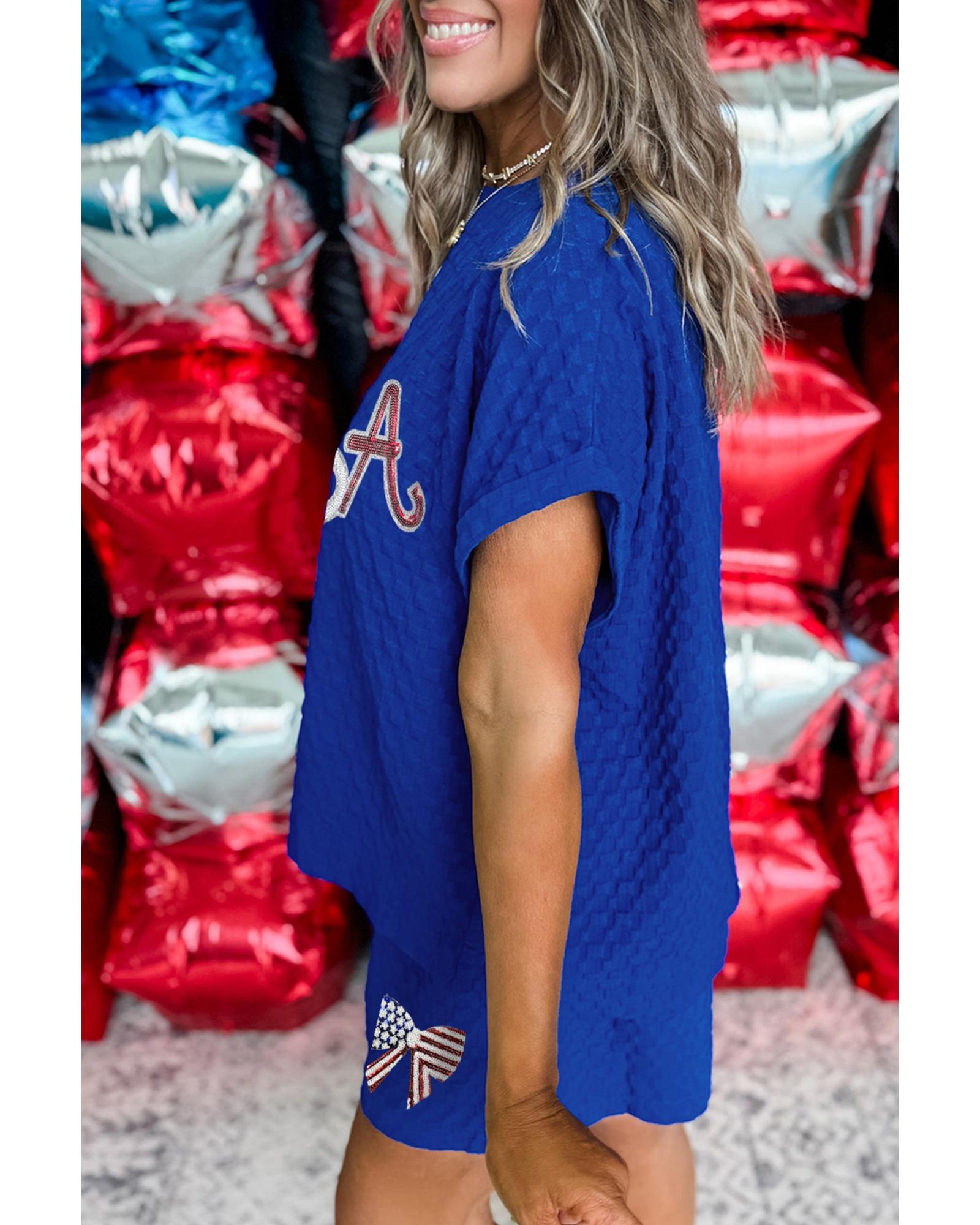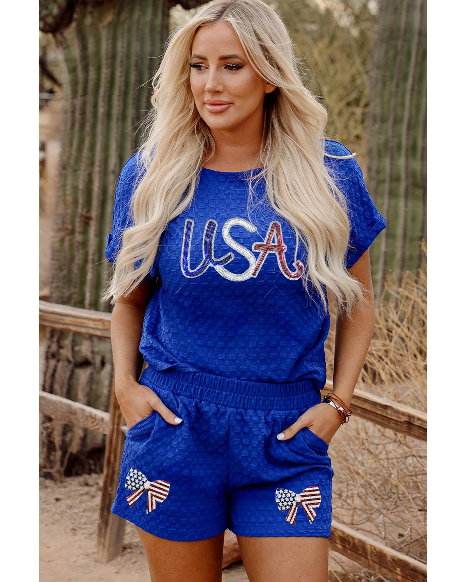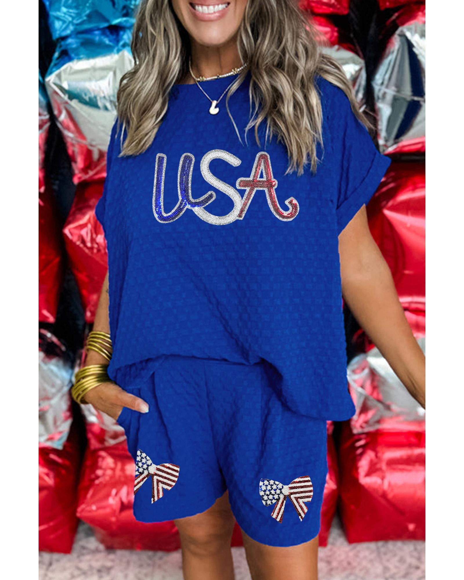 Sky Blue Sequined USA Bowknot Buttoned Back Textured Short Set – XL