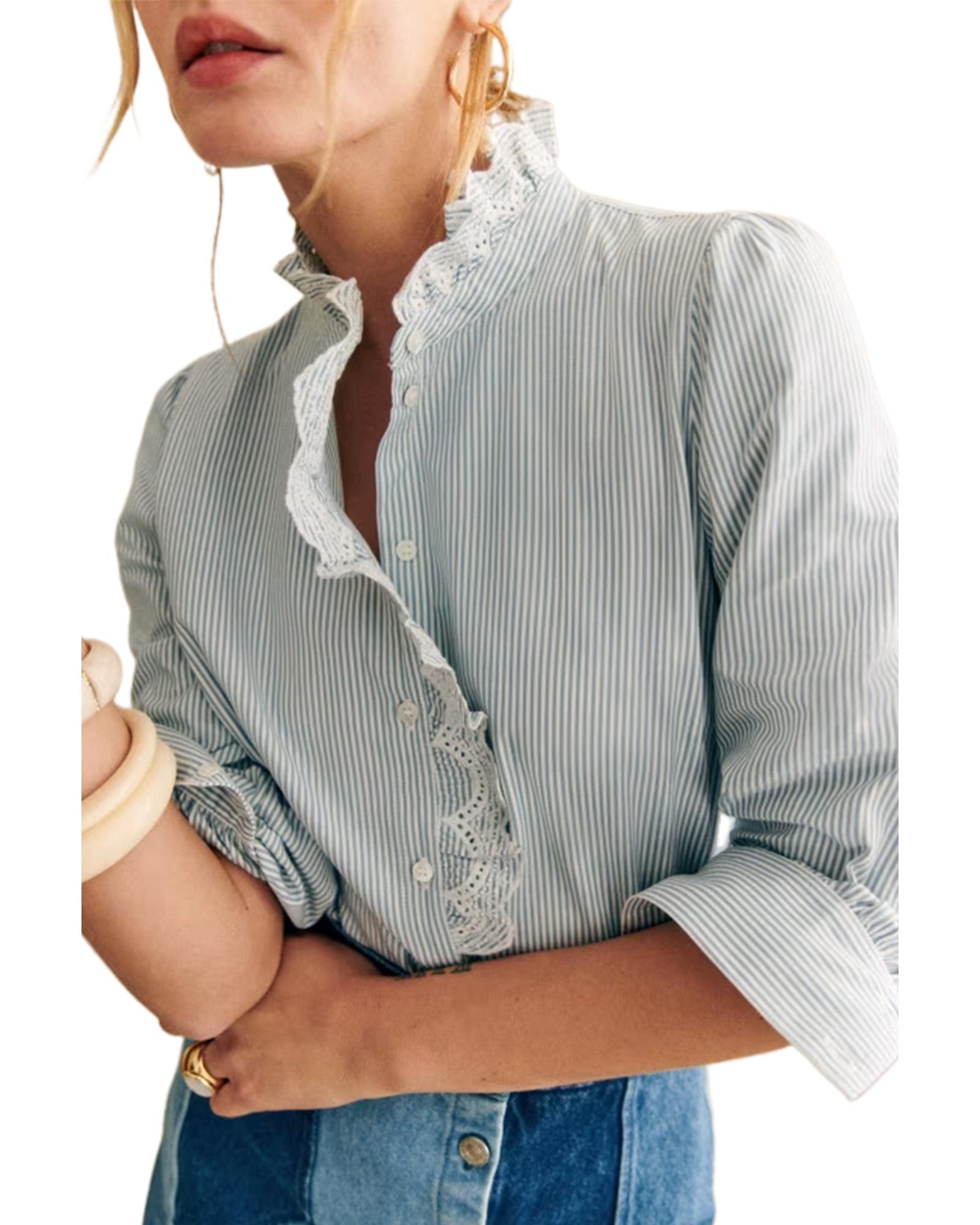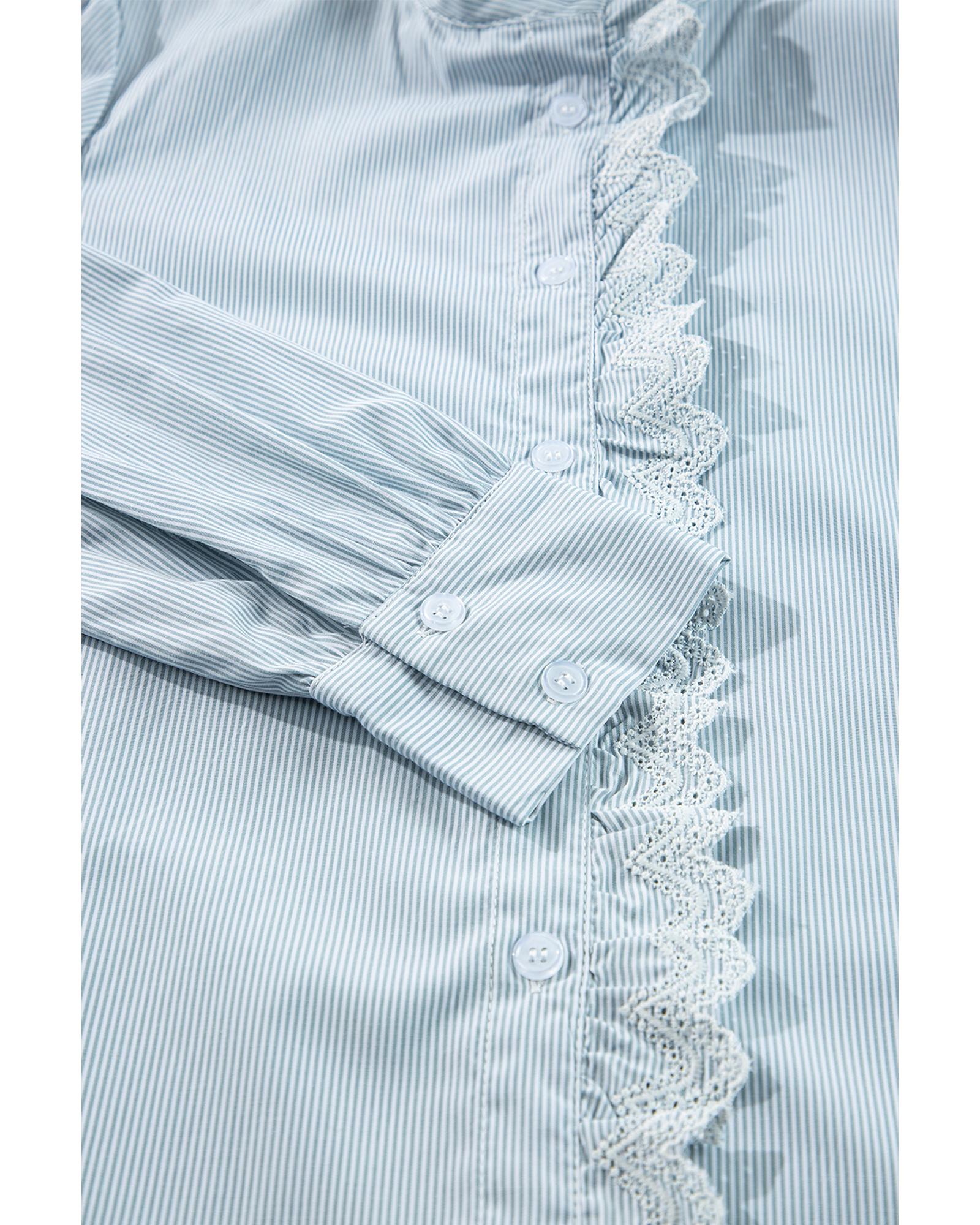 Sky Blue Stripe Frilled Trim Button Up Long Sleeve Shirt – XL