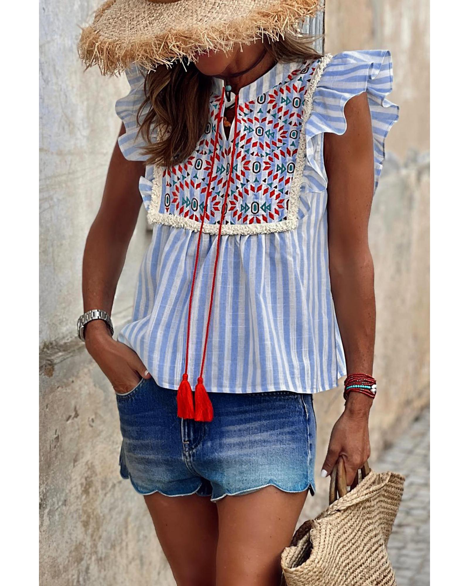 - Sky Blue Stripe Geo Pattern Embroidered Tassel Flutter Blouse