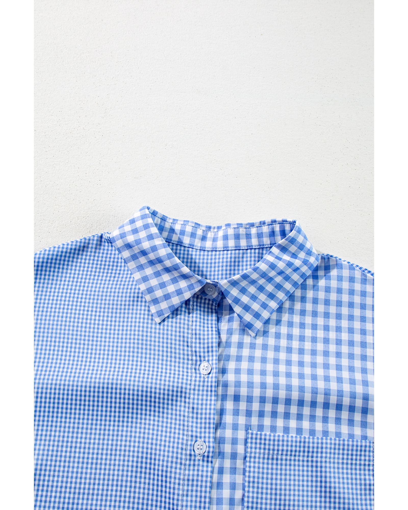 Sky Blue Stripe Plaid Patchwork Button up Long Sleeve Shirt – L