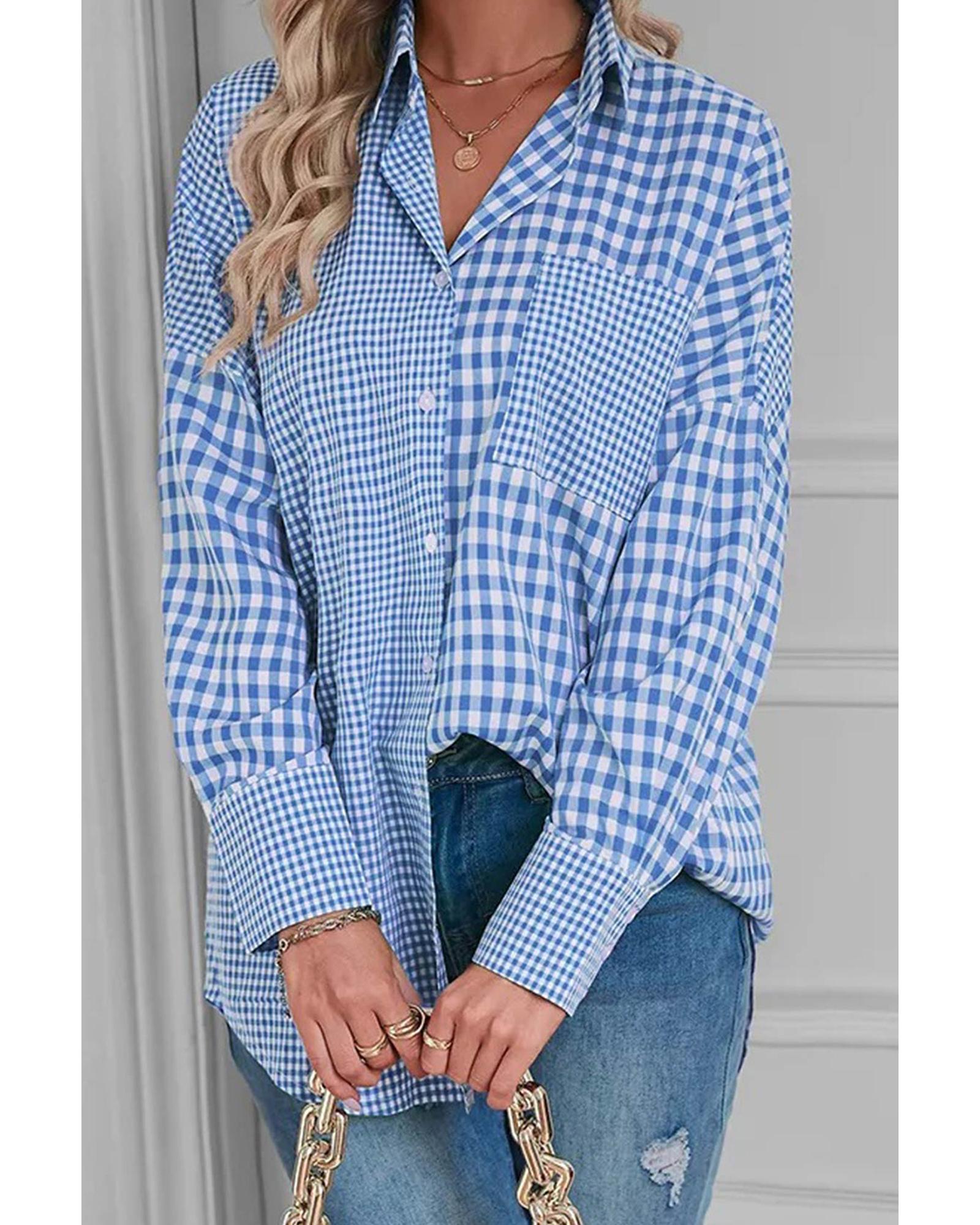 Sky Blue Stripe Plaid Patchwork Button up Long Sleeve Shirt – M