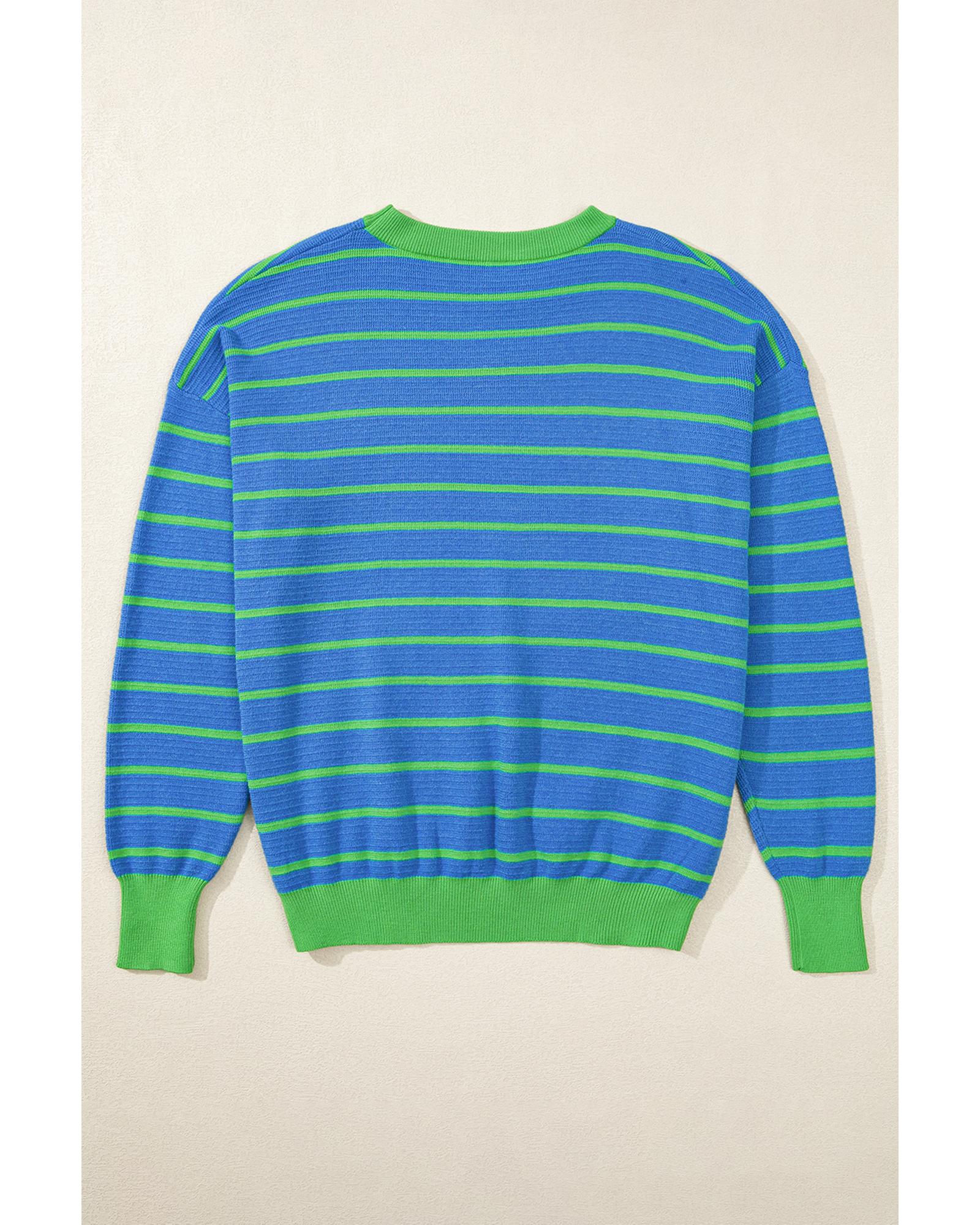 Sky Blue Stripe Trimmed Round Neck Drop Shoulder Loose Sweater – L