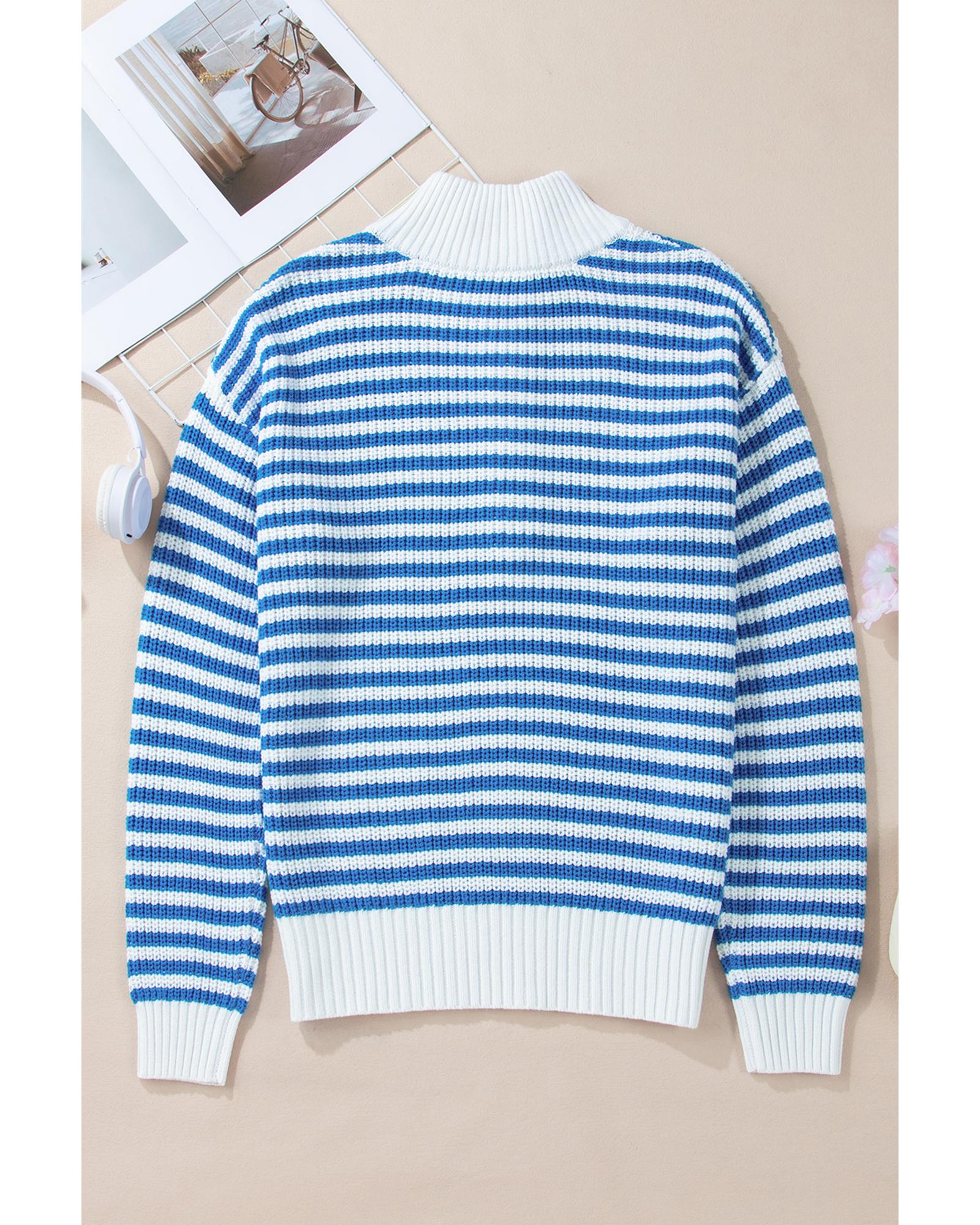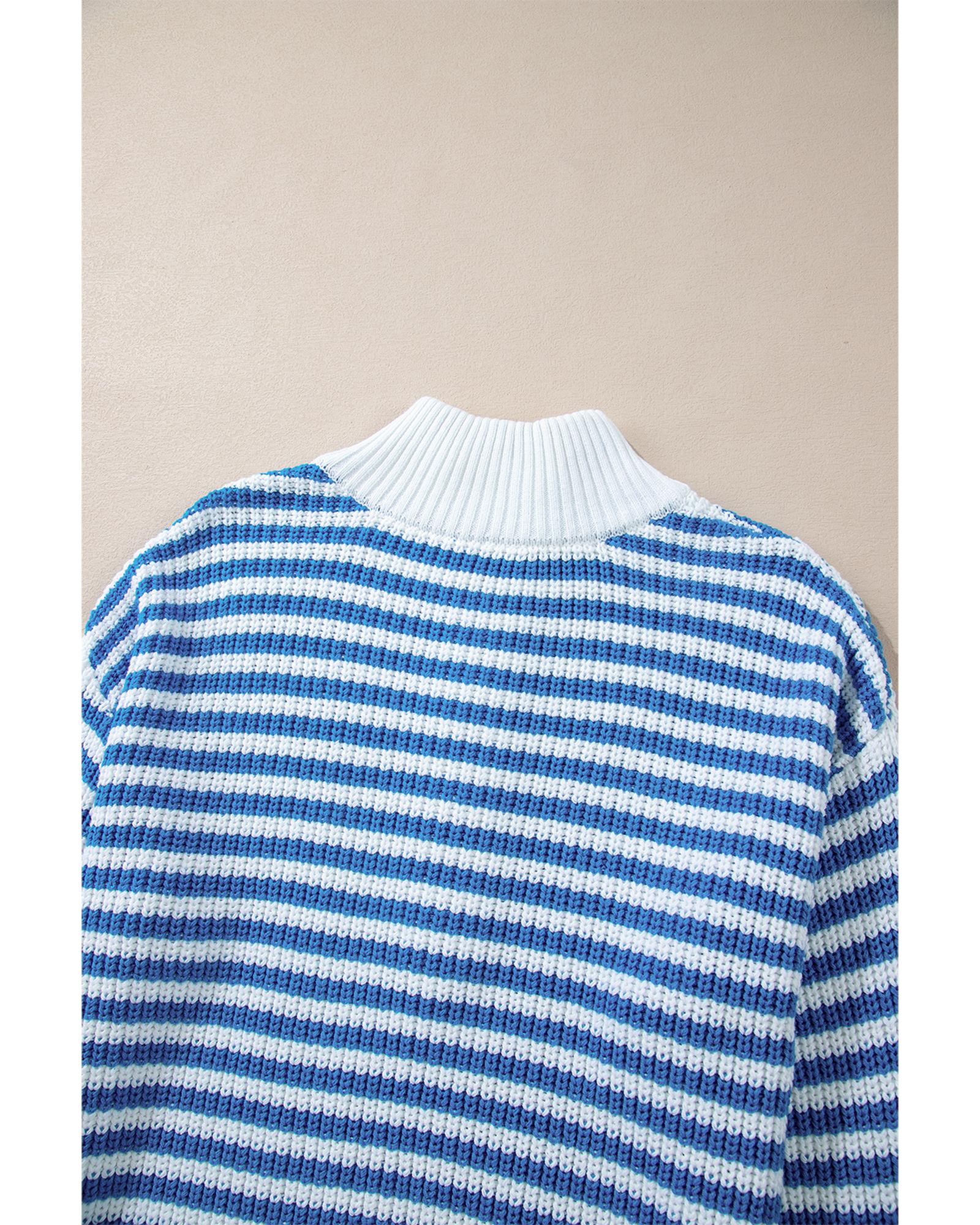 • Sky Blue Stripe Zip up Collar Drop Shoulder Sweater