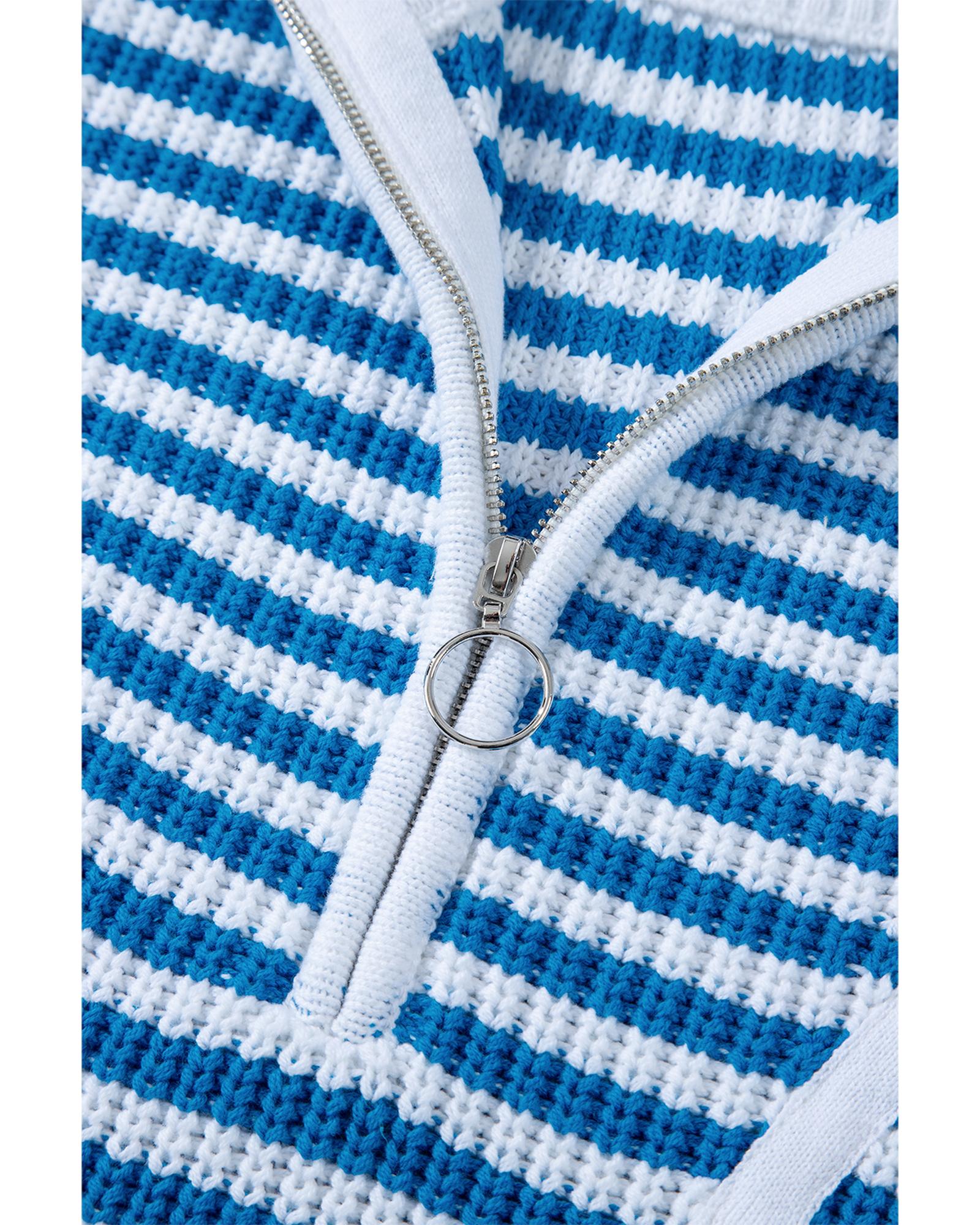 - Sky Blue Stripe Zip up Collar Drop Shoulder Sweater