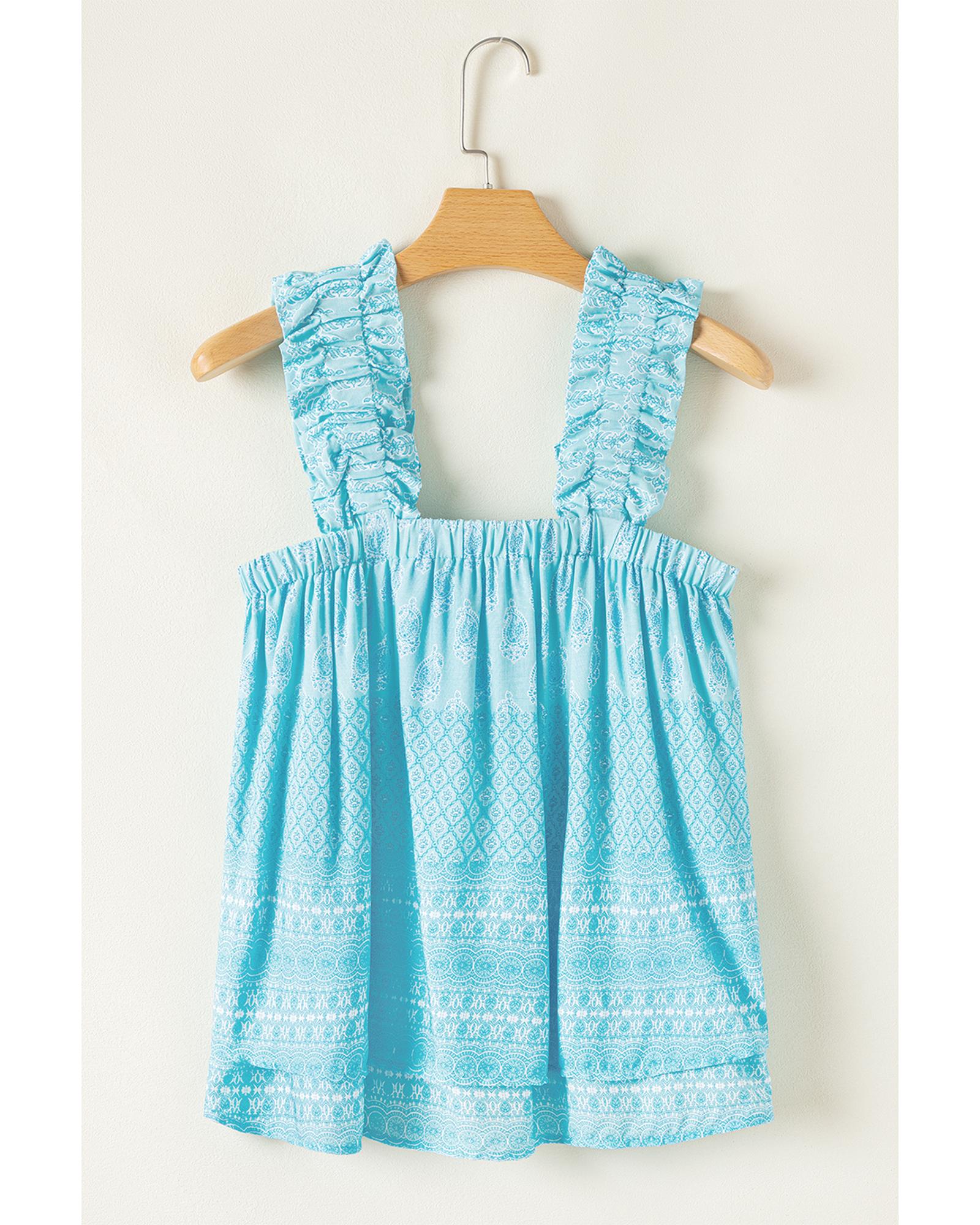 Sky Blue Tribal Pattern Print Ruffled Wide Straps Loose Tank Top – S