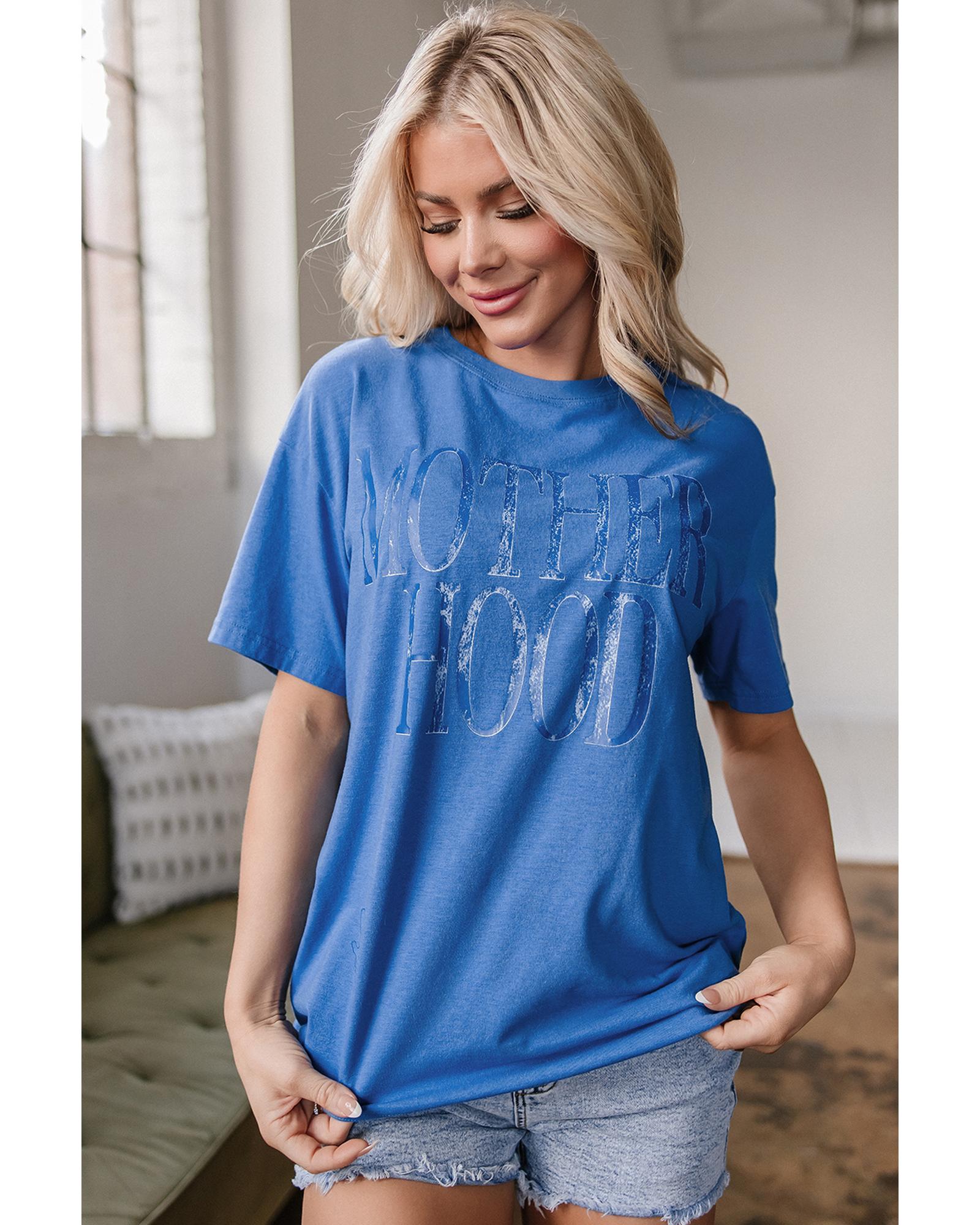 - Sky Blue Vintage MOTHERHOOD Letter Graphic T